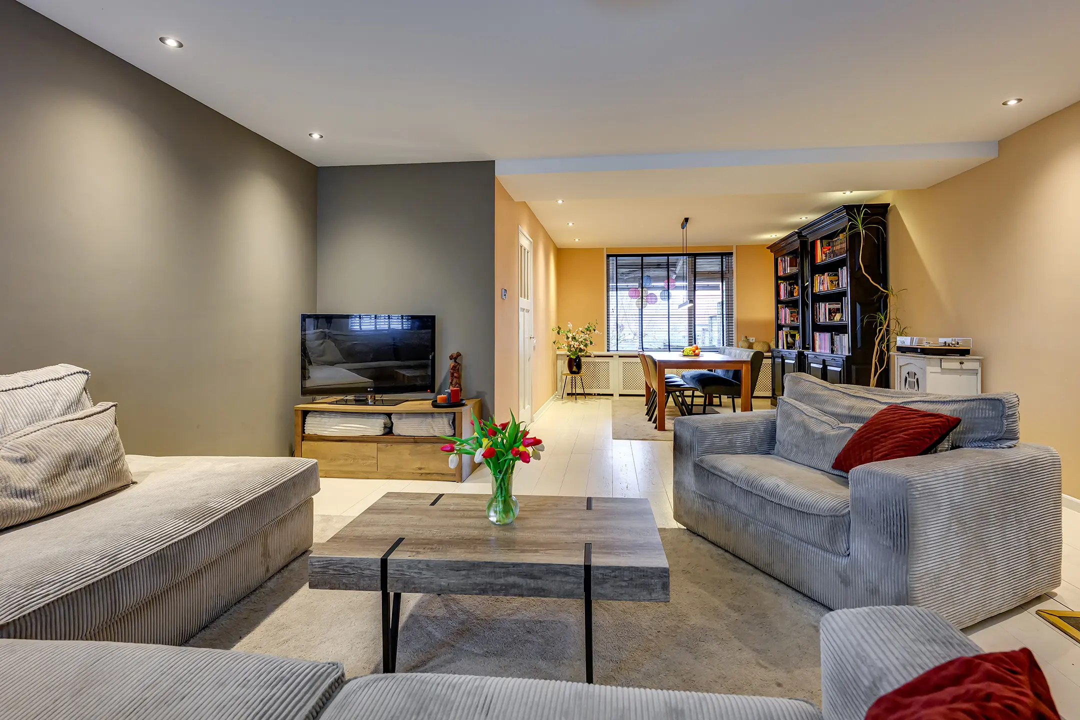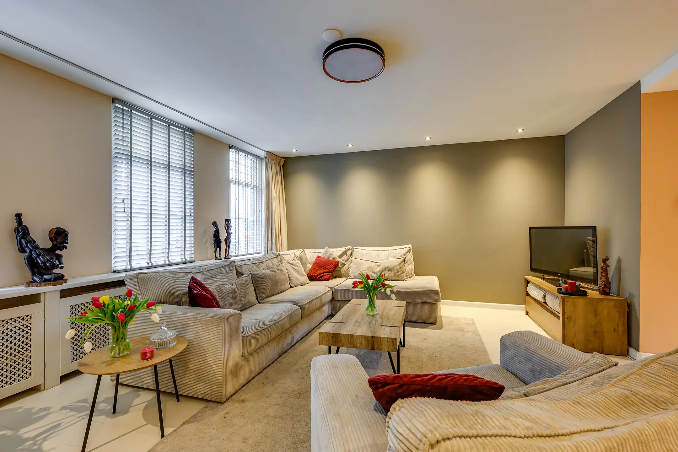 * gerenoveerde woonkamer met verlaagd plafond en inbouwspots