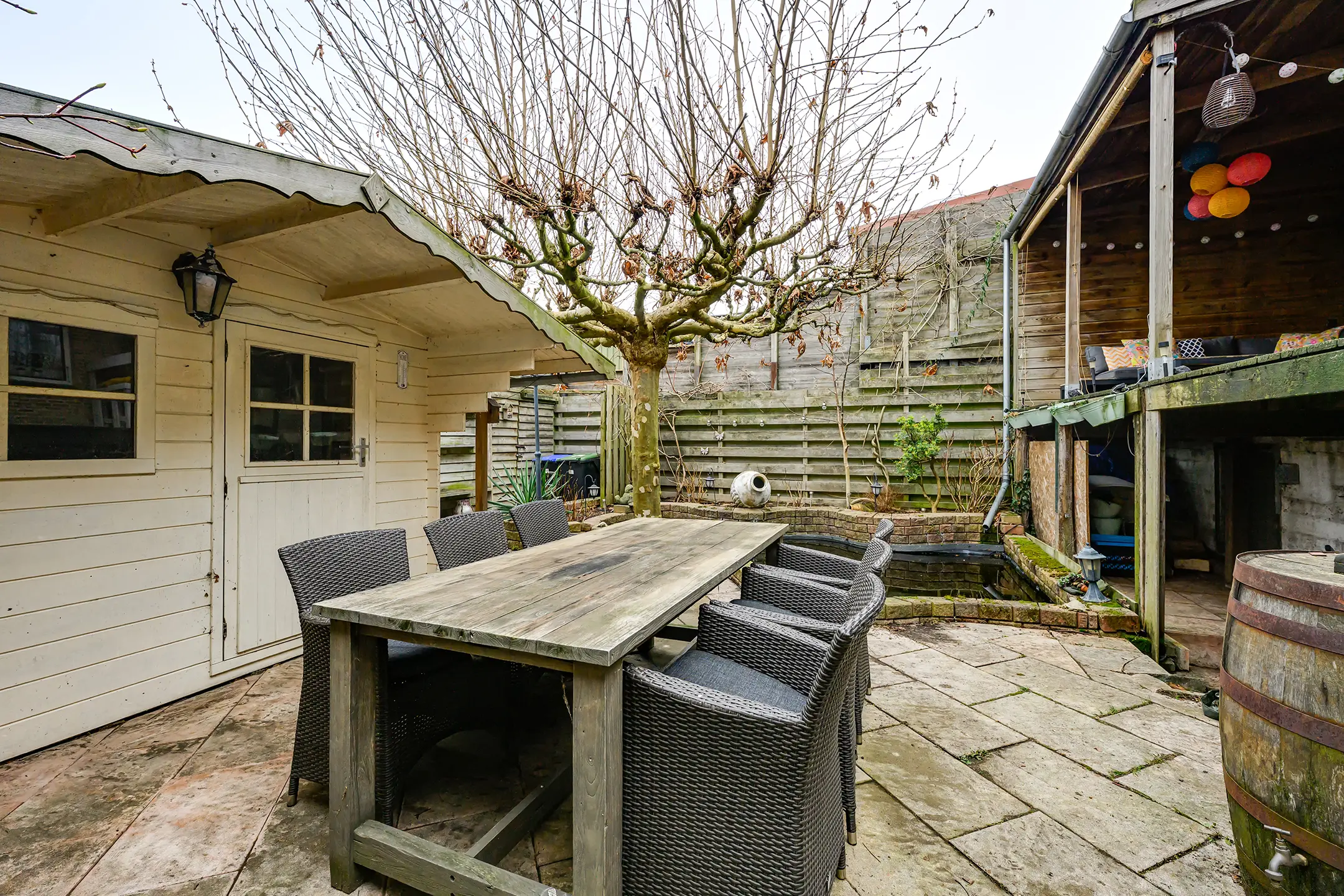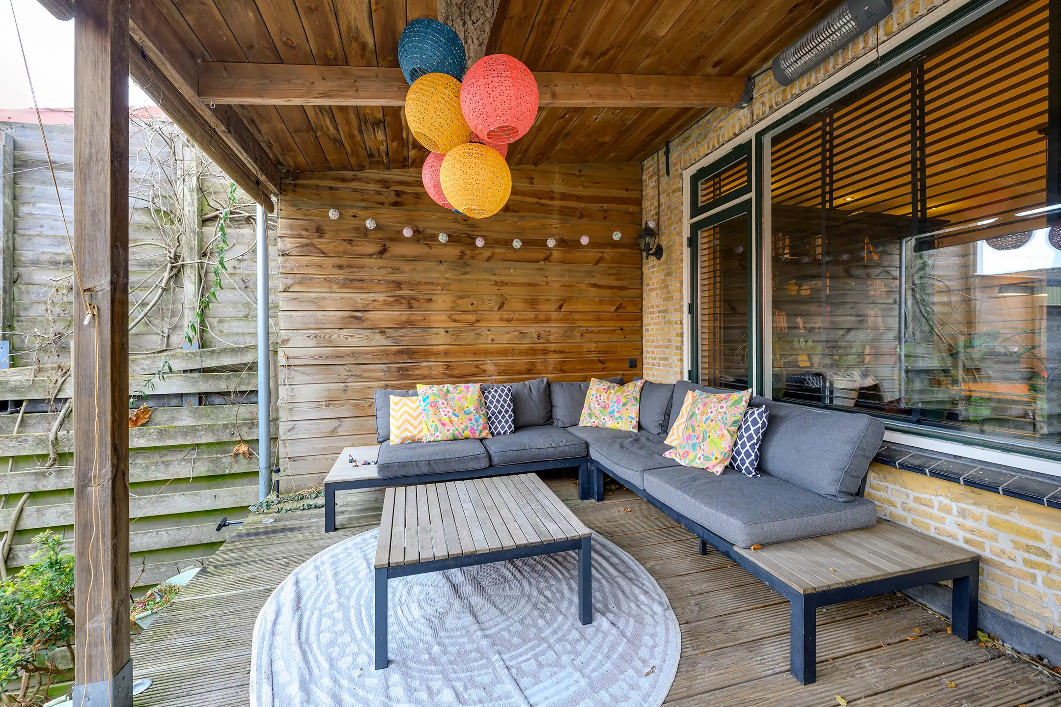 De tuin is een klein paradijs op zich. In de zomer zit je heerlijk onder de grote plataan die precies de juiste hoeveelheid schaduw biedt — perfect voor lange barbecue-avonden. Liever in de zon? Op het boventerras kun je vanaf vroeg in de middag tot laat in de avond genieten van warmte en uitzicht.