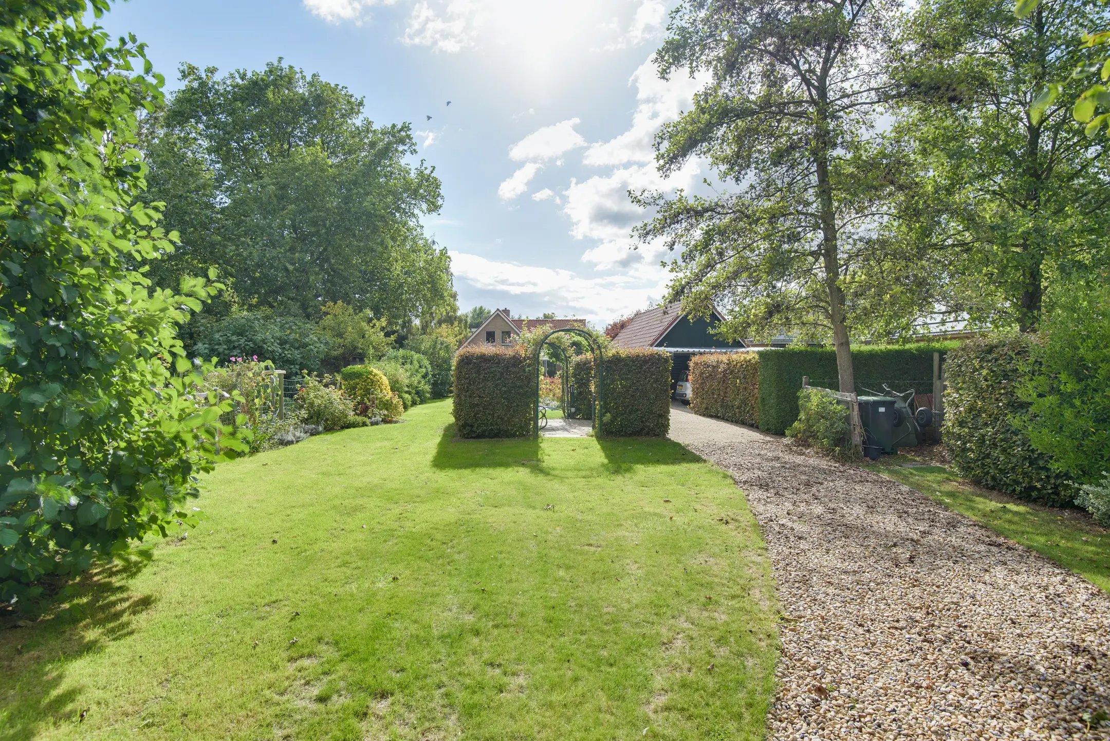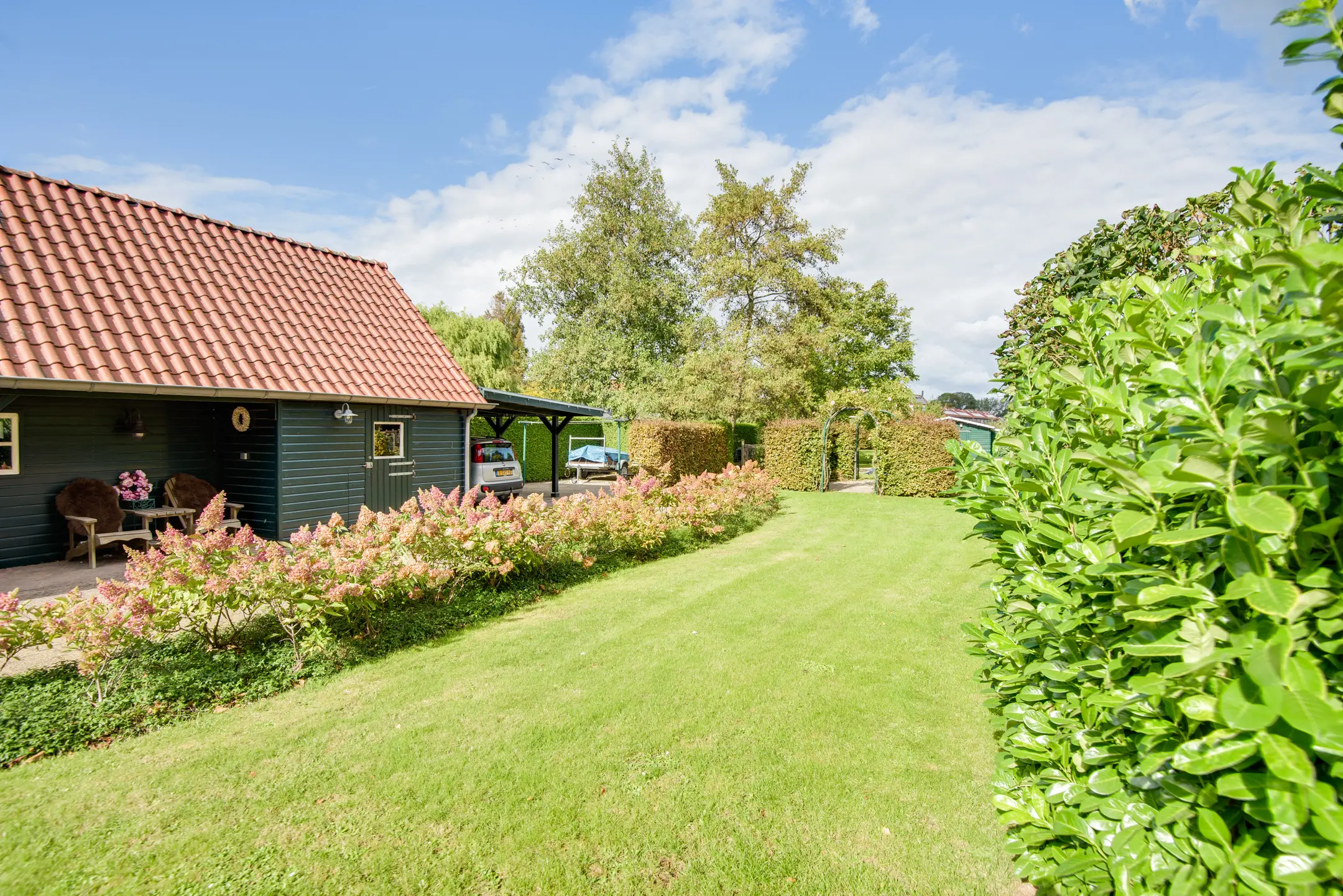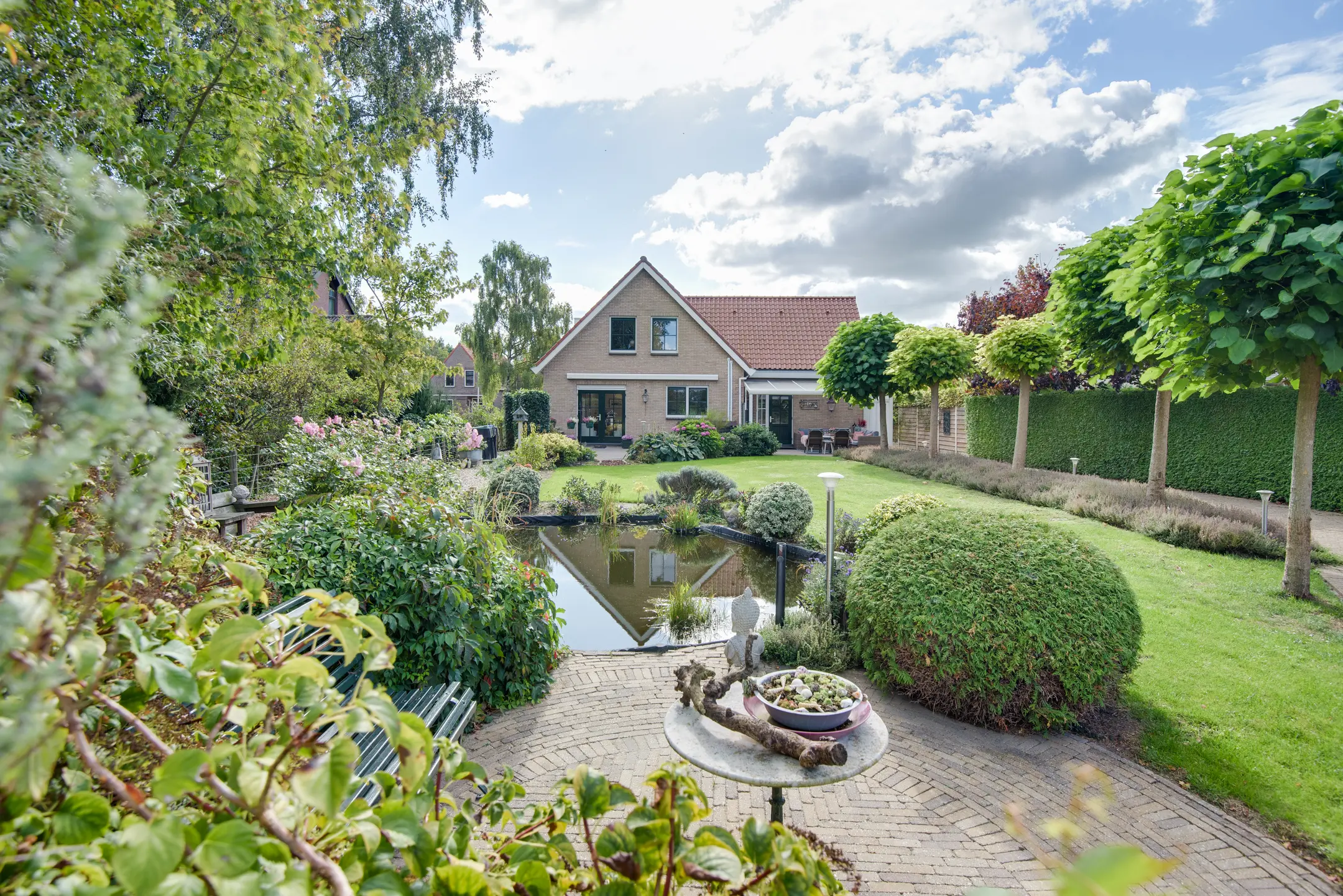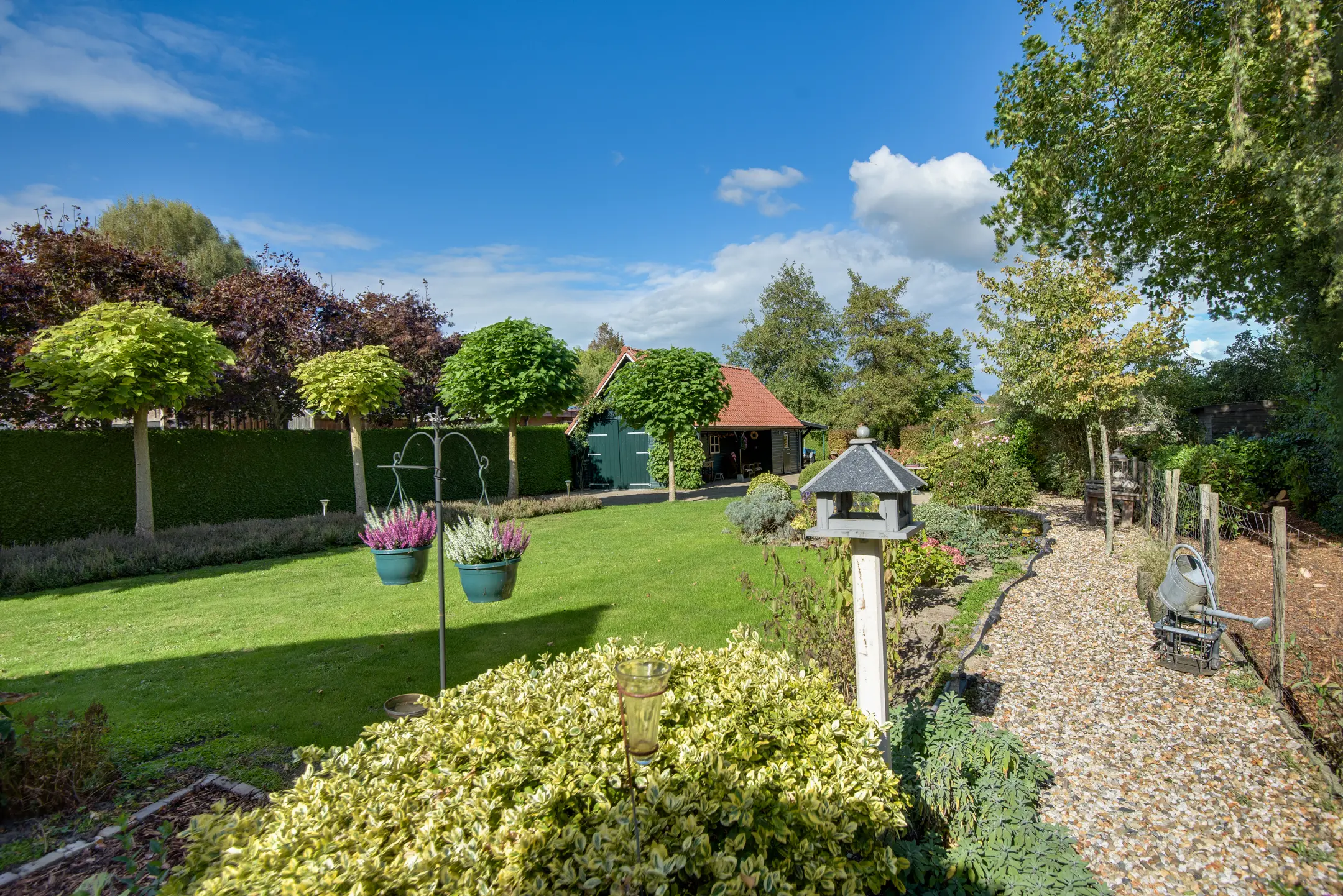 De achtertuin is een absolute eyecatcher. Met een lengte van maar liefst 110 m diep (!) geniet je hier van ultieme rust, privacy en natuur. De tuin is prachtig aangelegd met een vijver, sierbeplanting en diverse bomen. Of je nu wilt ontspannen onder de overkapping, tuinieren of wandelen op eigen terrein: dit perceel maakt het mogelijk.