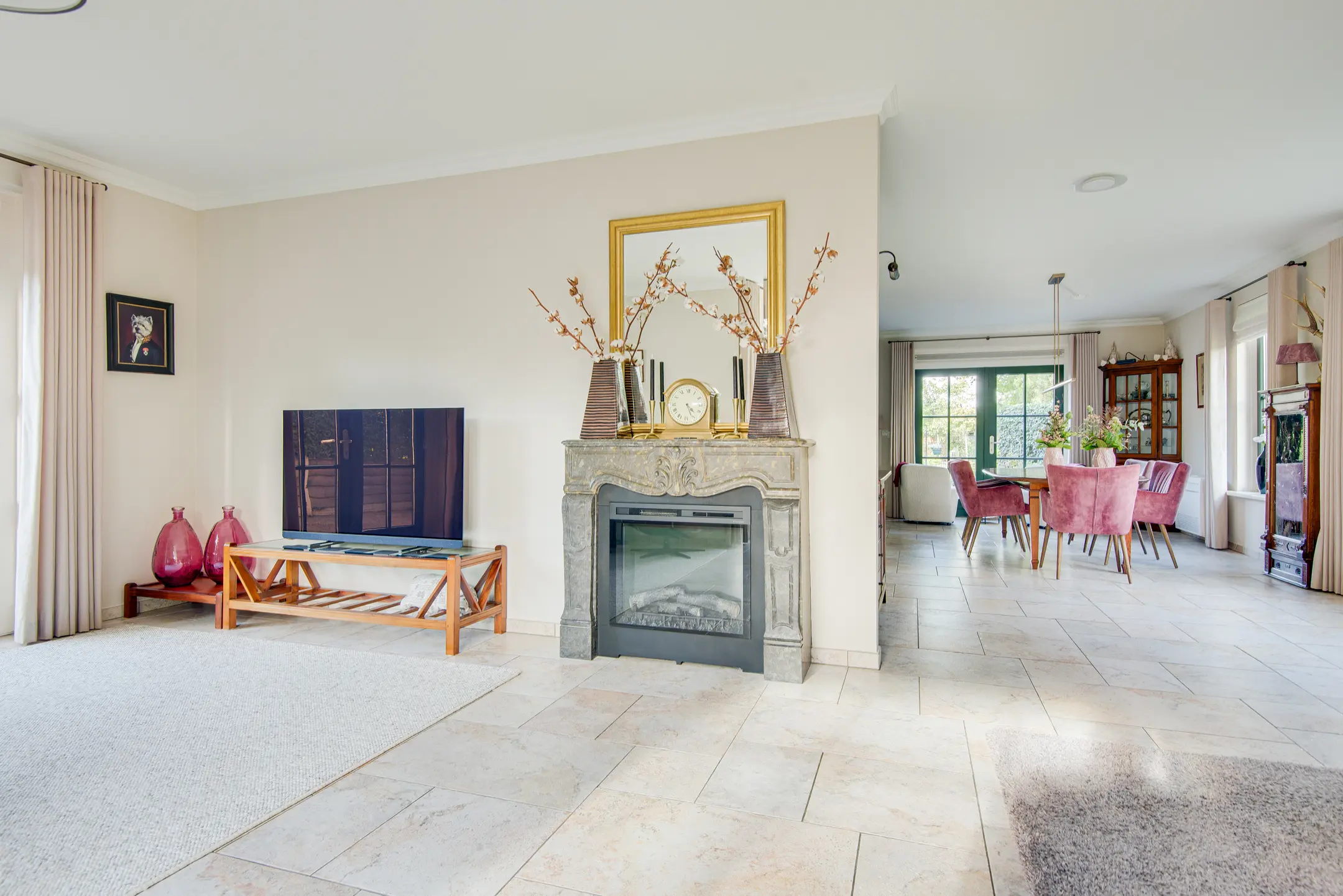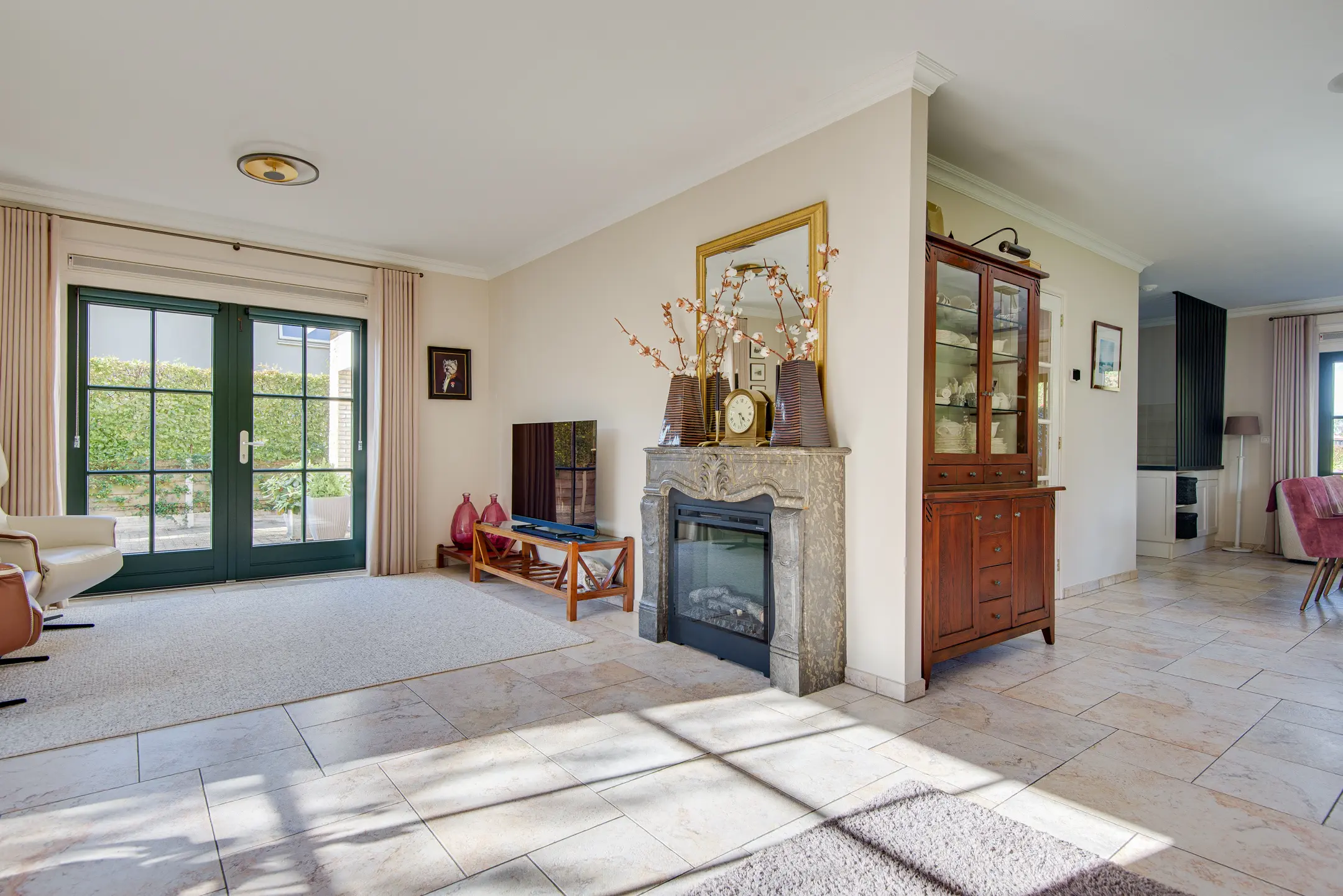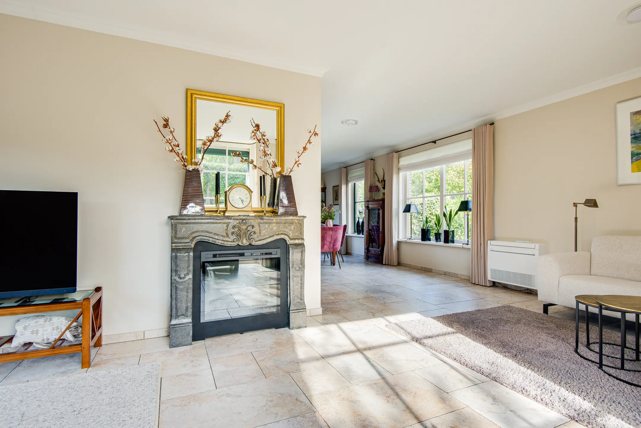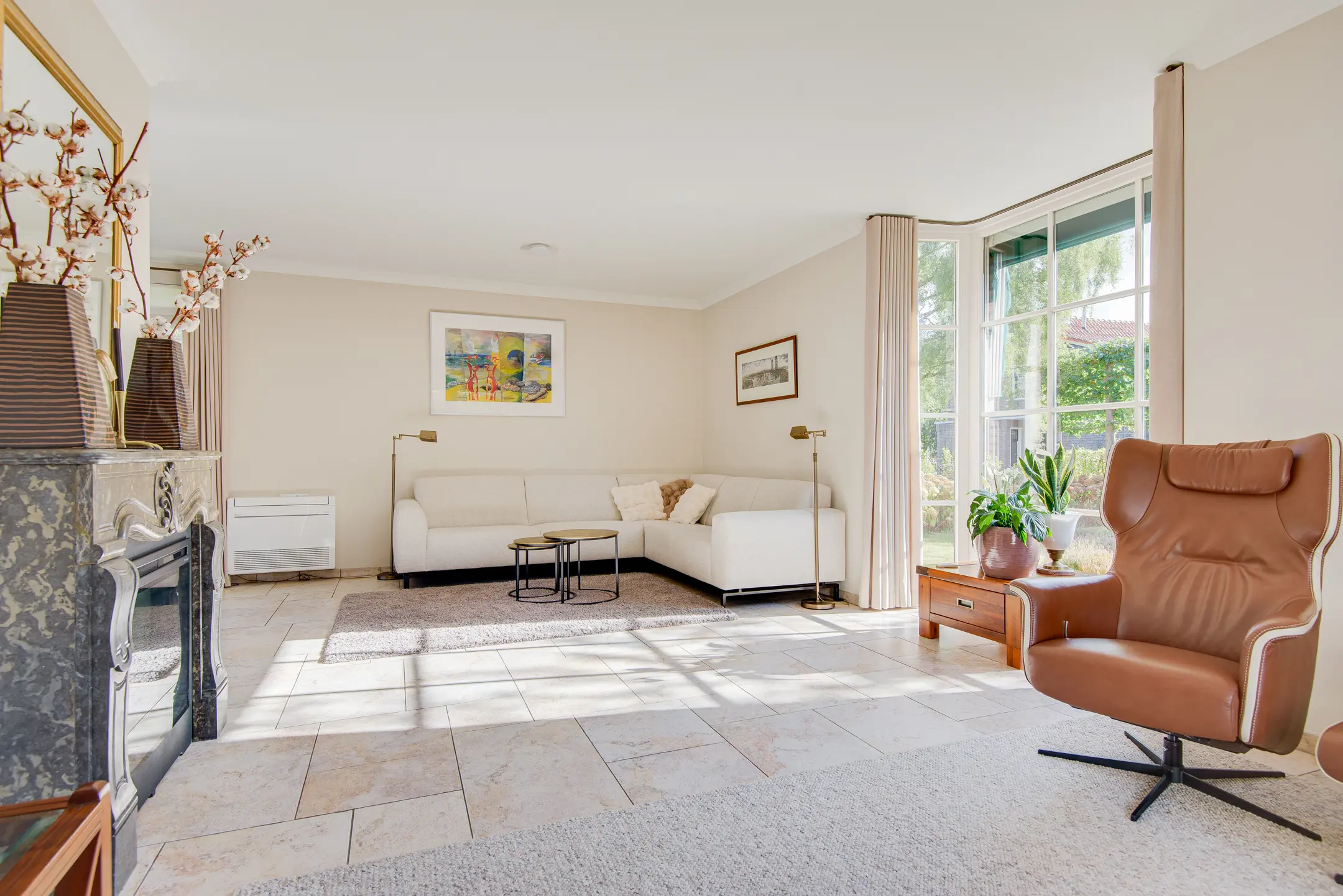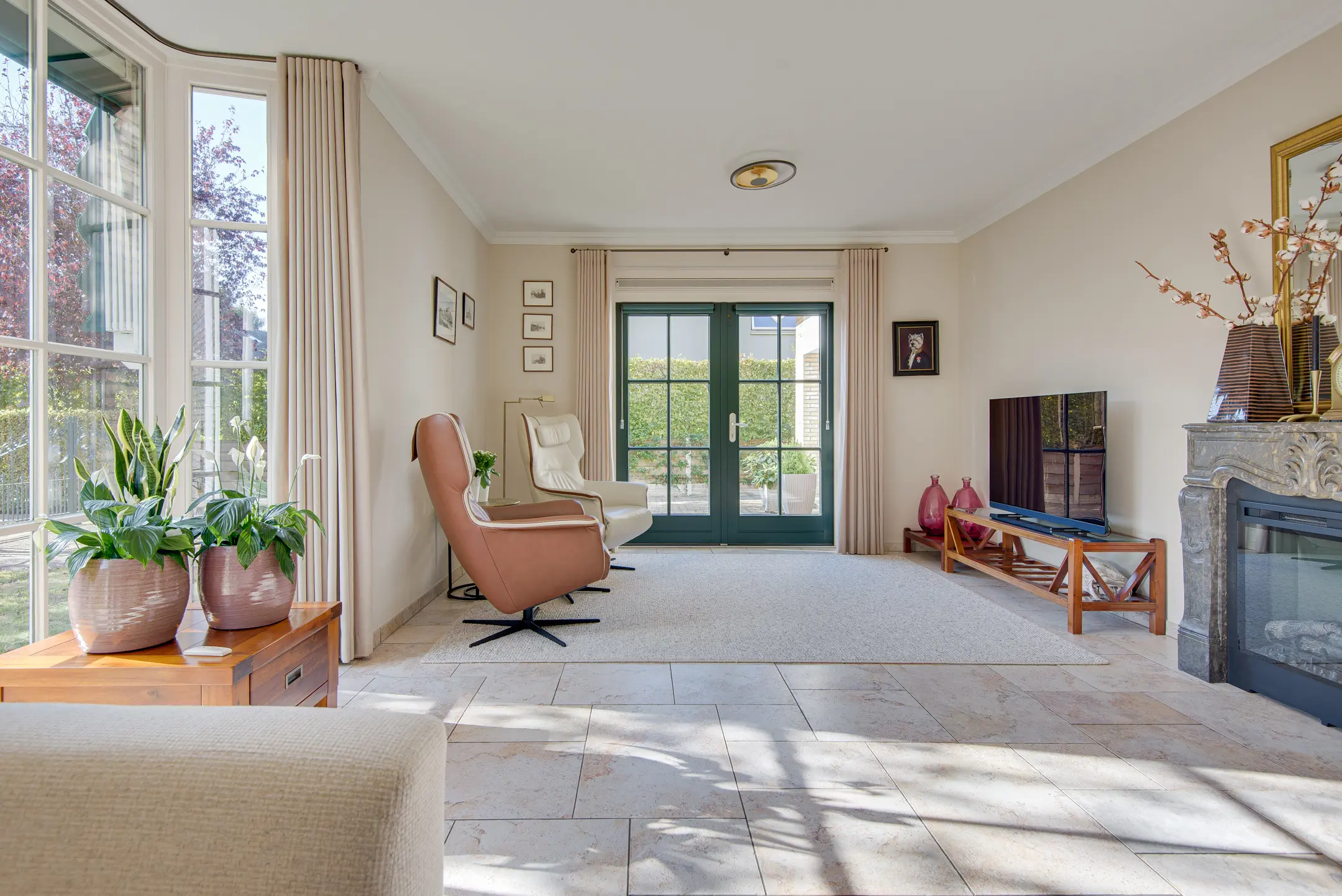 - Riante en lichte woonkamer met erker, schouw met elektrische sierhaard,
