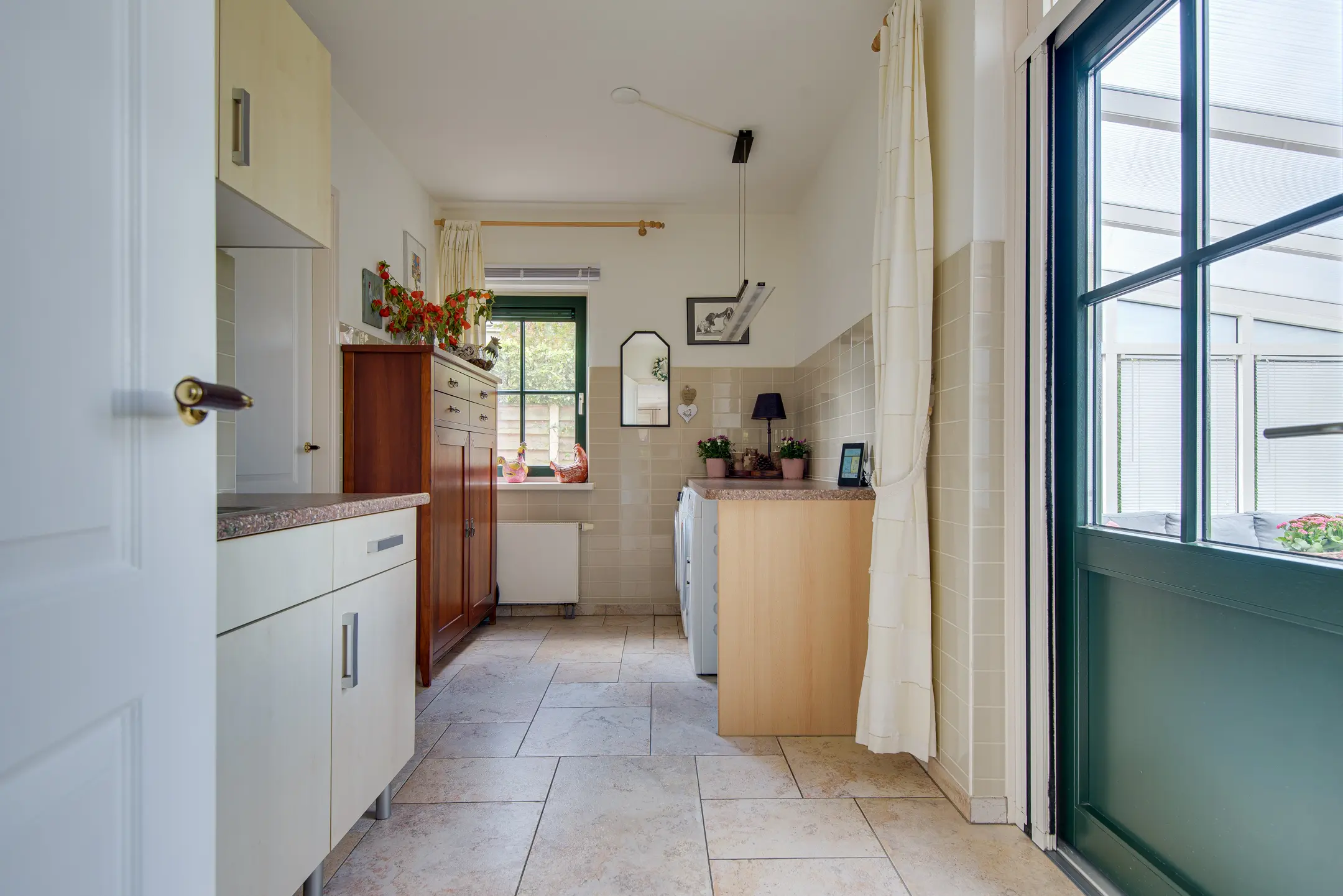 - Bijkeuken voorzien van witgoedaansluiting en deur naar tuin en overkapping
