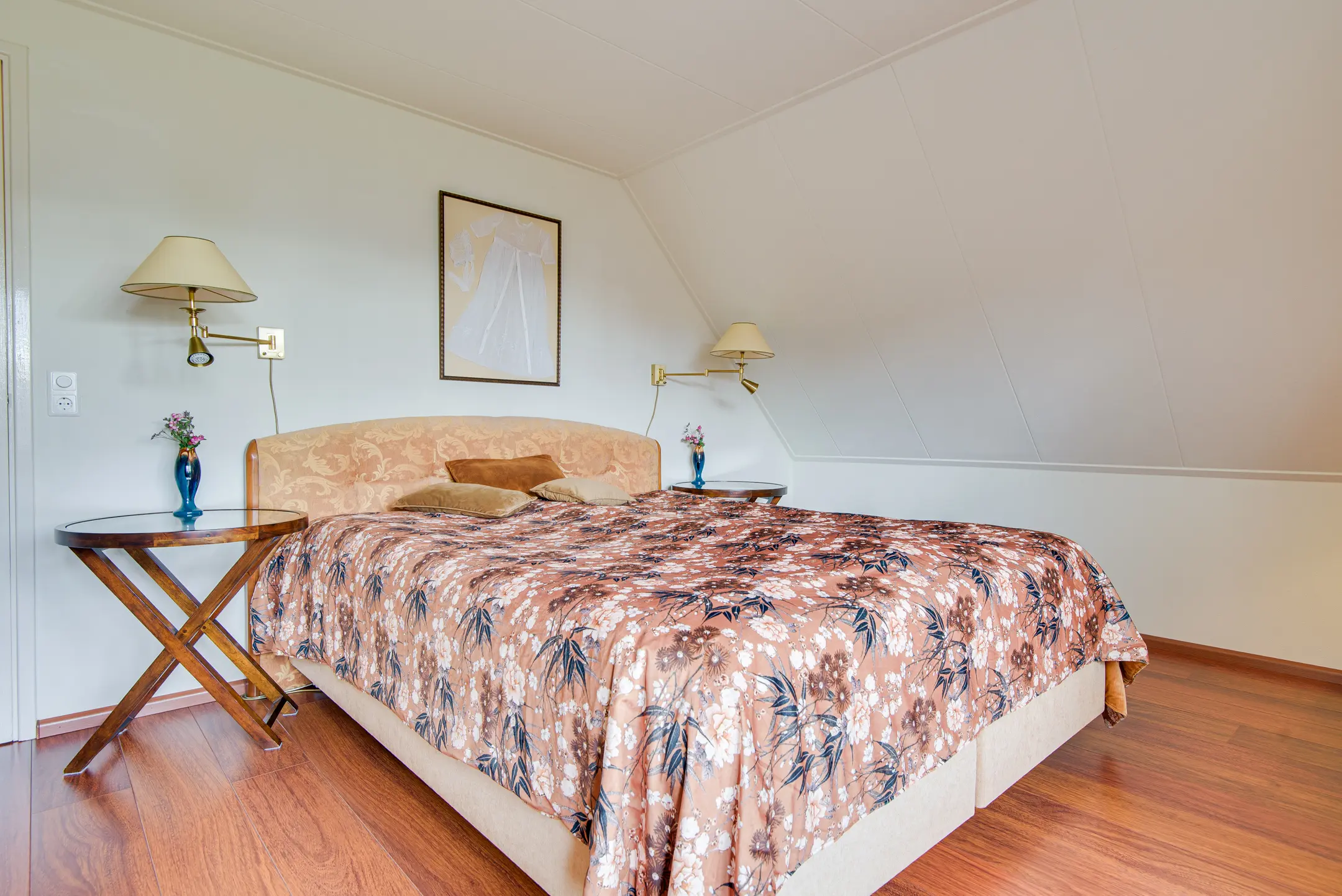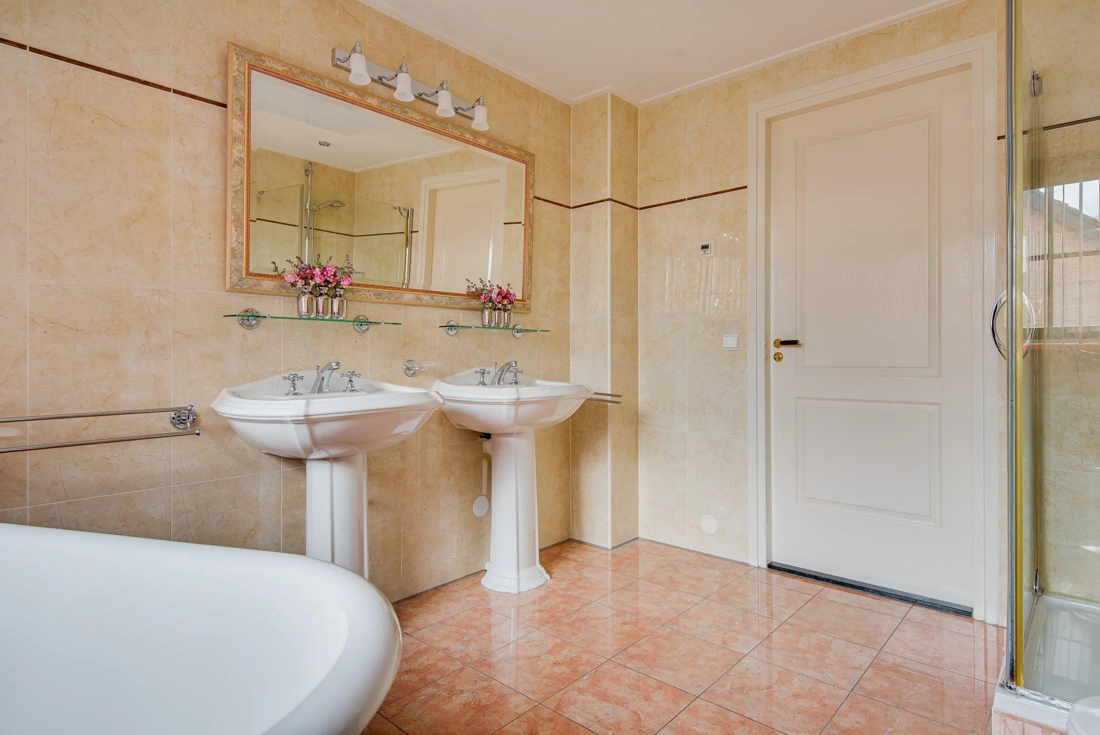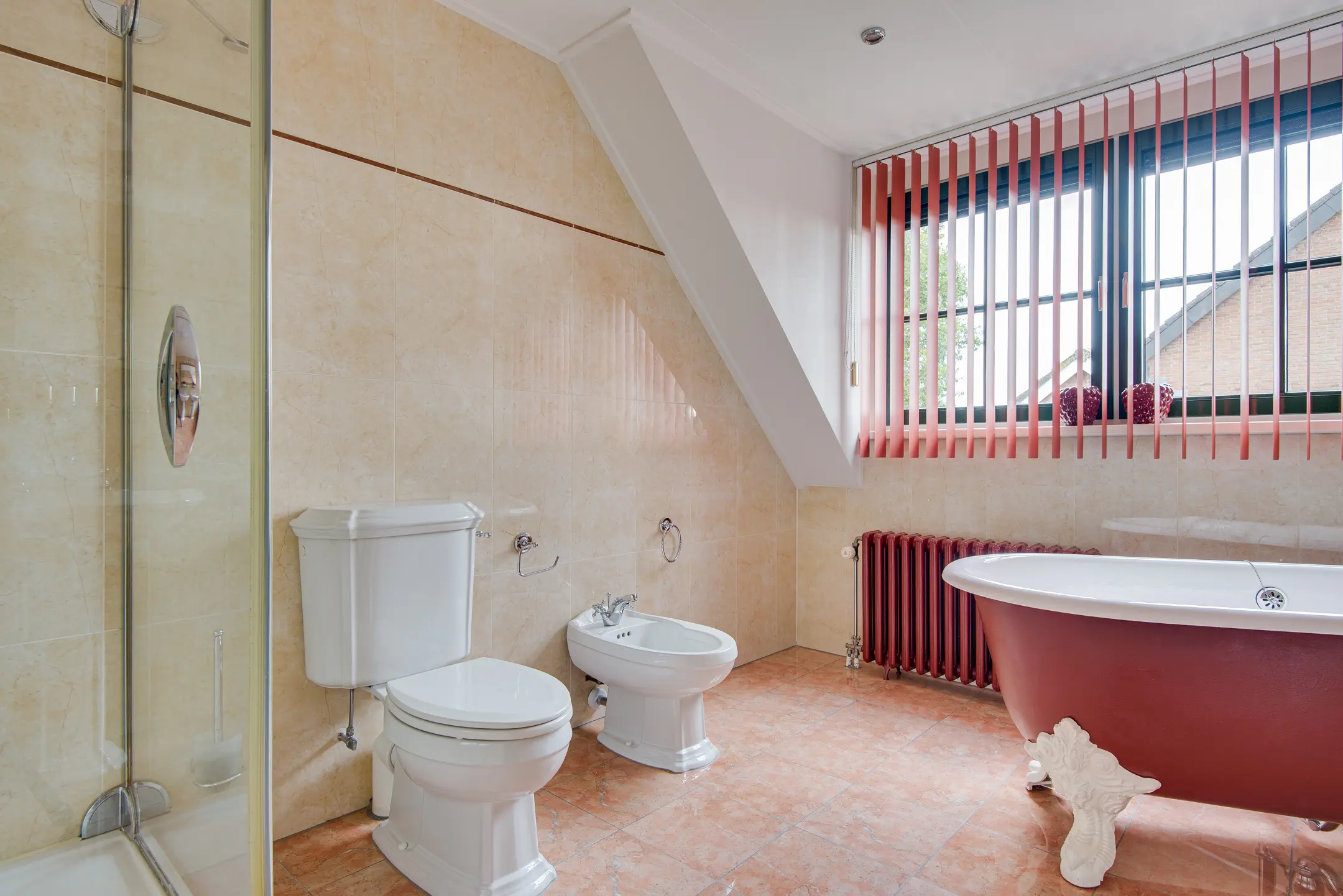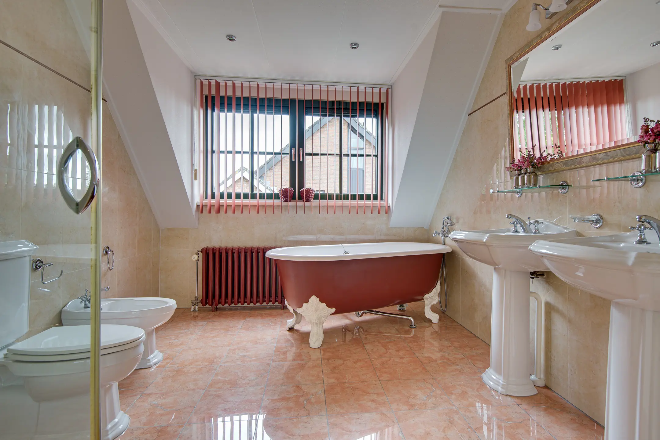 - Ruime badkamer met dakkapel, douchecabine, vrijstaand ligbad, toilet, bidet, dubbele wastafel, elektrische vloerverwarming en infrarood verwarming.