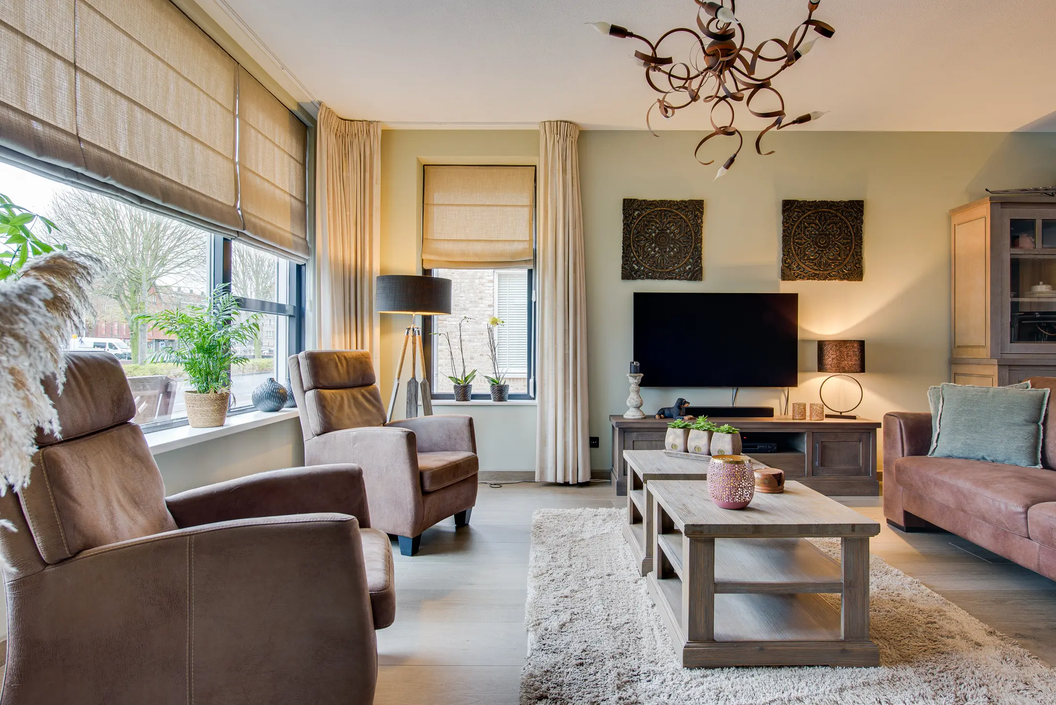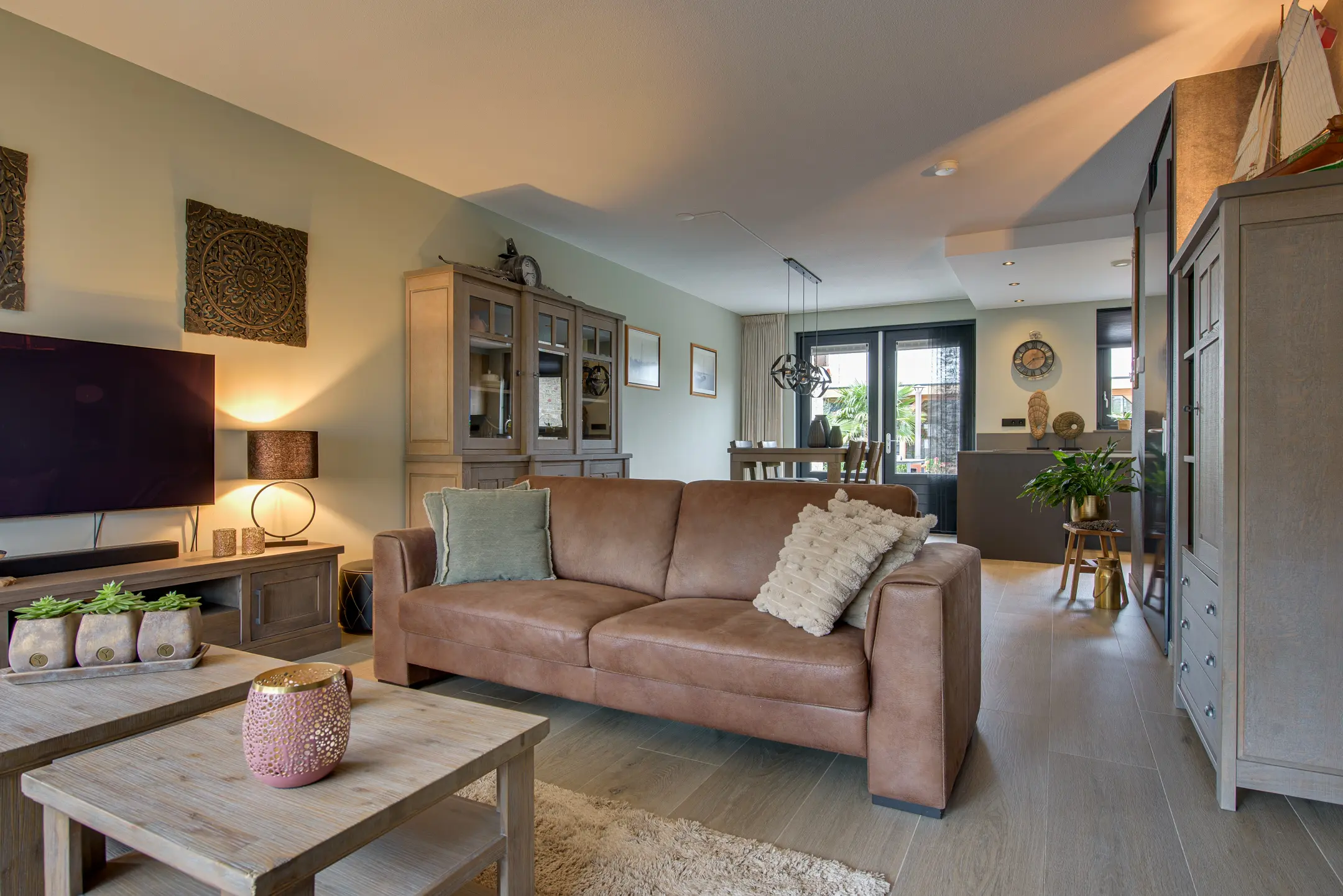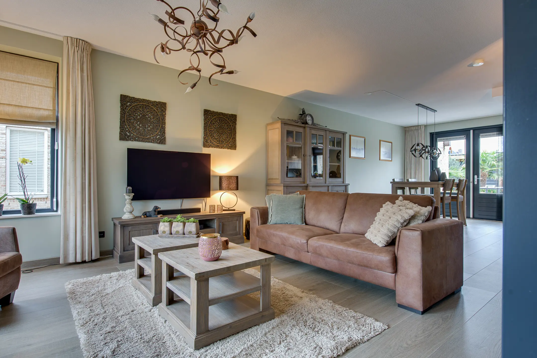- Royale woonkamer met trapkast, terrasdeuren naar tuin, tegelvoer waaronder vloerverwarming, screen en rolluik