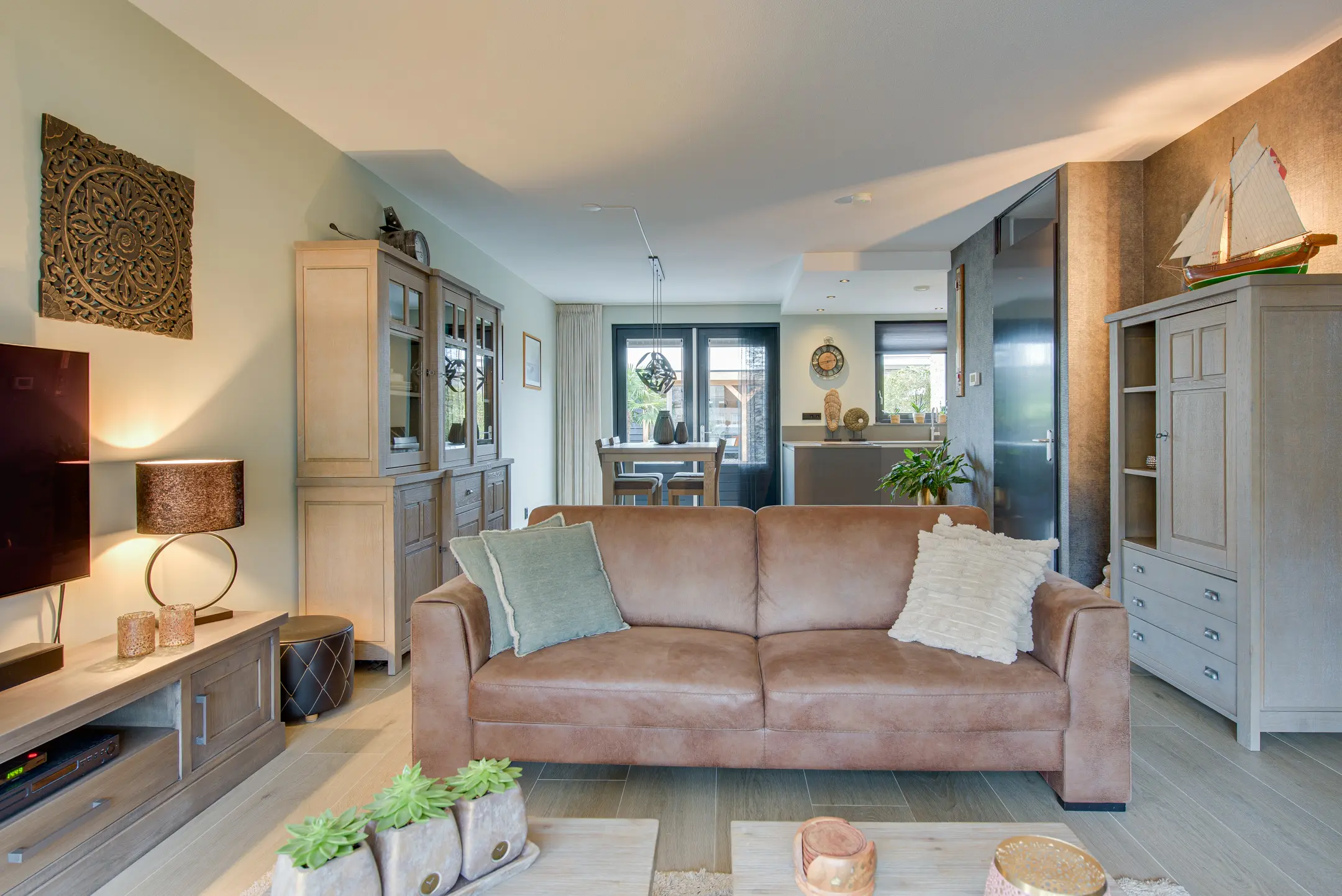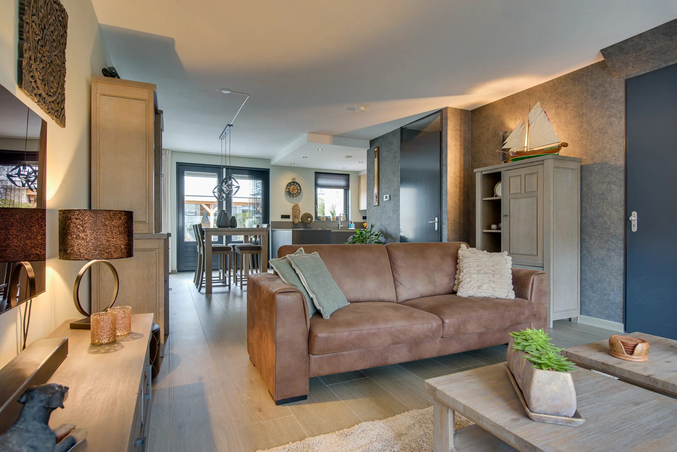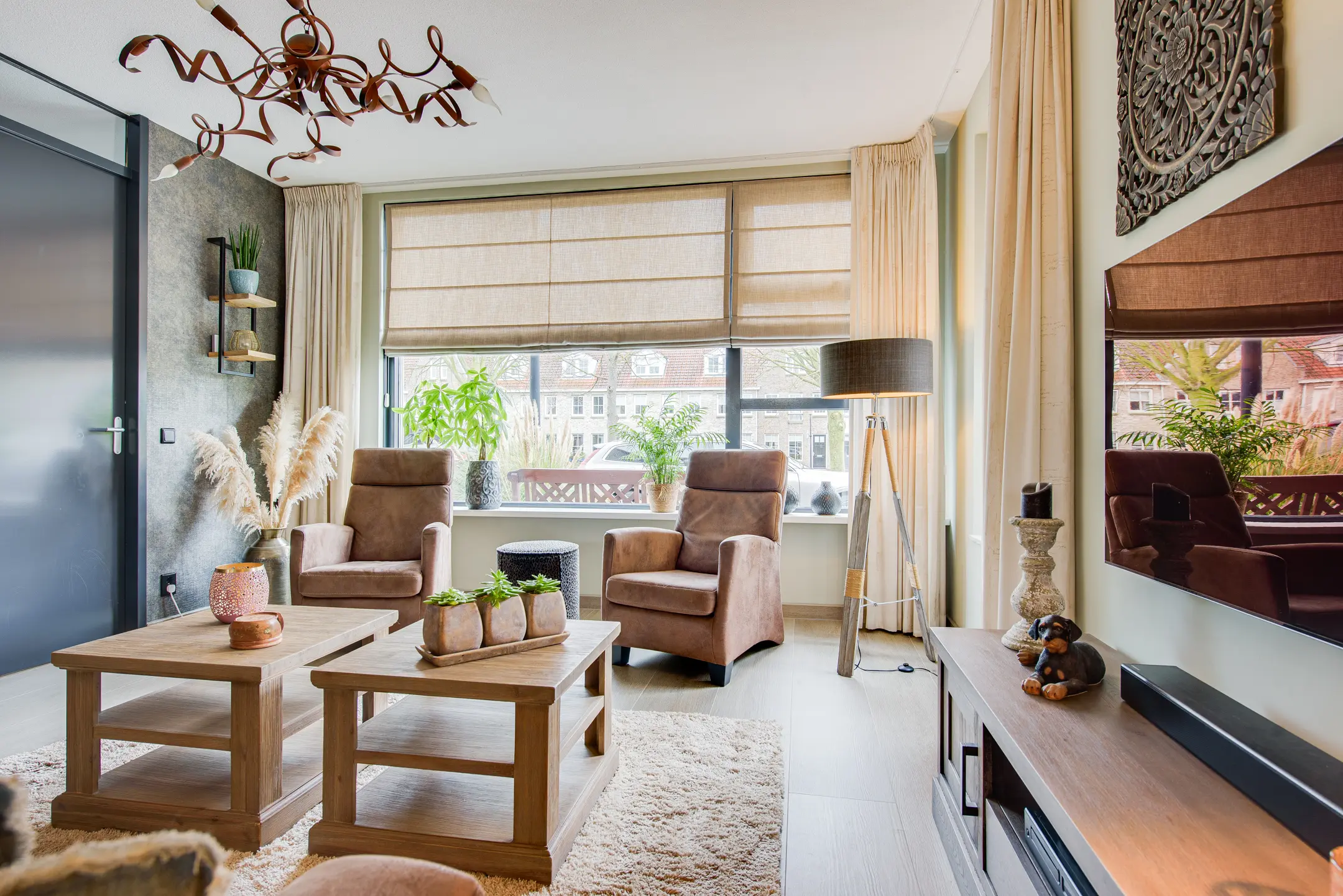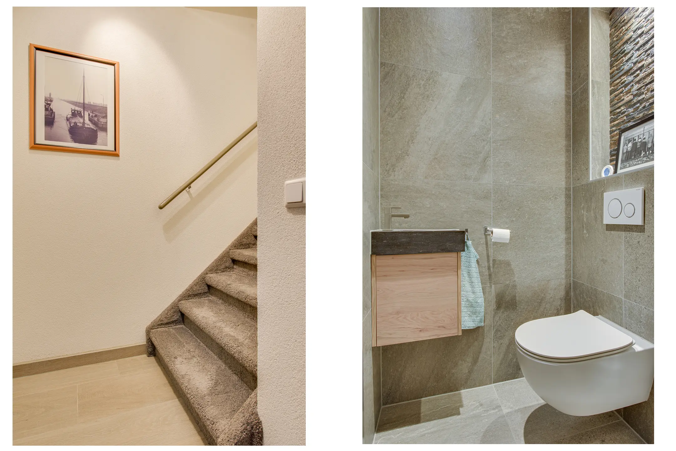- Royale woonkamer met trapkast, terrasdeuren naar tuin, tegelvoer waaronder vloerverwarming, screen en rolluik