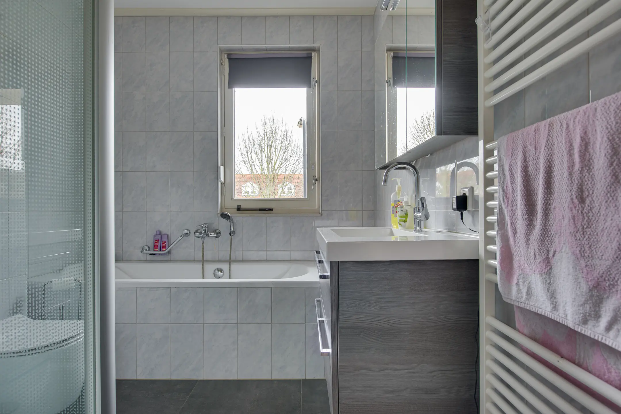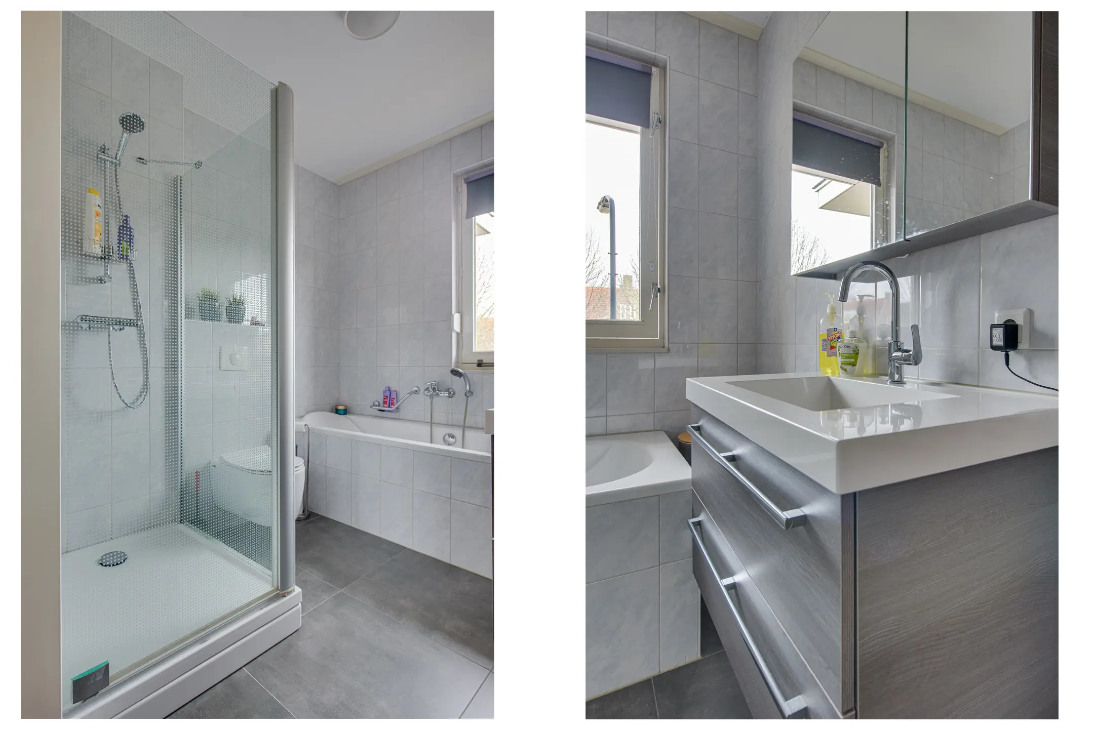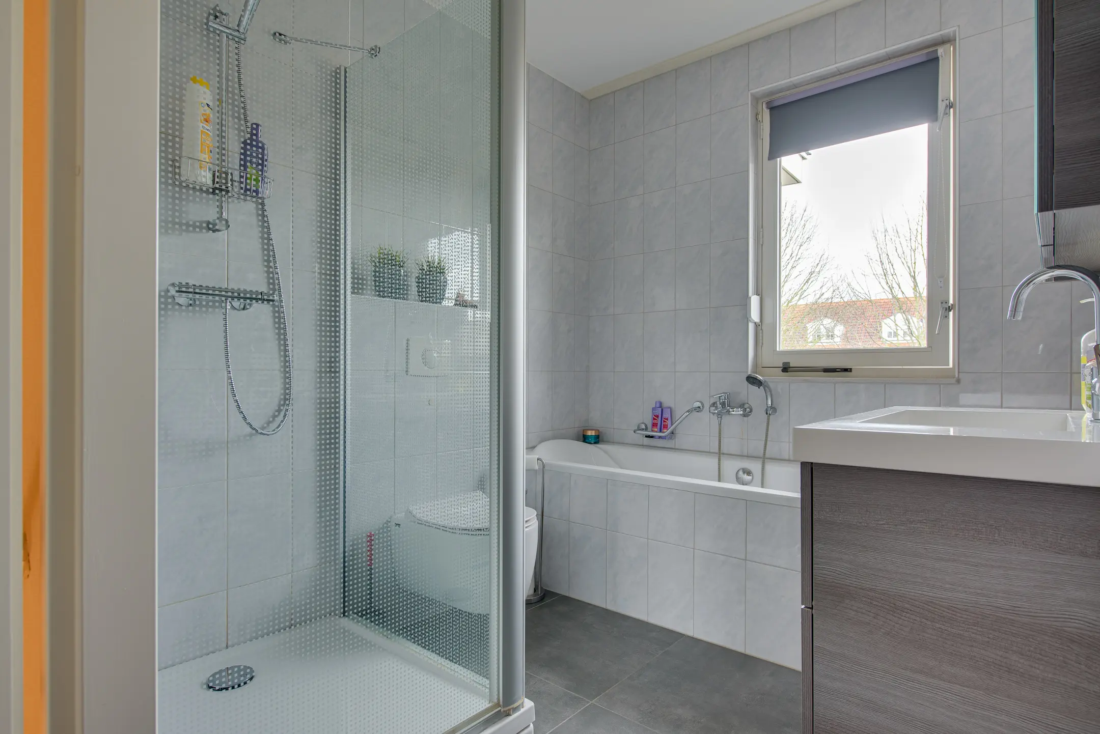 - Geheel betegelde badkamer voorzien van douche, ligbad, vaste wastafel, 2e toilet en rolluik