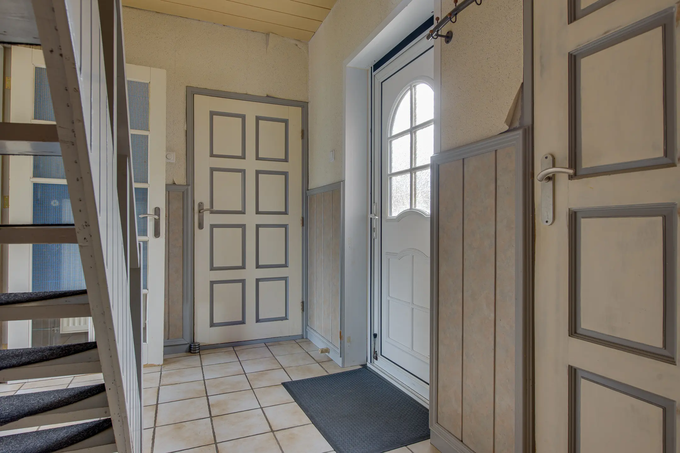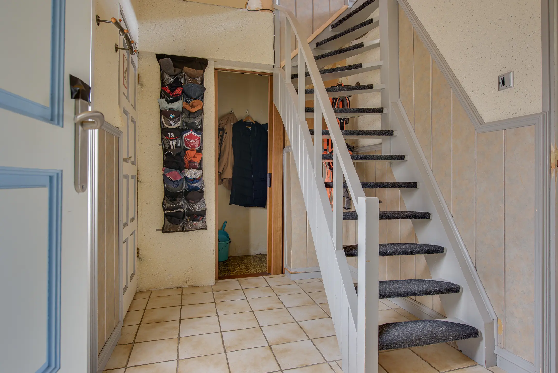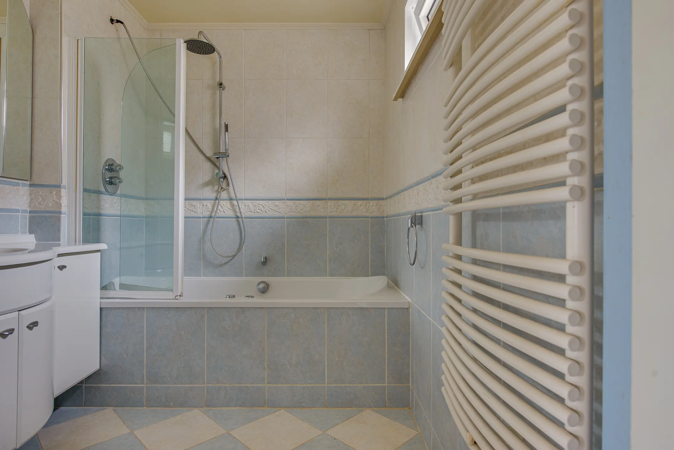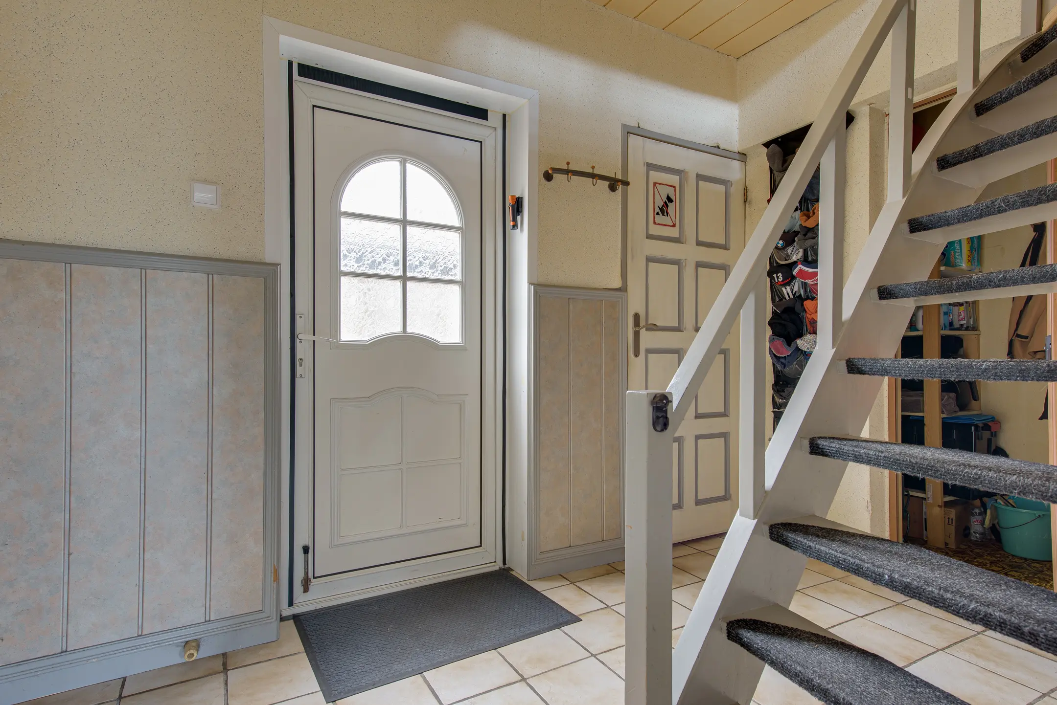 - entree met trapopgang naar eerste verdieping, geheel betegelde badkamer met douche in bad en wastafel in meubel, vaste kast met cv-installatie (Remeha 2023) en wasruimte