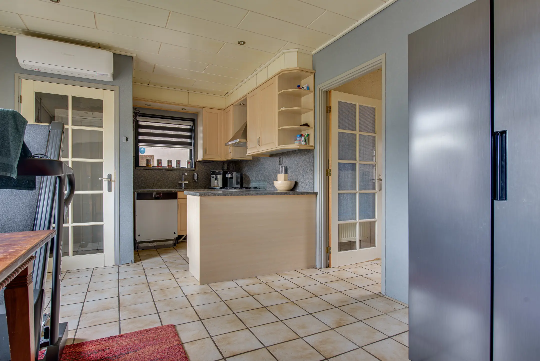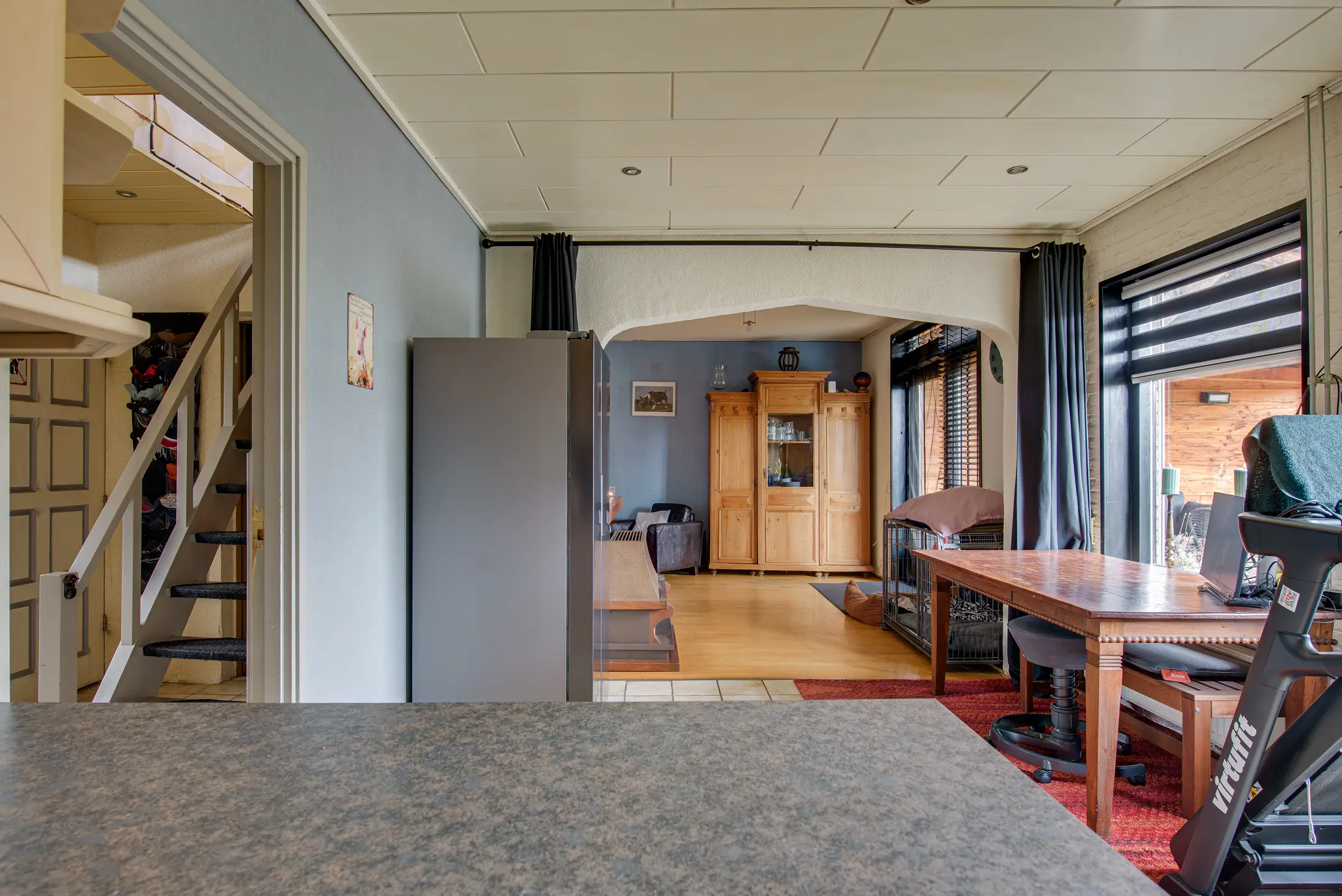 - Woonkeuken met eenvoudige keuken voorzien van diverse inbouwapparatuur en vaste bergkast