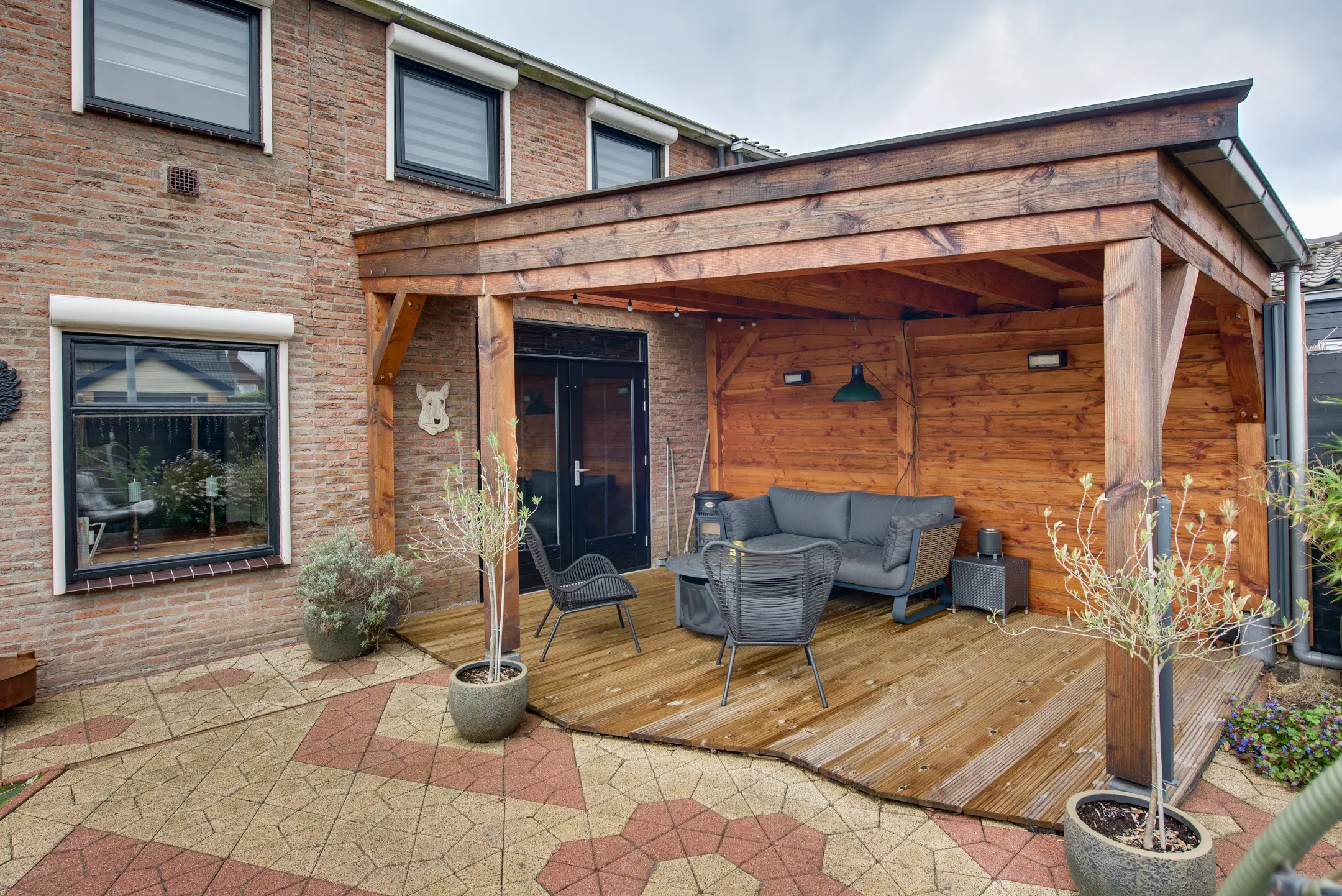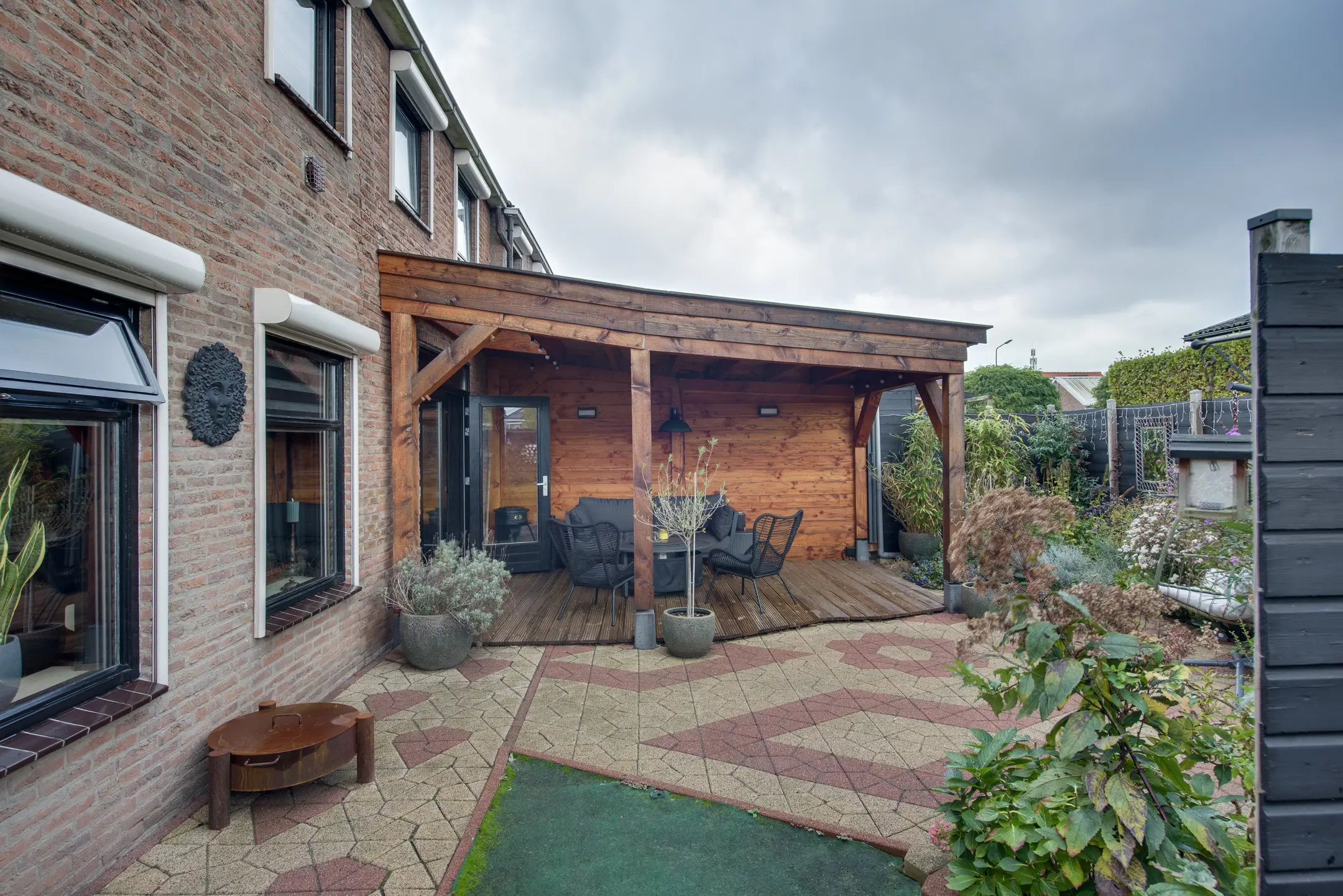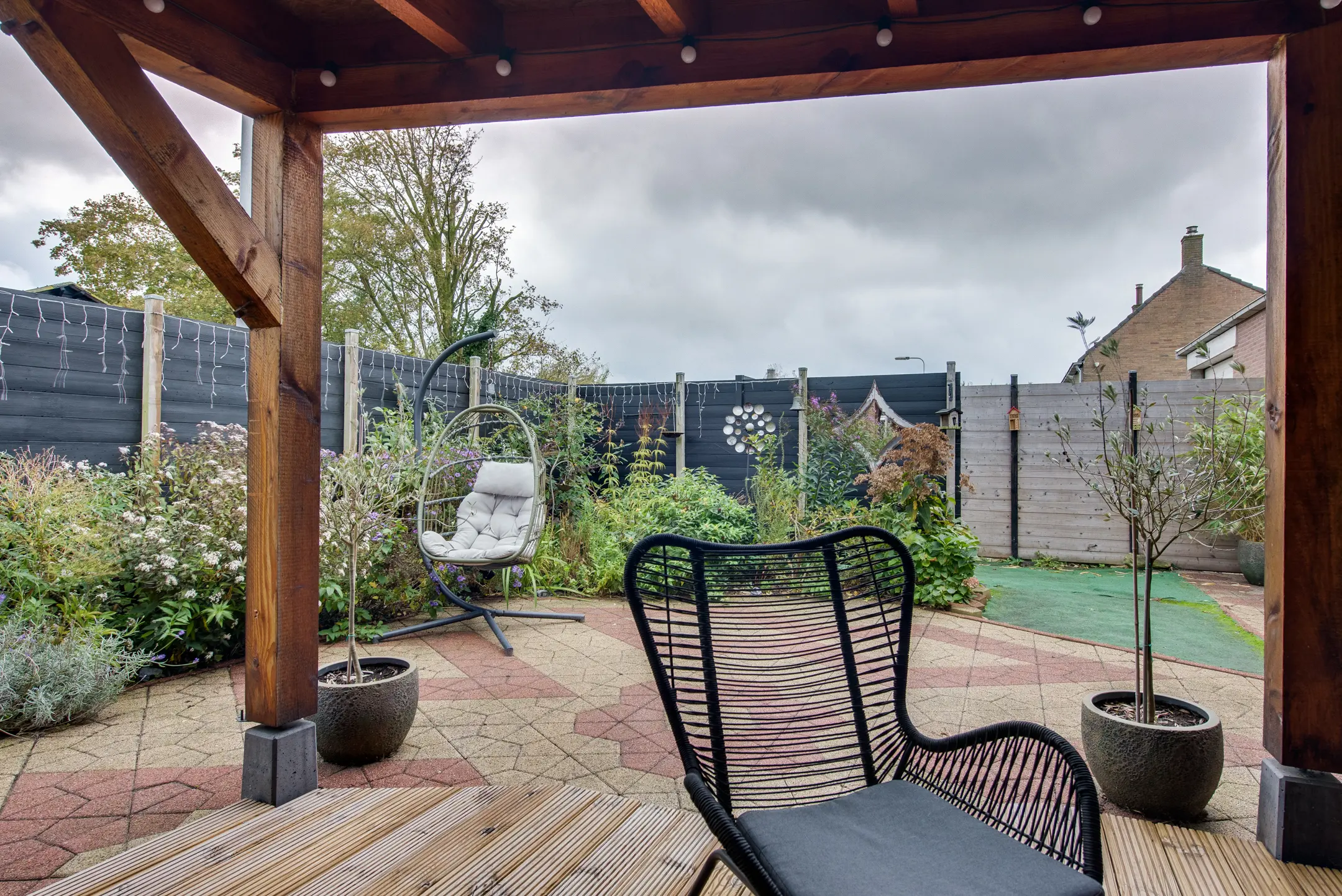 De tuin is een heerlijke plek om te zitten met een sfeervolle overkapping. Met gemakkelijke toegang vanaf de achterkant, is de tuin de perfecte plek om te ontspannen en te genieten van de rustige omgeving. De garage aan de achterzijde biedt voldoende ruimte voor maximaal 3 auto's en is uitgerust met elektriciteit.