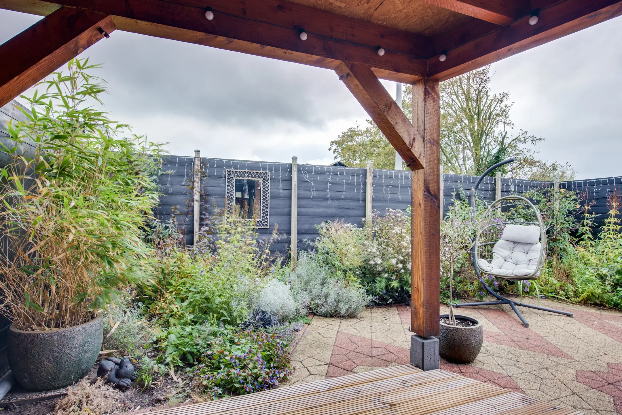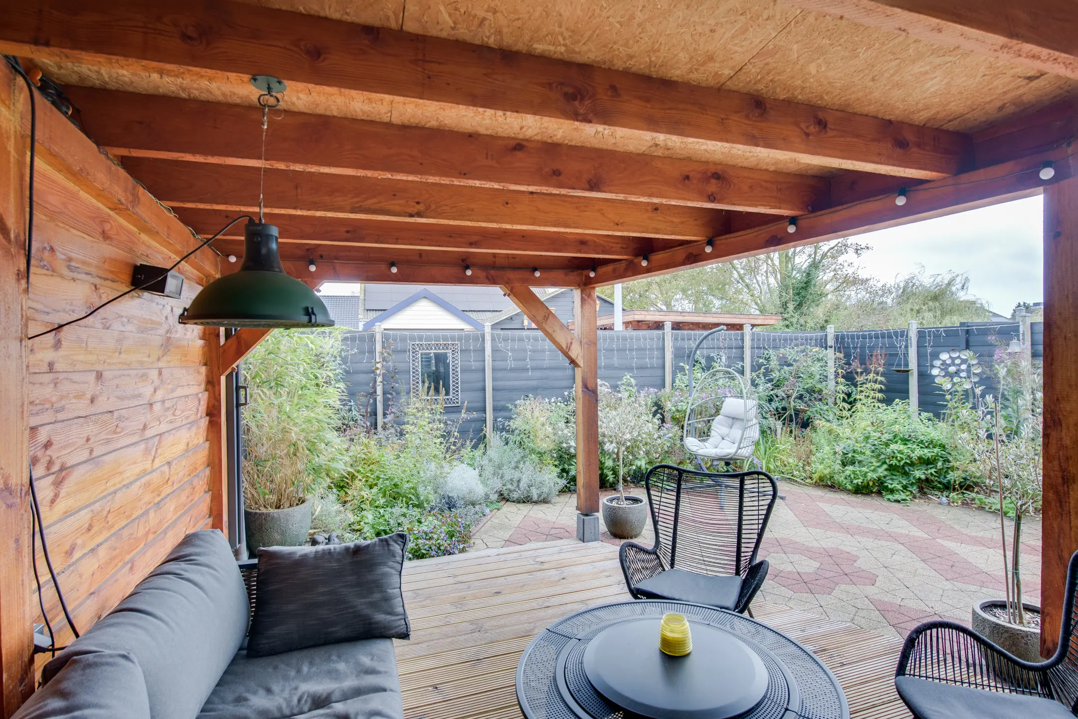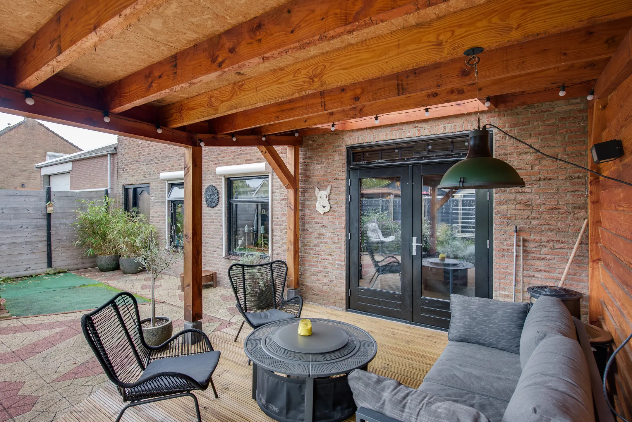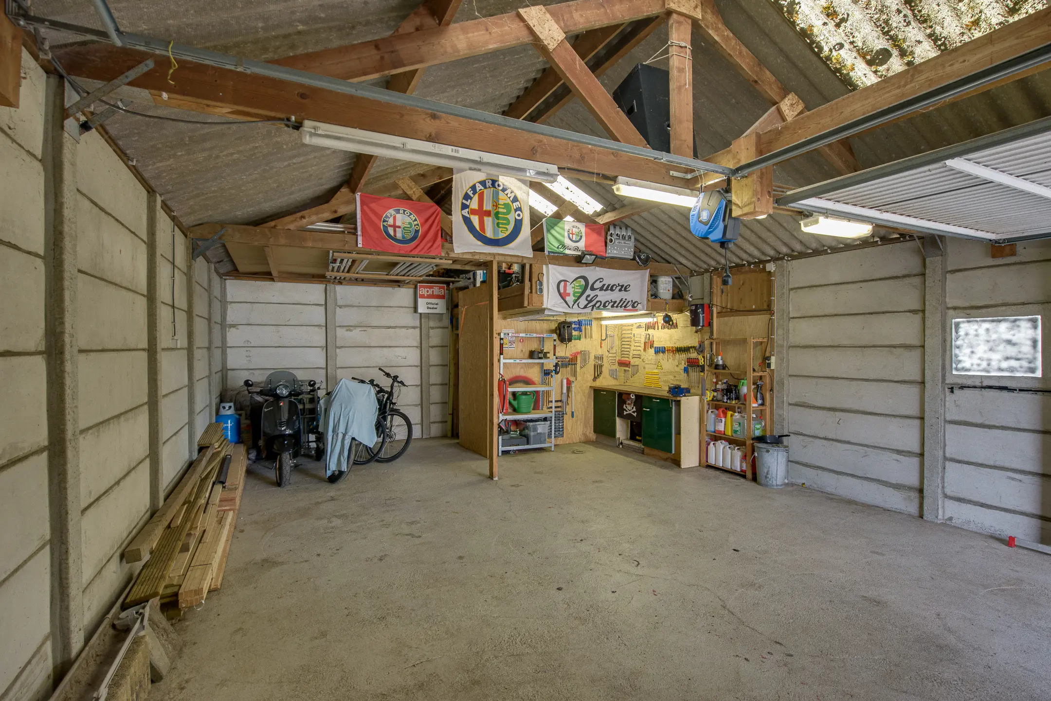 De tuin is een heerlijke plek om te zitten met een sfeervolle overkapping. Met gemakkelijke toegang vanaf de achterkant, is de tuin de perfecte plek om te ontspannen en te genieten van de rustige omgeving. De garage aan de achterzijde biedt voldoende ruimte voor maximaal 3 auto's en is uitgerust met elektriciteit.