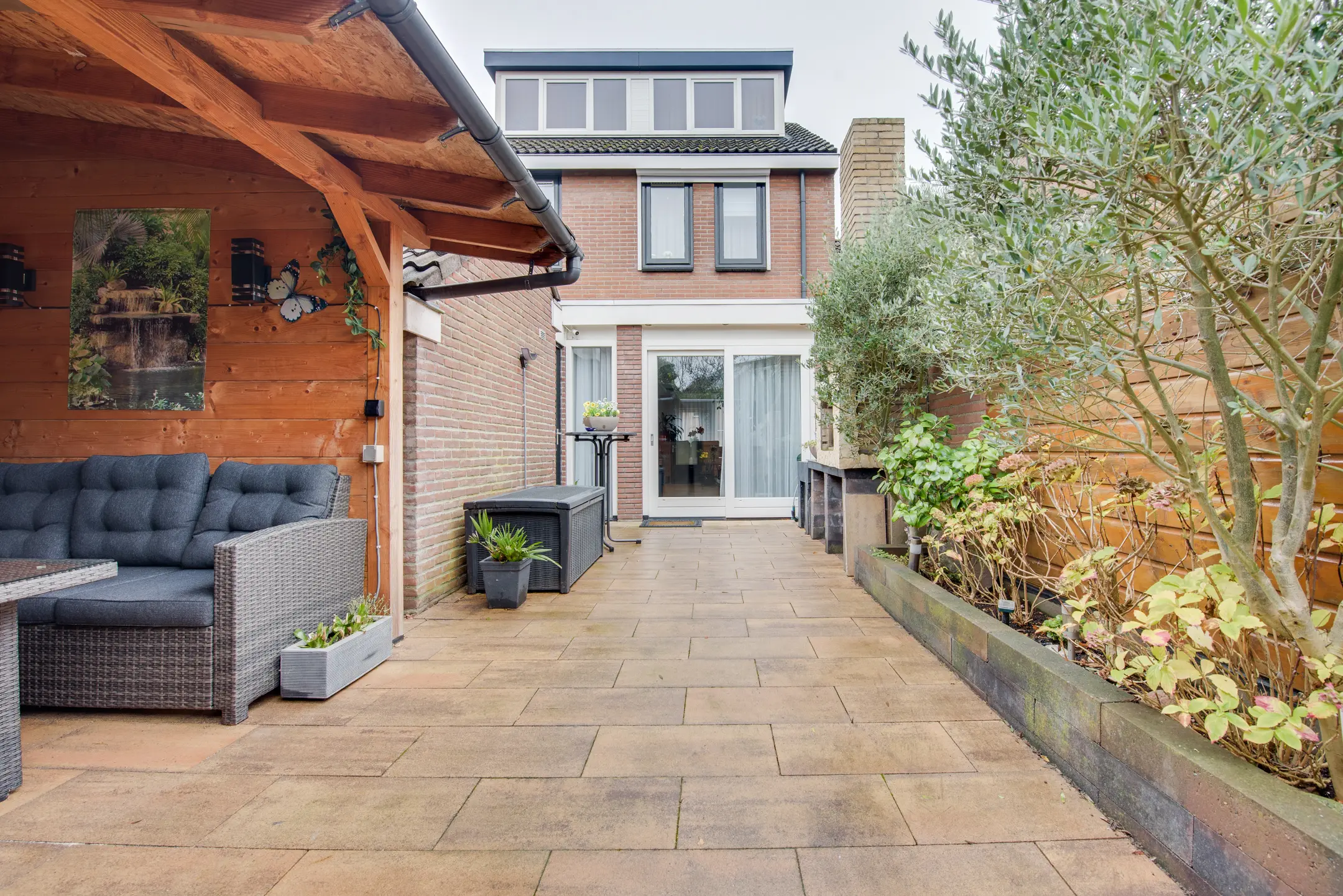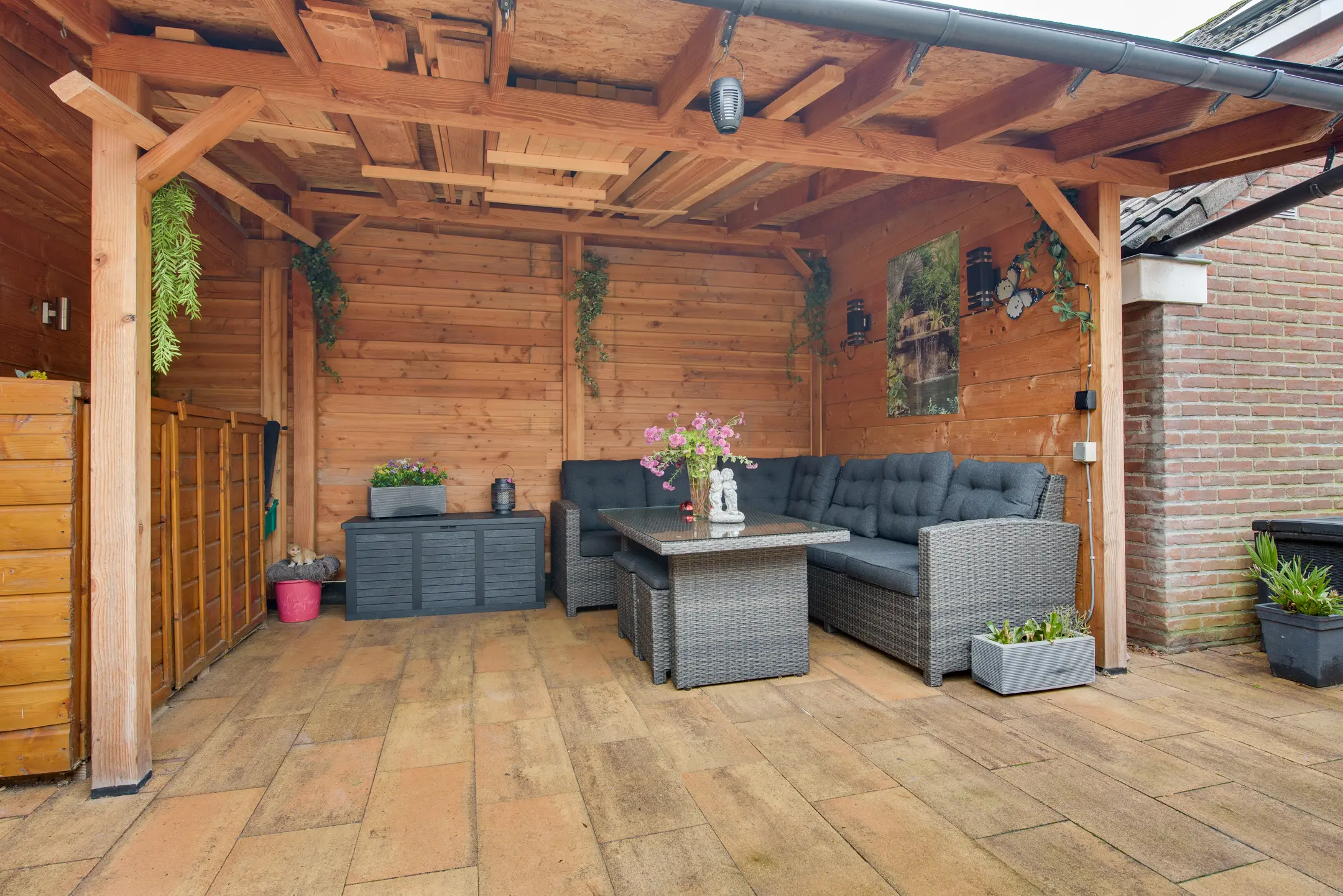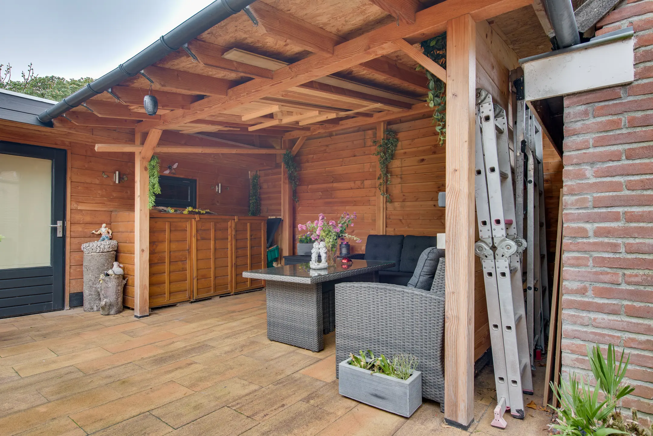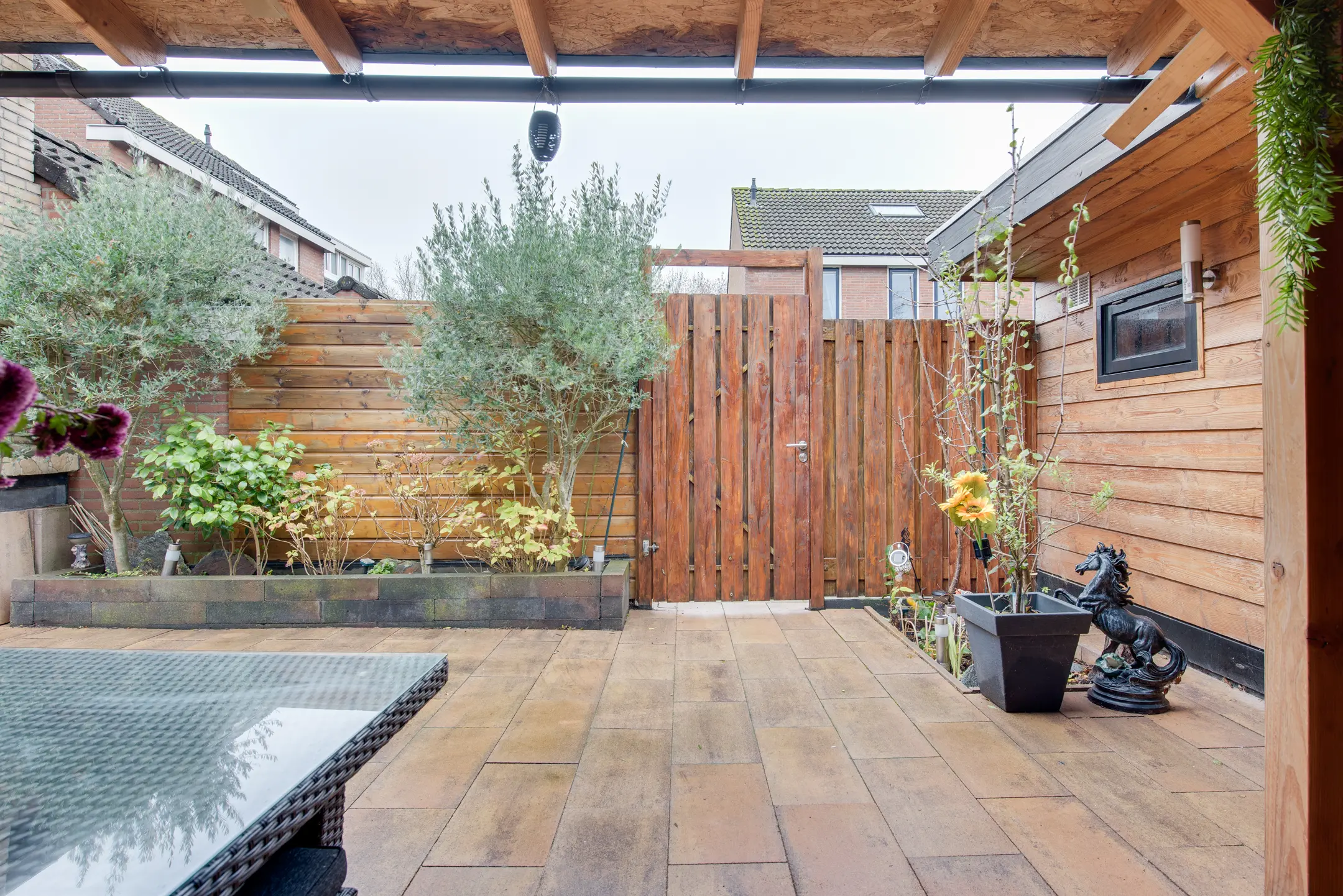 De achtertuin ligt op het noordoosten, is achterom bereikbaar en biedt volop mogelijkheden om heerlijk buiten te leven. Dankzij de overkapping kunt u er ook beschut zitten. Achter in de tuin staat een houten schuur, ideaal als extra opbergruimte voor fietsen, tuinspullen of hobby’s.