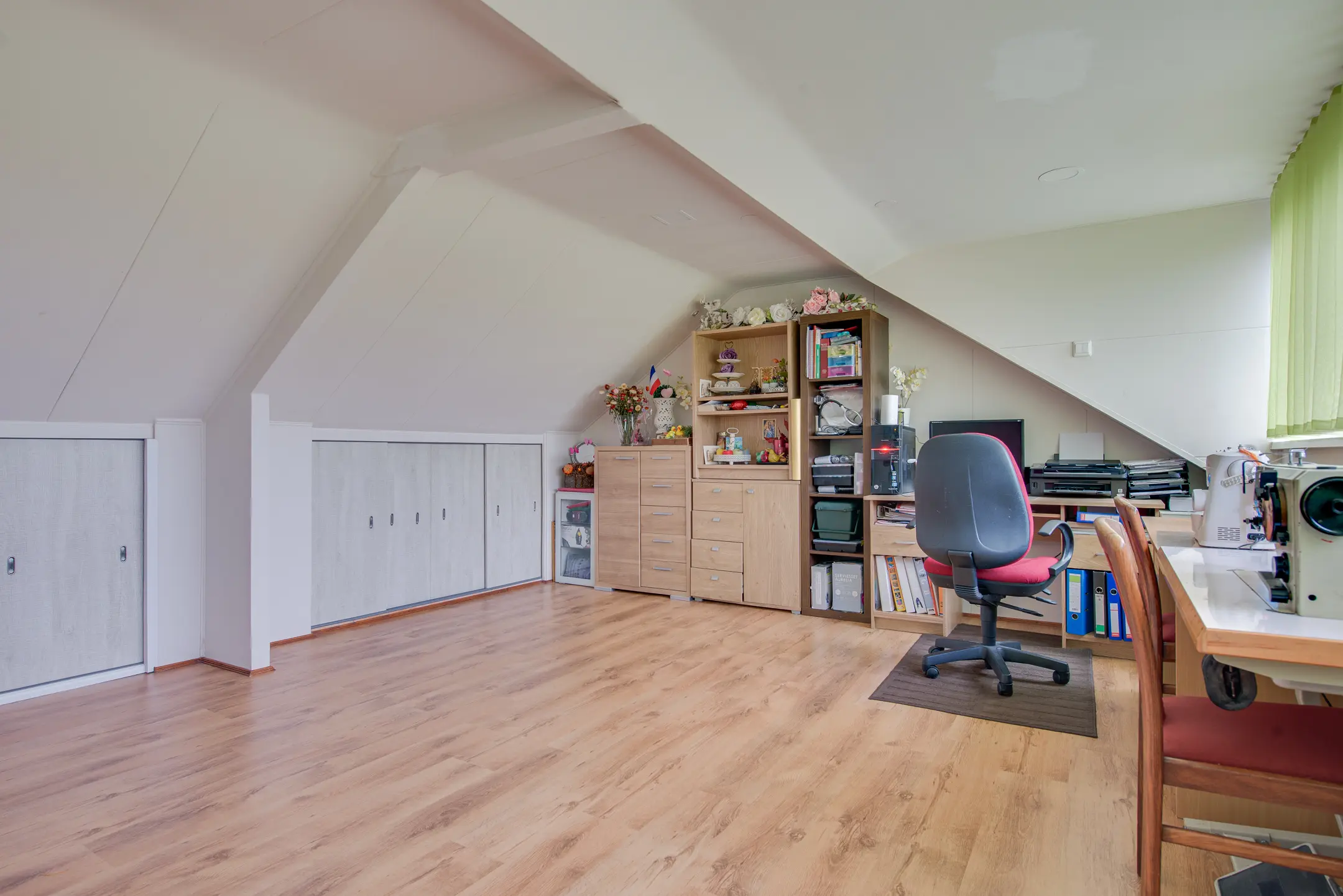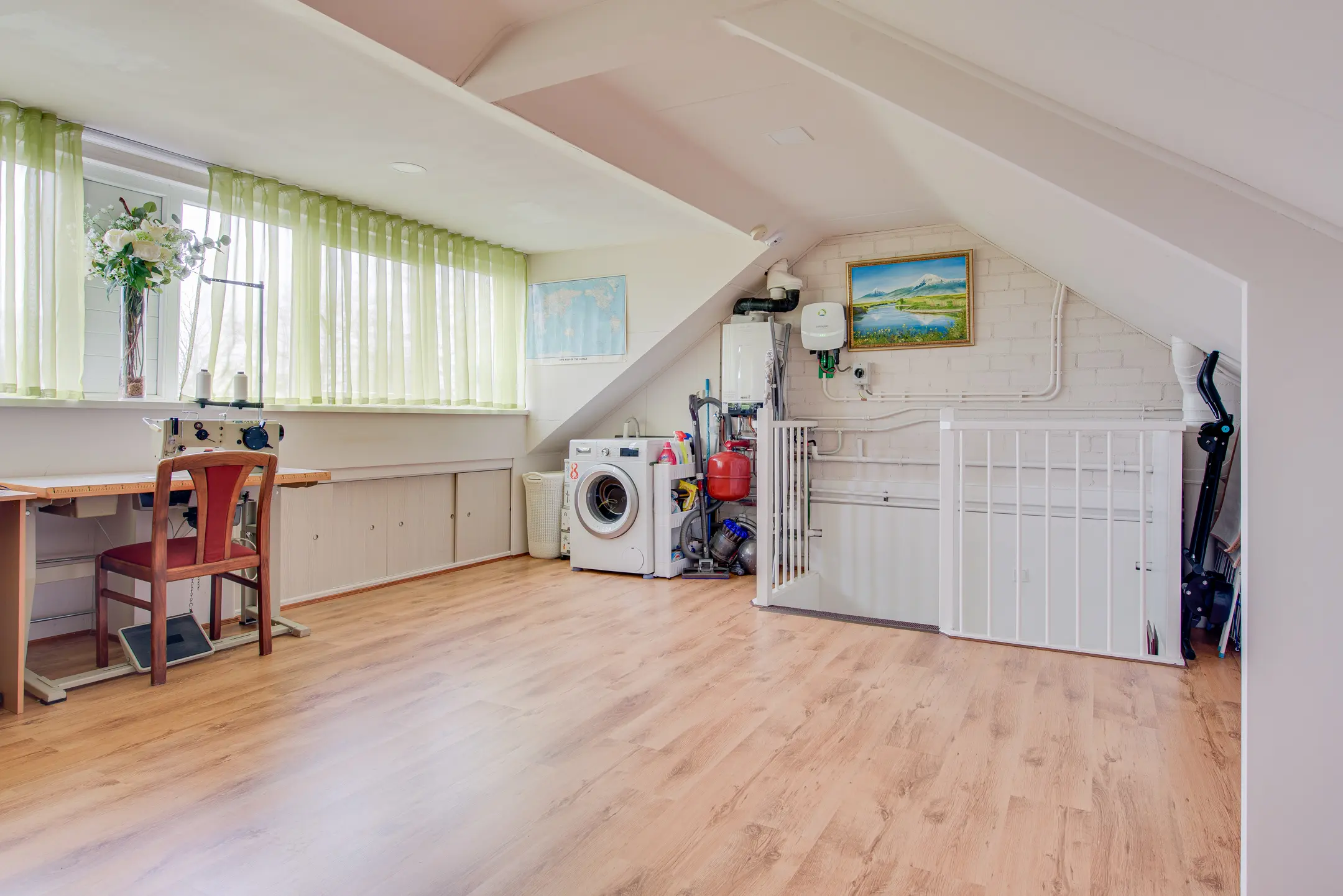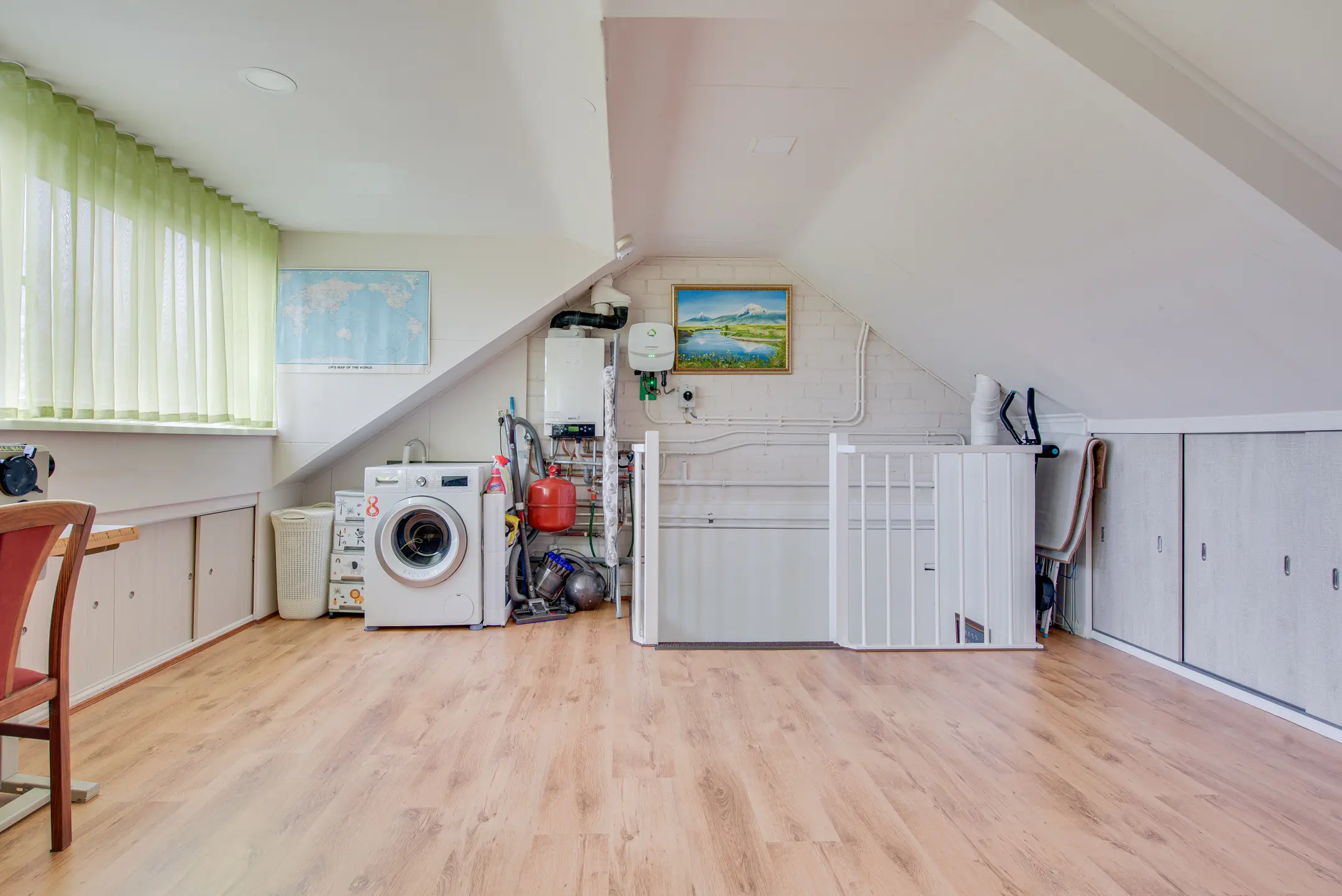- Open zolder met brede dakkapel en bergruimte achter de knieschotten.