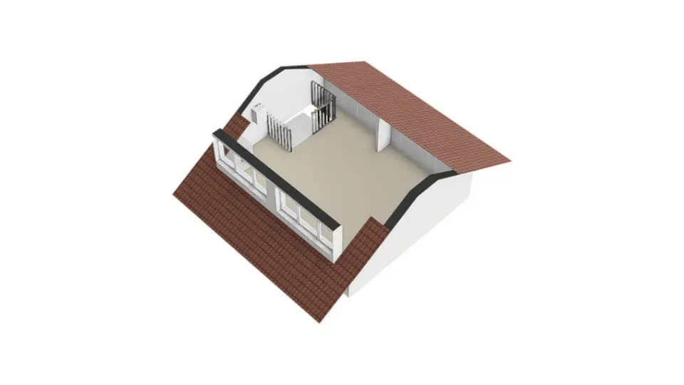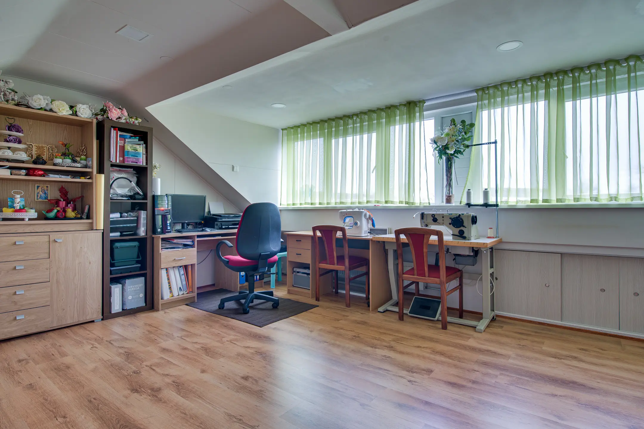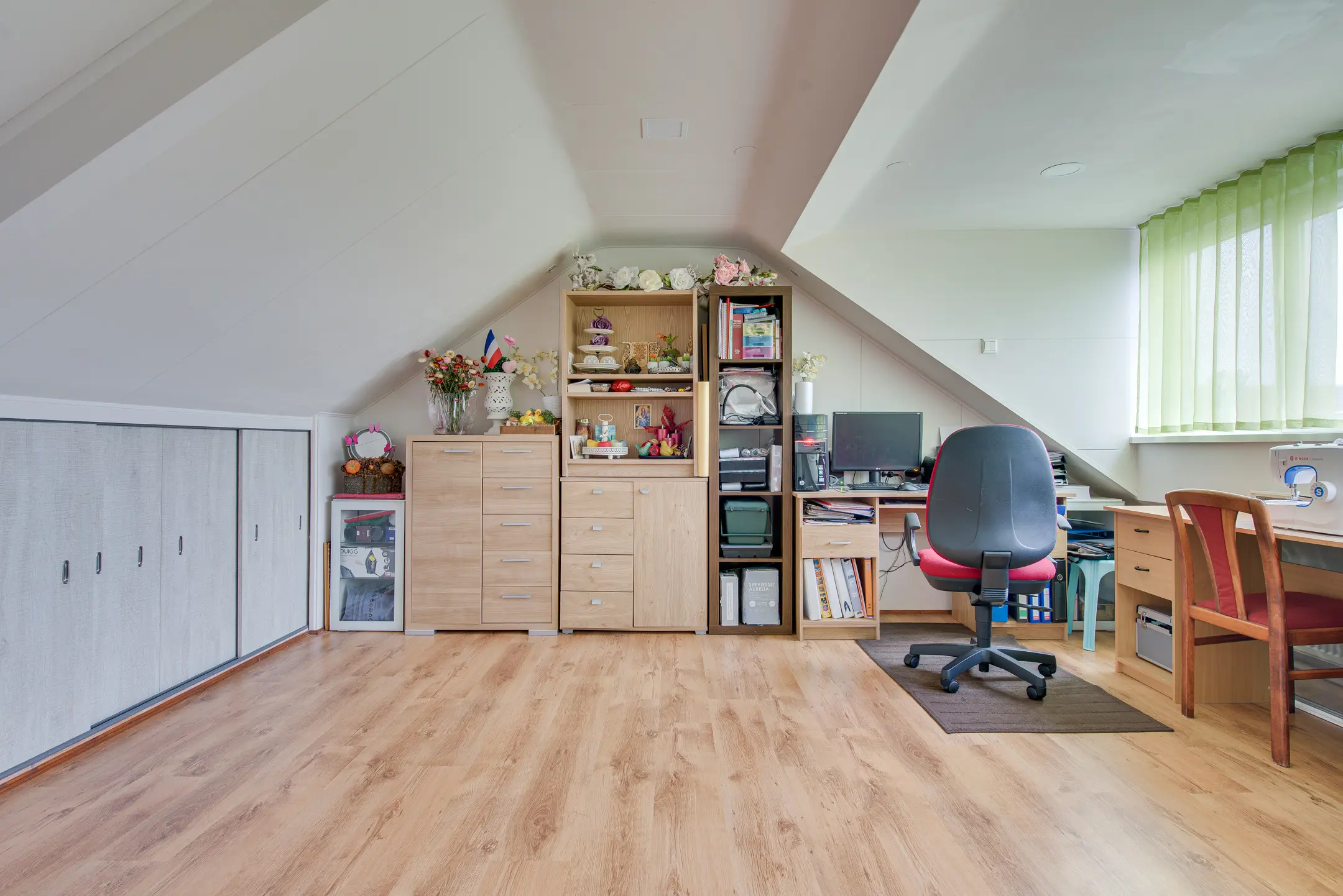 - Open zolder met brede dakkapel en bergruimte achter de knieschotten.