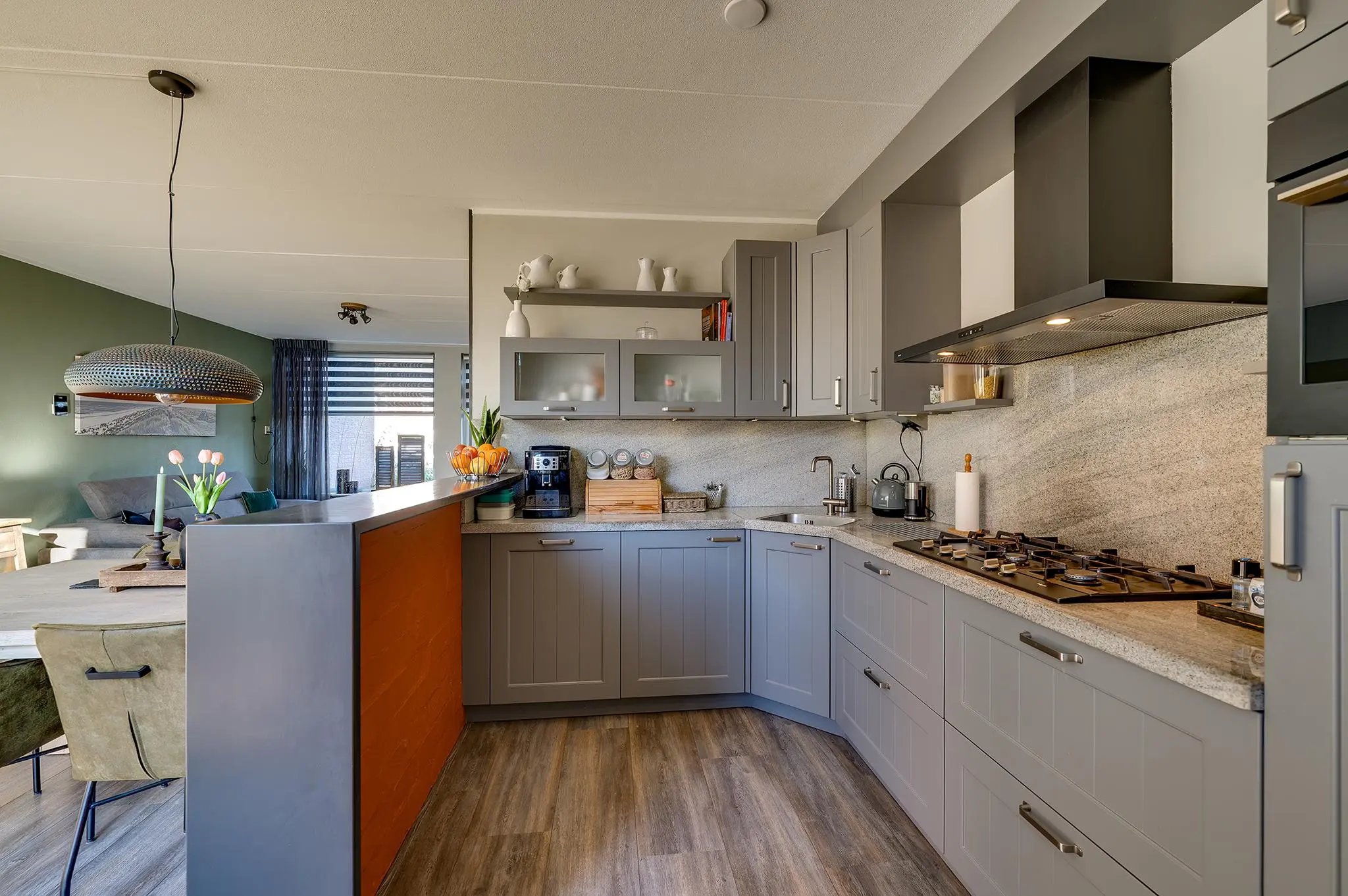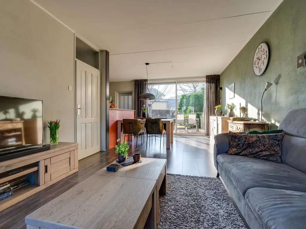 Begane grond: De entreehal met trapopgang, meterkast, trapkast en geheel betegeld toilet met fonteintje verwelkomt u in de woning. De lichte doorzonwoonkamer, voorzien van een schuifpui naar de tuin en een keurige vloer, biedt een warme en sfeervolle leefruimte. De halfopen keuken in hoekopstelling is volledig uitgerust met een gaskookplaat, afzuigkap, oven, vaatwasser en koelkast, ideaal voor kookliefhebbers. Aansluitend treft u de praktische bijkeuken met witgoedaansluiting en toegang tot de inpandige garage, die ook beschikt over een handige bergzolder.