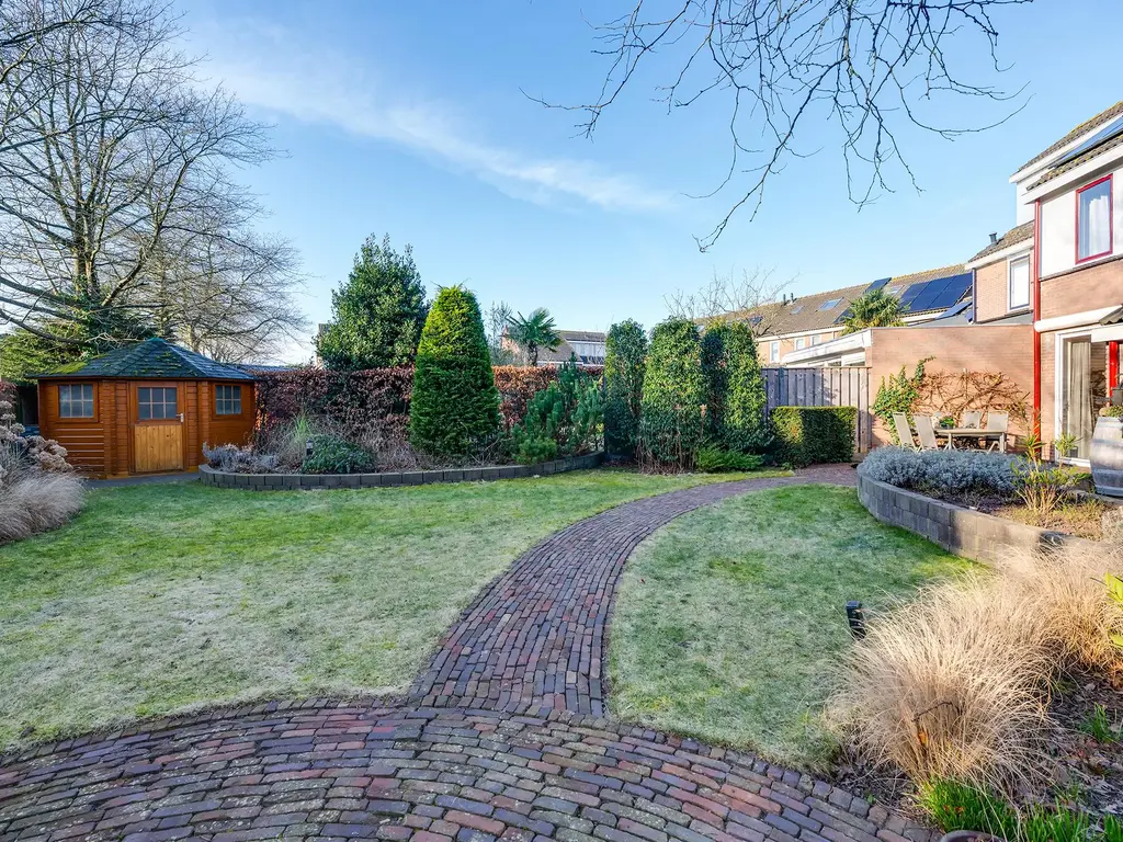 De riante, zonnige tuin op het zuiden biedt volop privacy en is voorzien van een tuinhuis. De woning beschikt daarnaast over een eigen oprit, zodat u altijd een parkeerplek heeft.