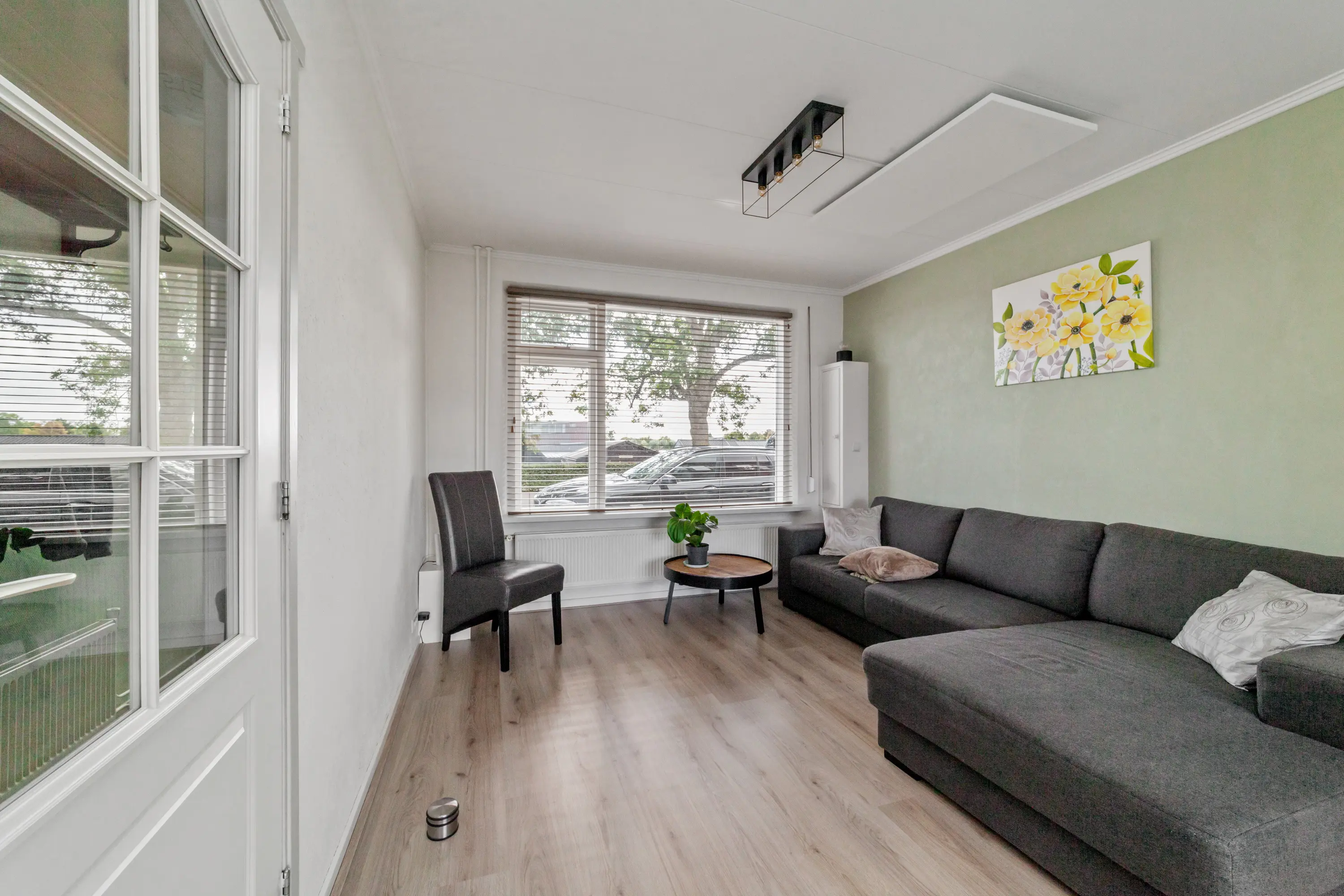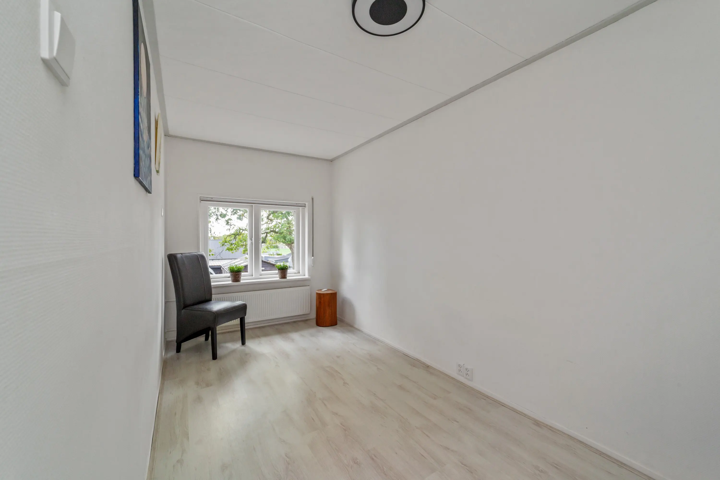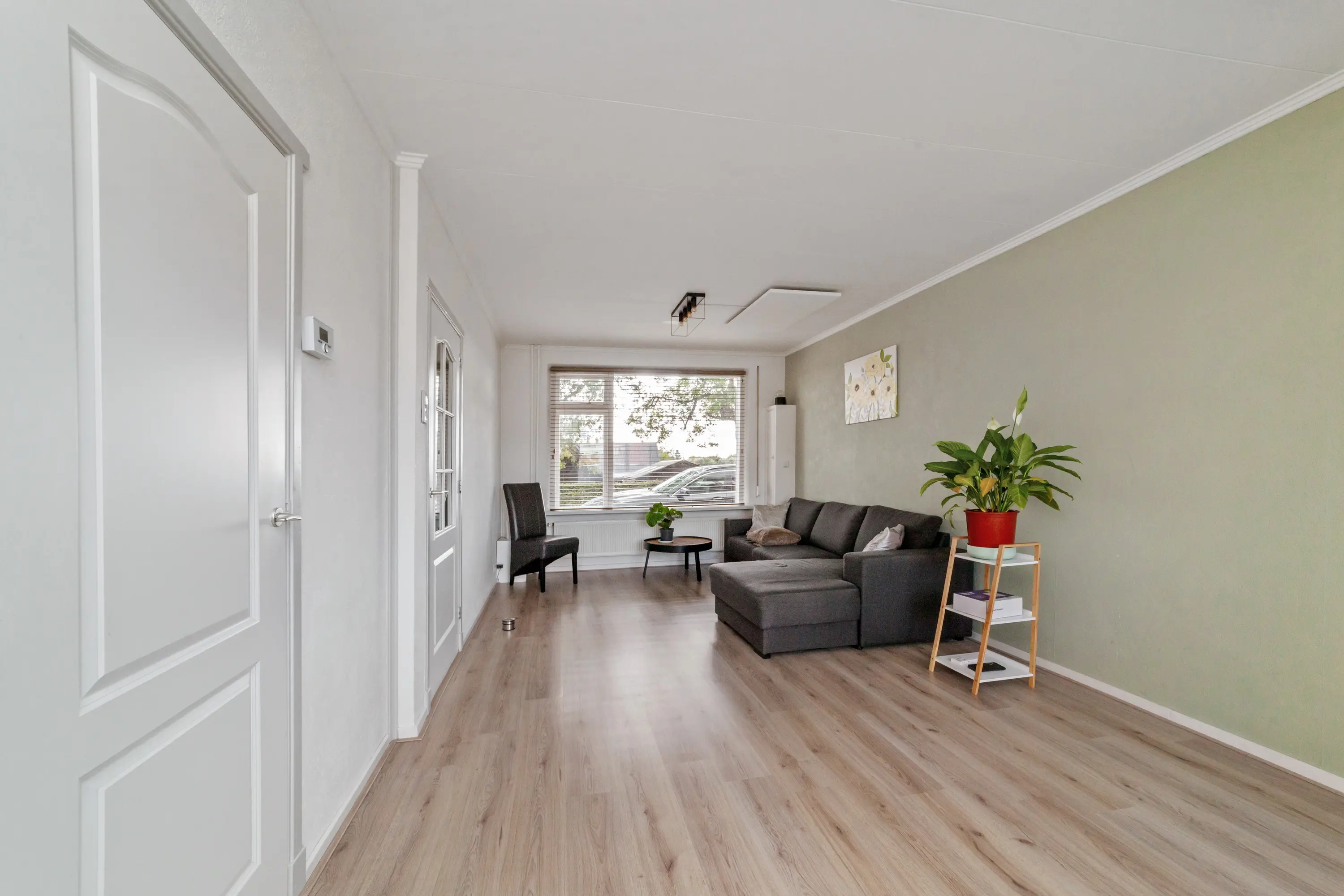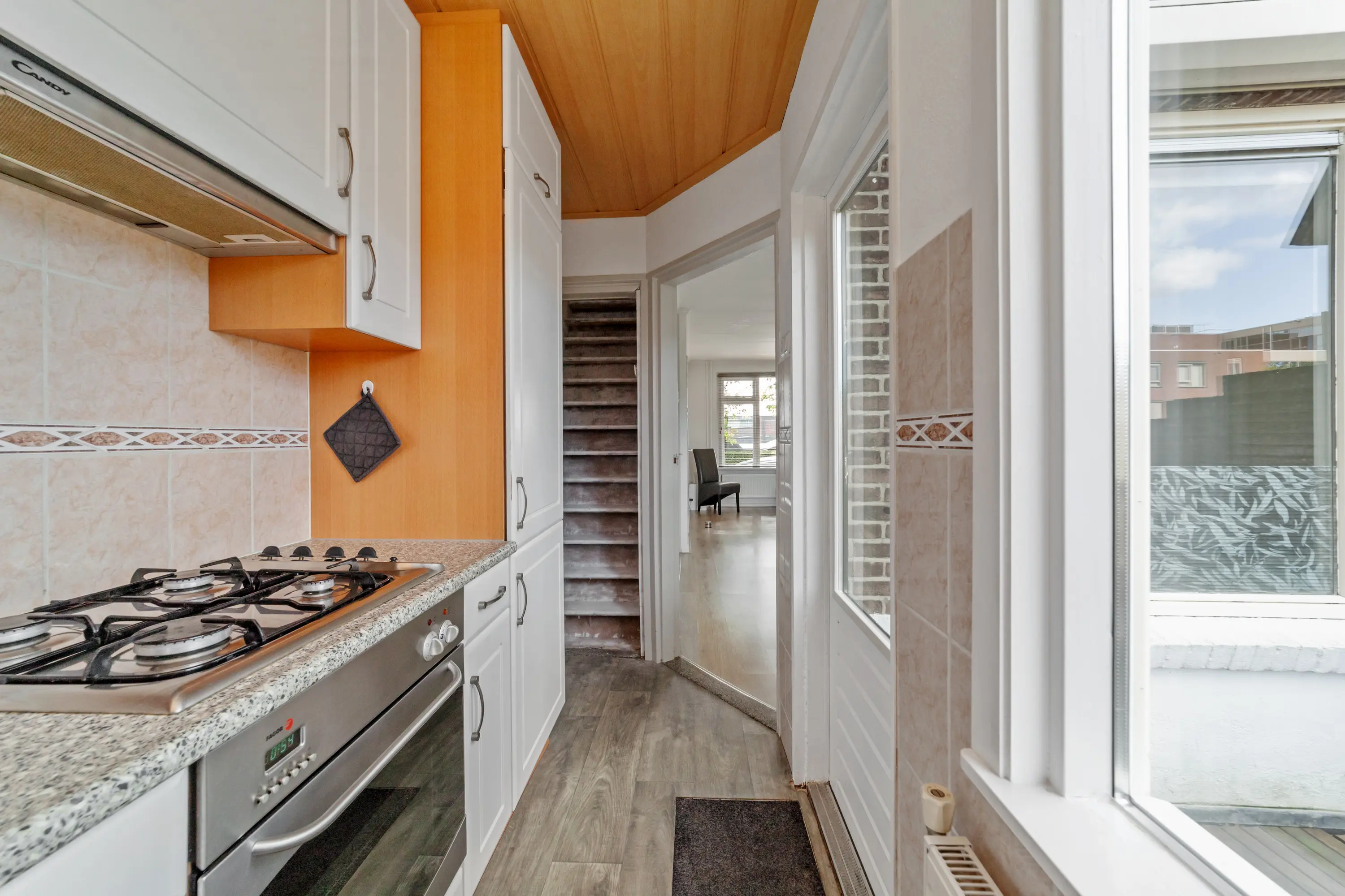 Indeling: entreehal met geheel betegeld toilet; lichte doorzonwoonkamer met laminaat vloer en provisiekast; aanbouw met lichte keuken voorzien van gaskookplaat, afzuigvlakscherm, oven, vaatwasmachine, koelkast + vriezer (2024), trapopgang en deur naar terras en tuin.