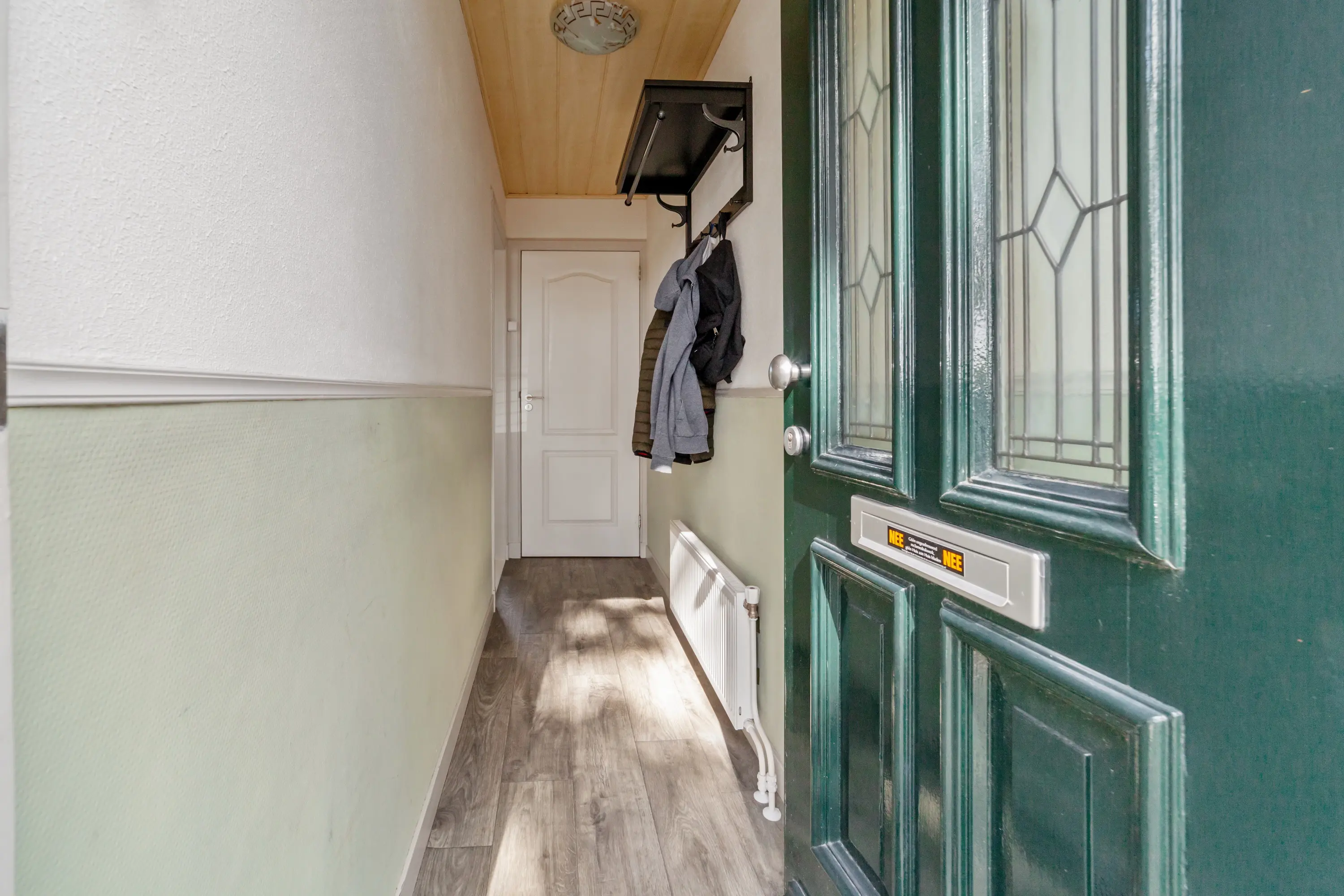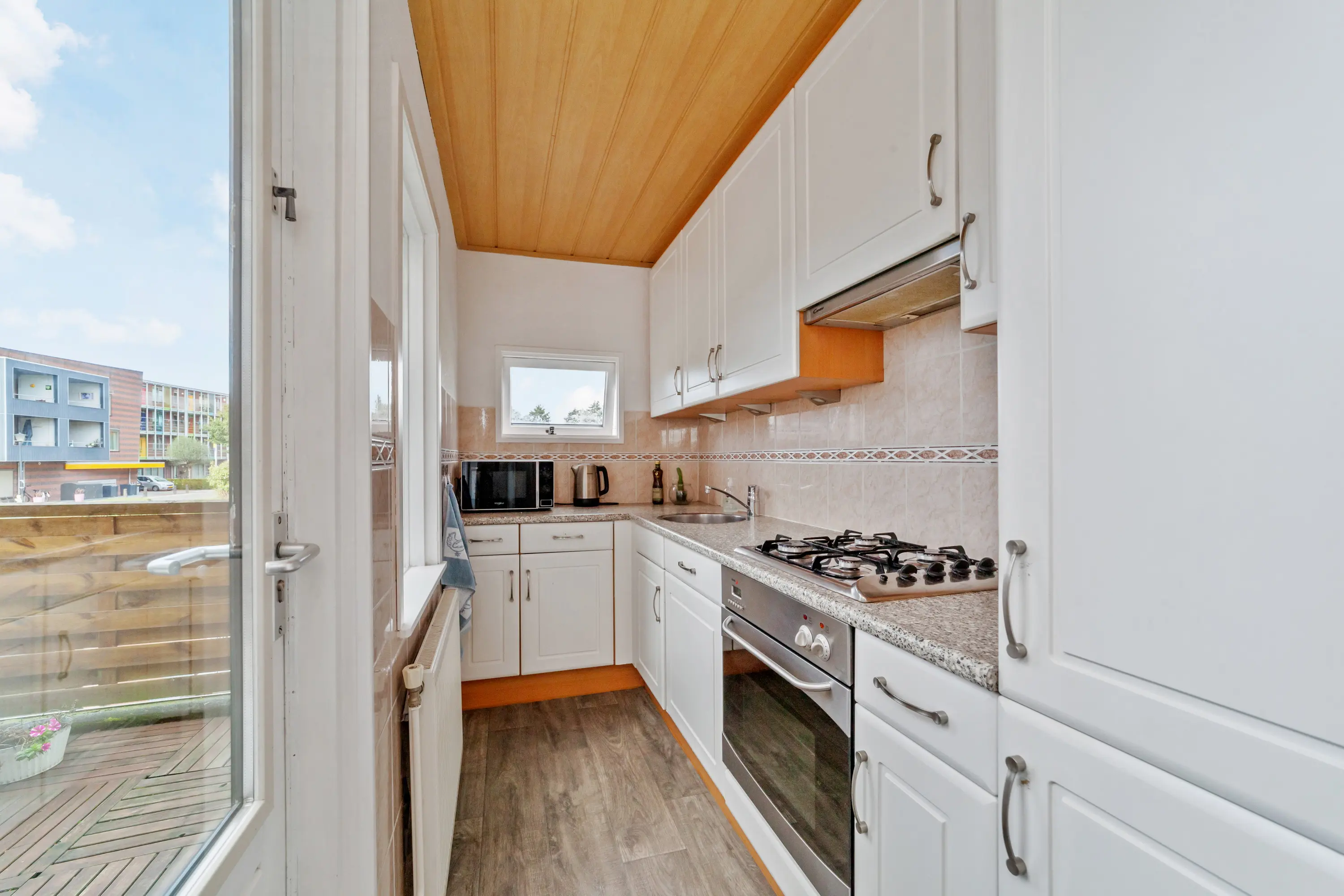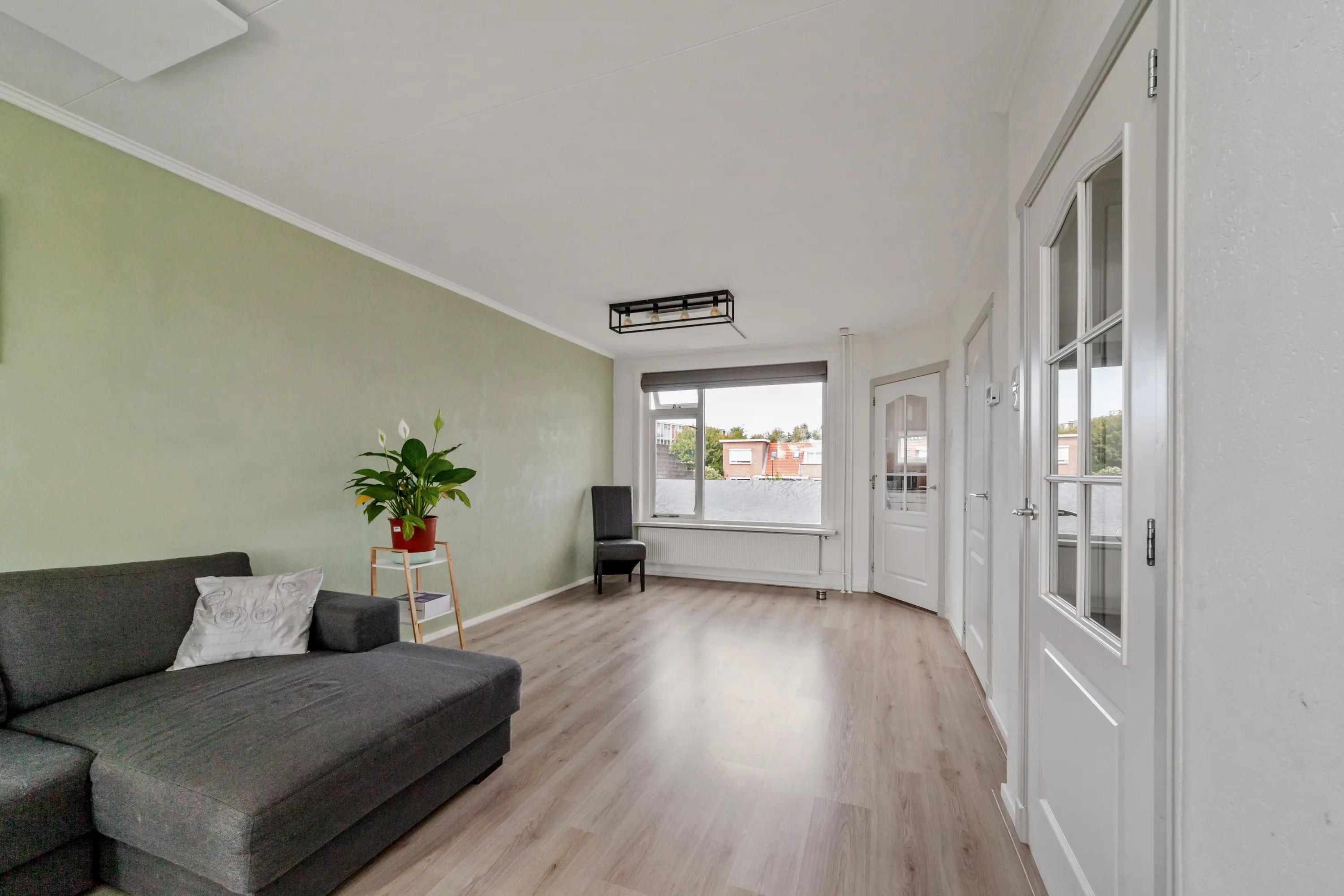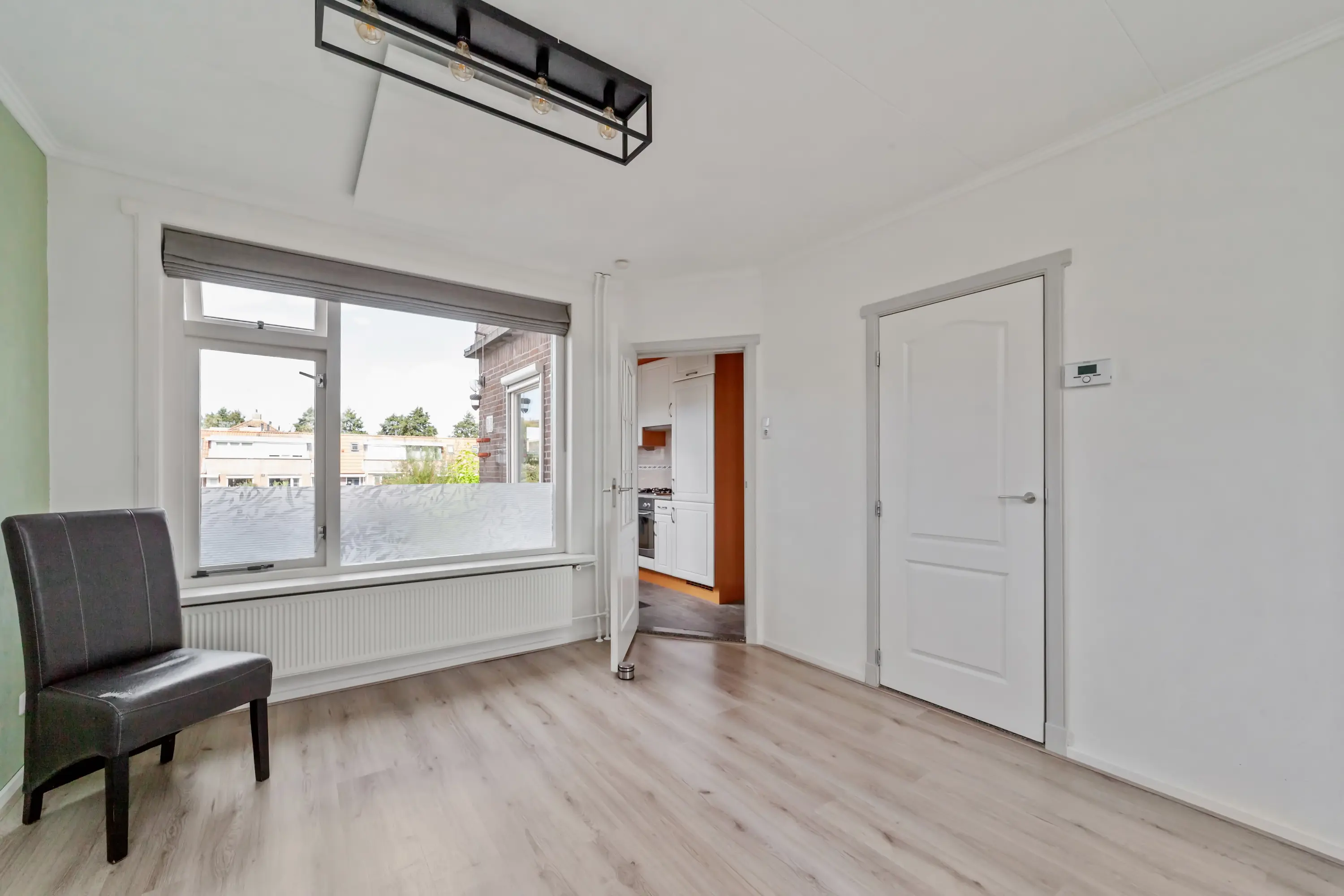 Indeling: entreehal met geheel betegeld toilet; lichte doorzonwoonkamer met laminaat vloer en provisiekast; aanbouw met lichte keuken voorzien van gaskookplaat, afzuigvlakscherm, oven, vaatwasmachine, koelkast + vriezer (2024), trapopgang en deur naar terras en tuin.