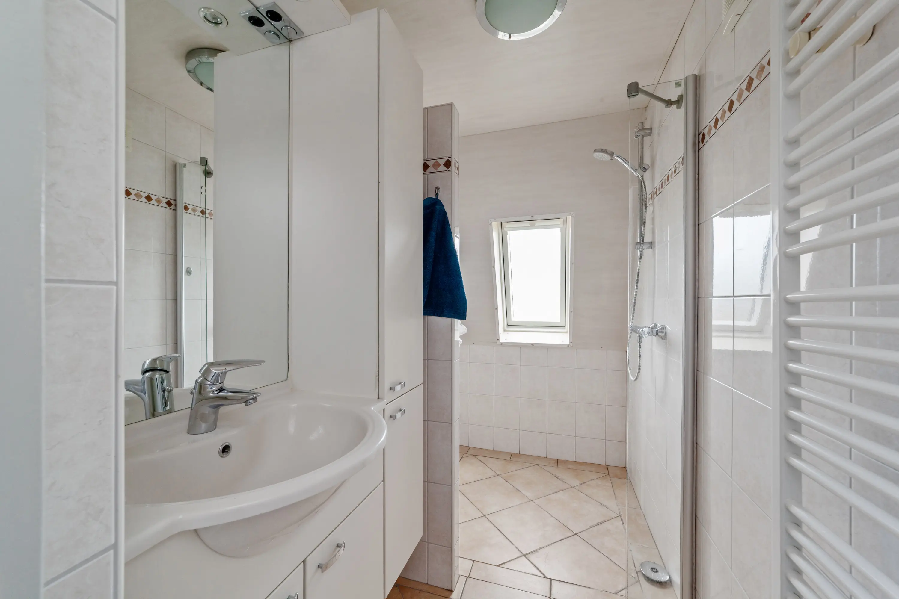 Op verdieping: overloop met luik met vlizotrap naar bergzolder; 3 slaapkamers; geheel betegelde badkamer met inloopdouche, wastafelmeubel, designradiator en mechanische ventilatie.