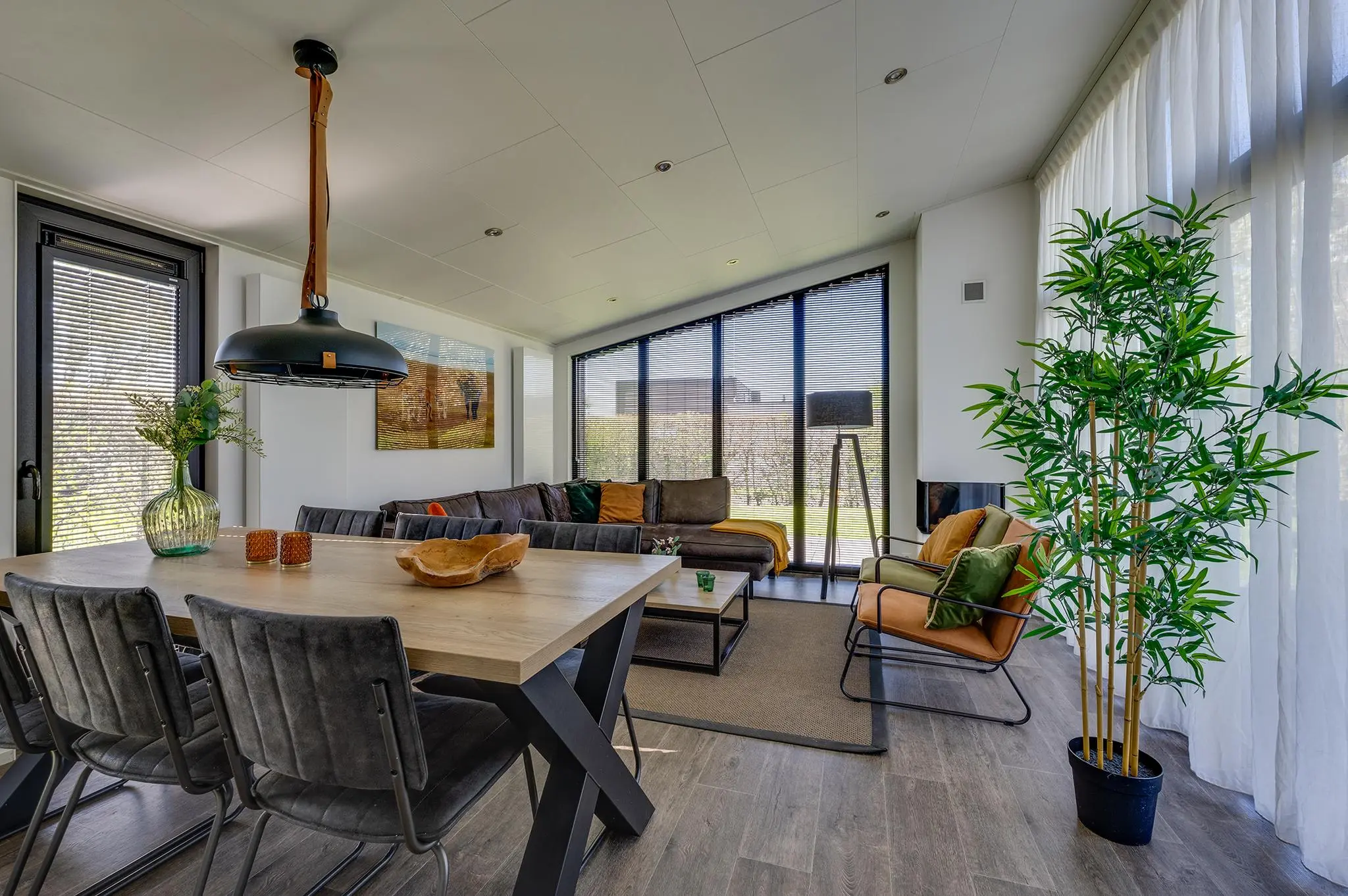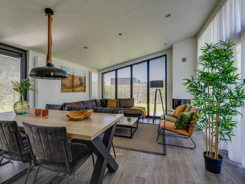 - Lichte woonkamer met grote raampartijen, sfeerhaard (gas) en schuifpui naar terras