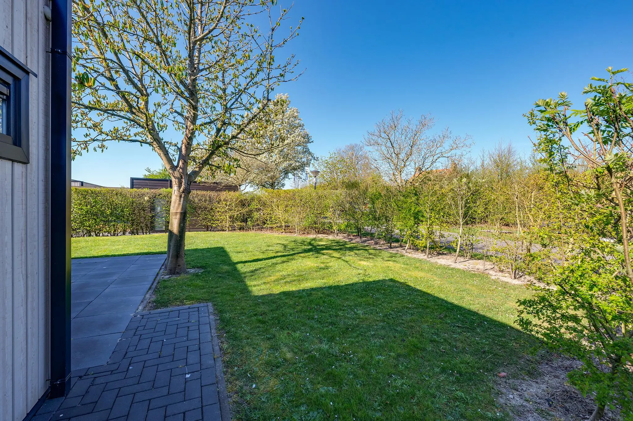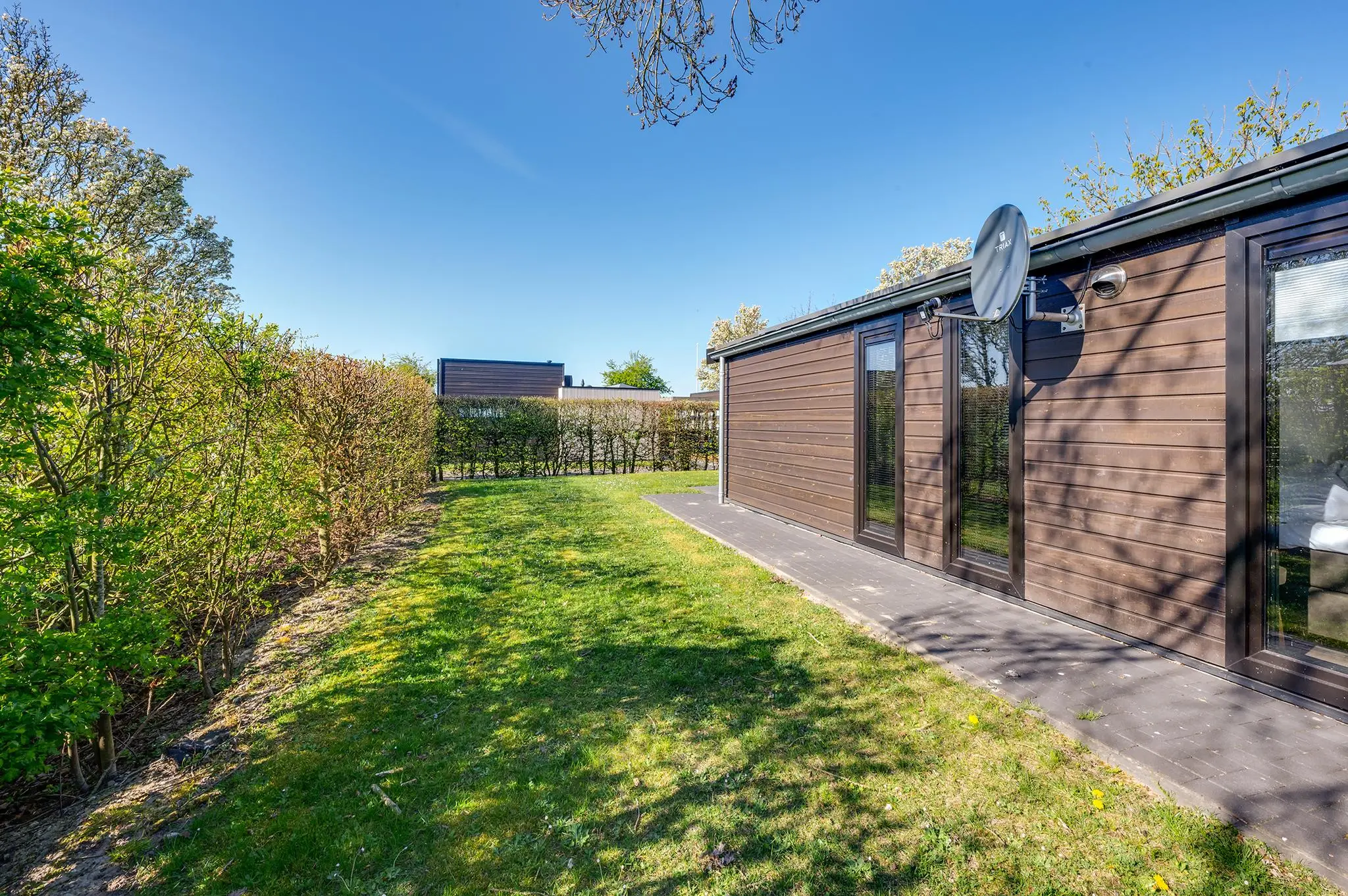 Aan de voorzijde van de woning is er gelegenheid tot parkeren op eigen terrein (2 auto's) en een nette houten berging. Rondom de woning is genoeg ruimte om zowel in de schaduw als in de zon te genieten van alle rust. Vanuit de woonkamer is het ruime terras met veel privacy toegankelijk.