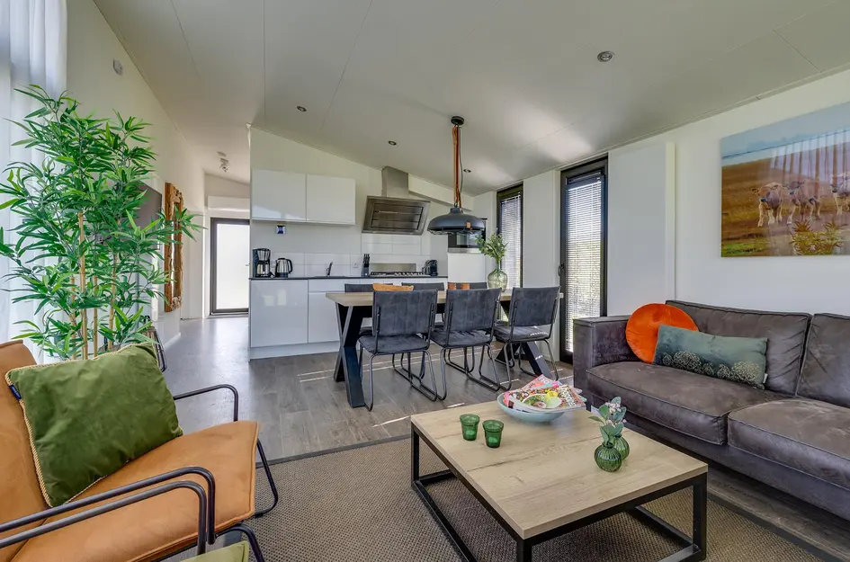 - Open keuken voorzien van 5-pits gaskookplaat, afzuigkap, koelkast met vriesvak, combi-oven en vaatwasmachine