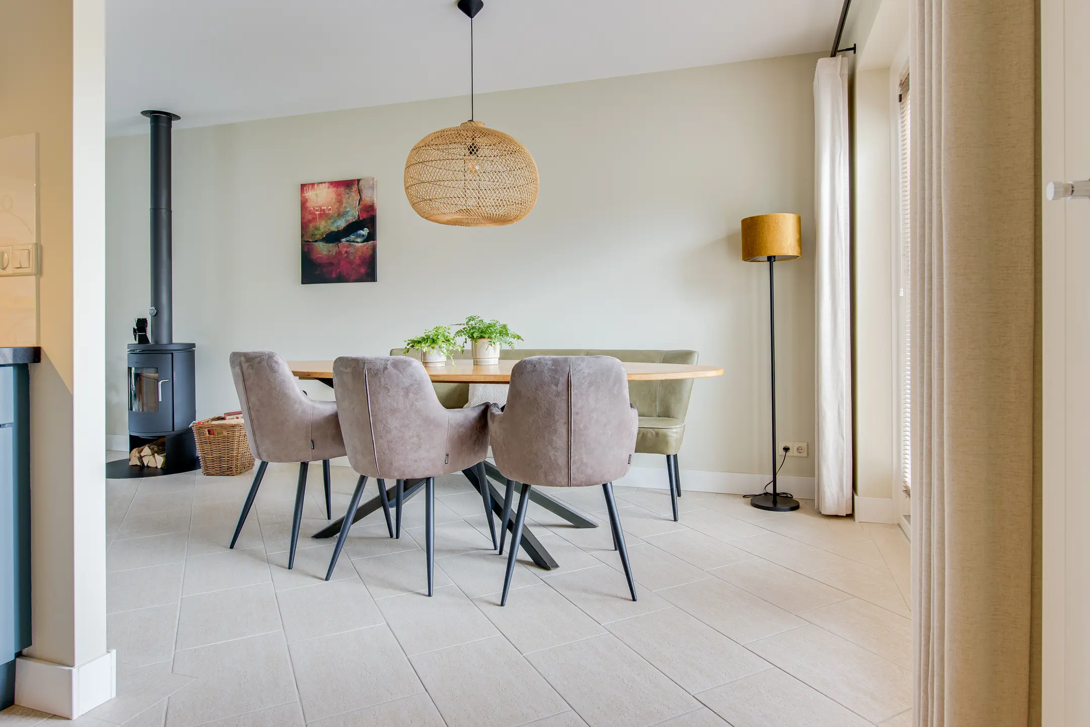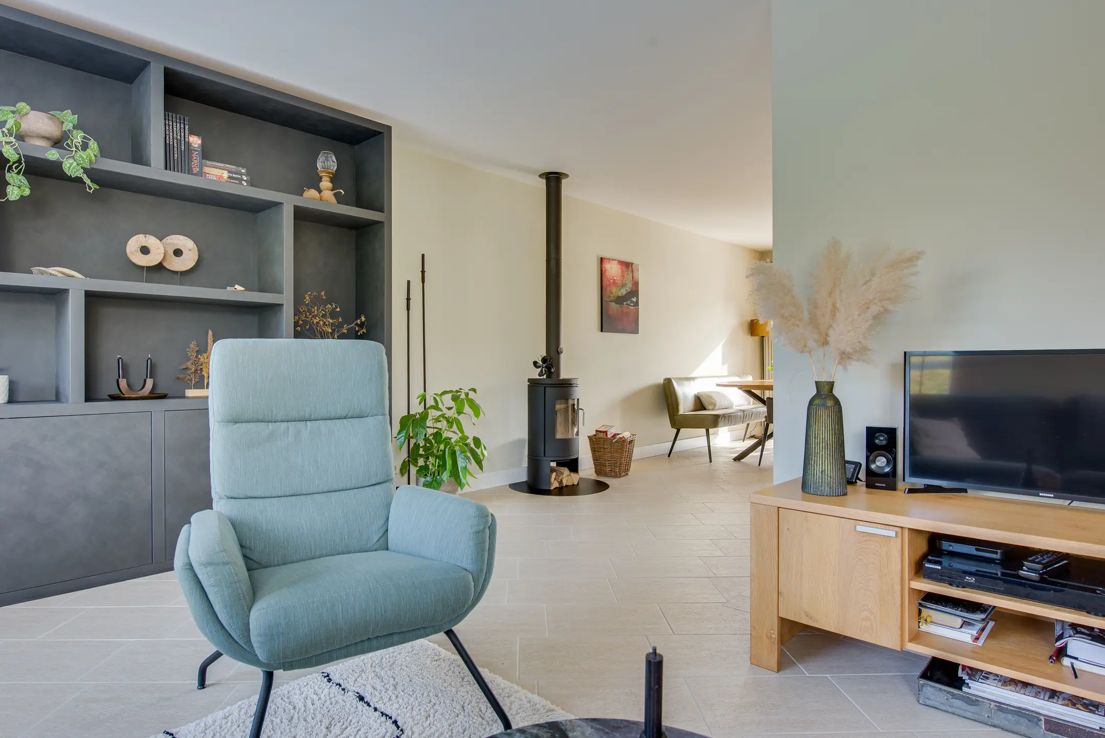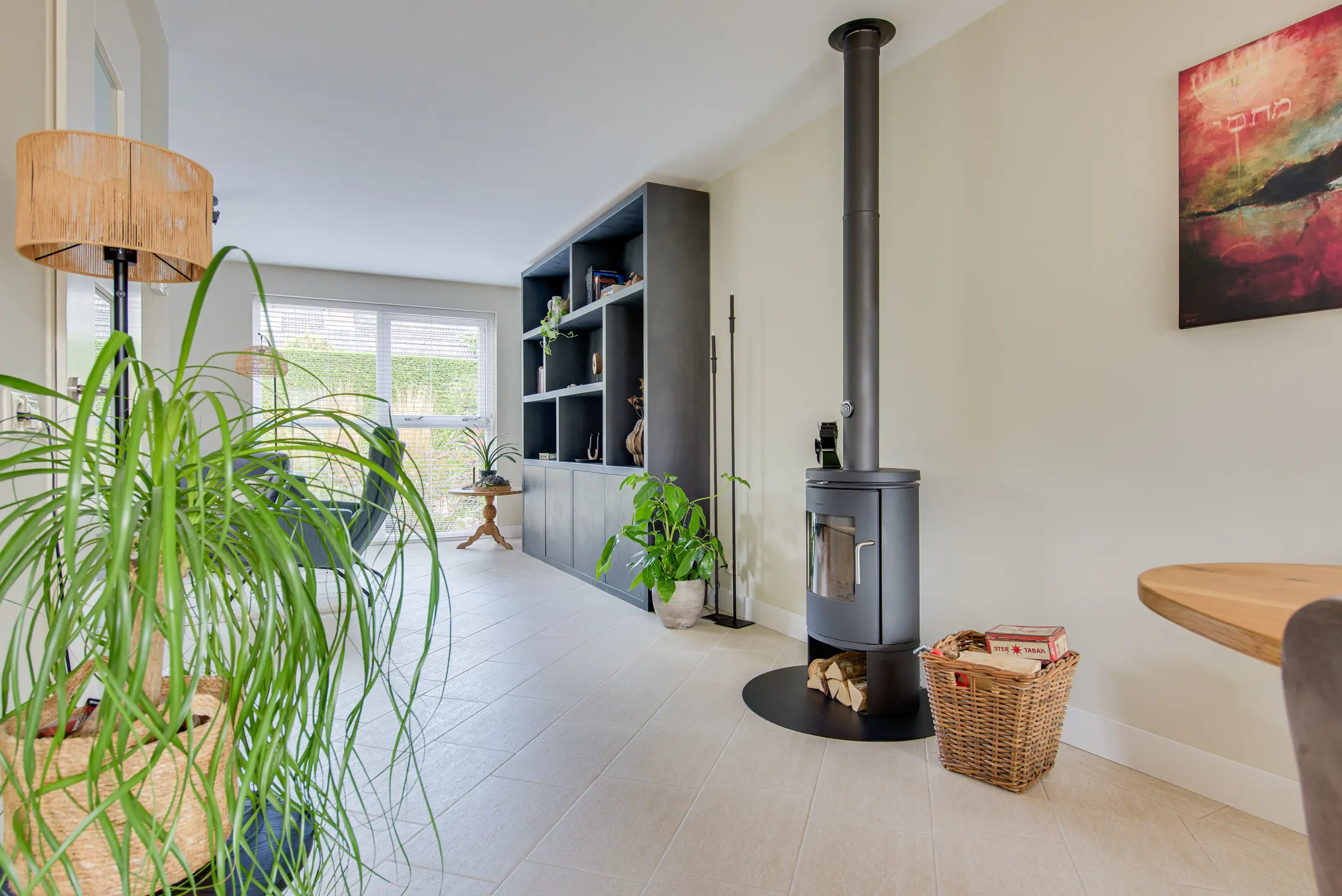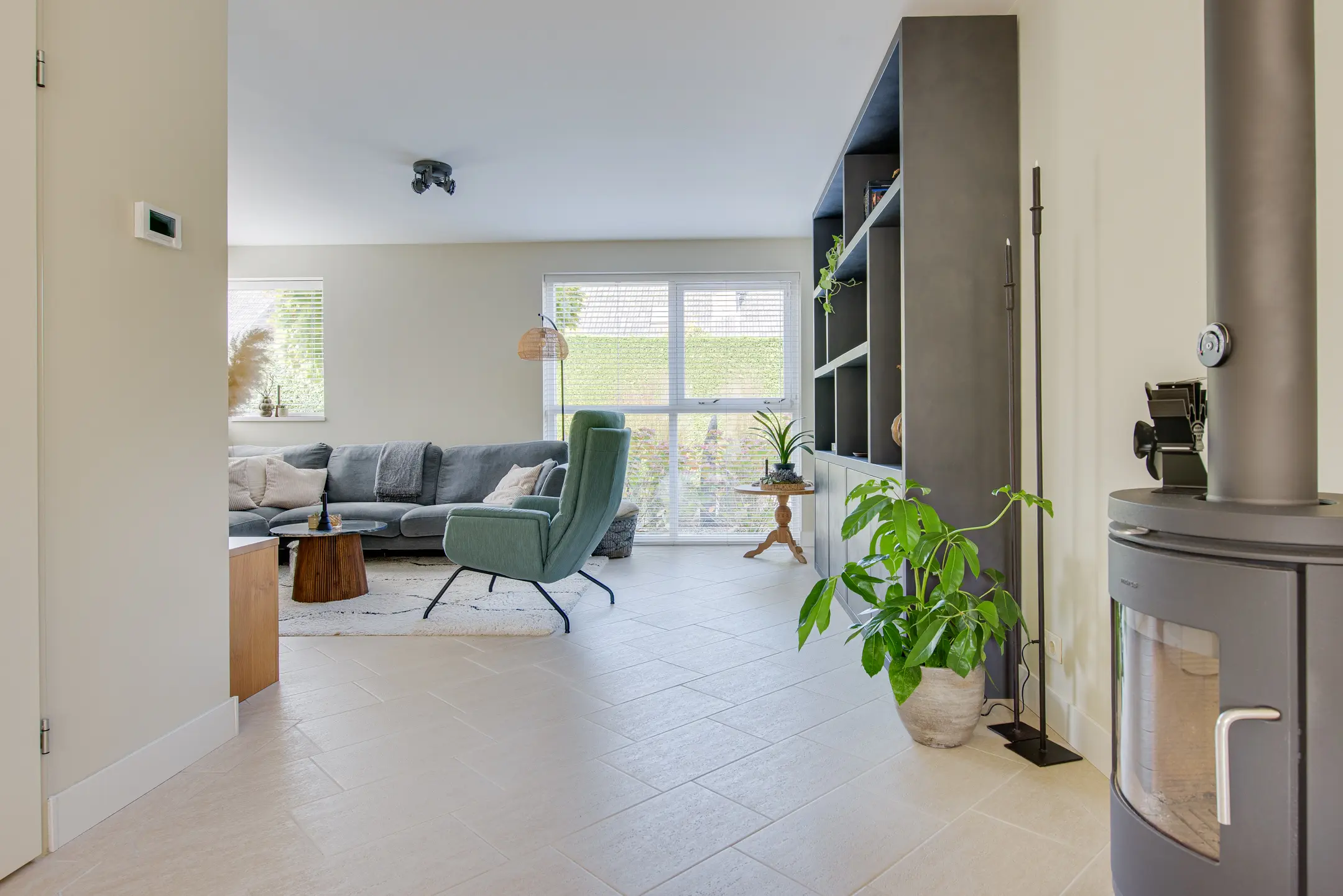 - L-vormige woonkamer met houtkachel en terrasdeuren naar achtertuin