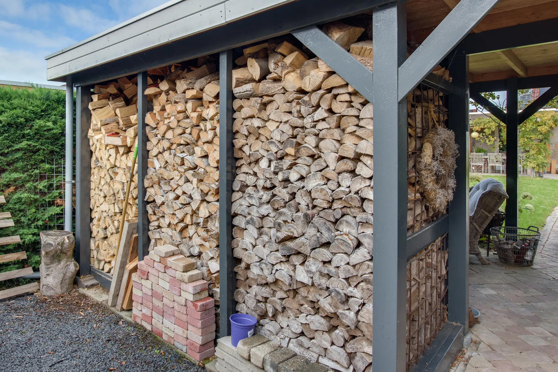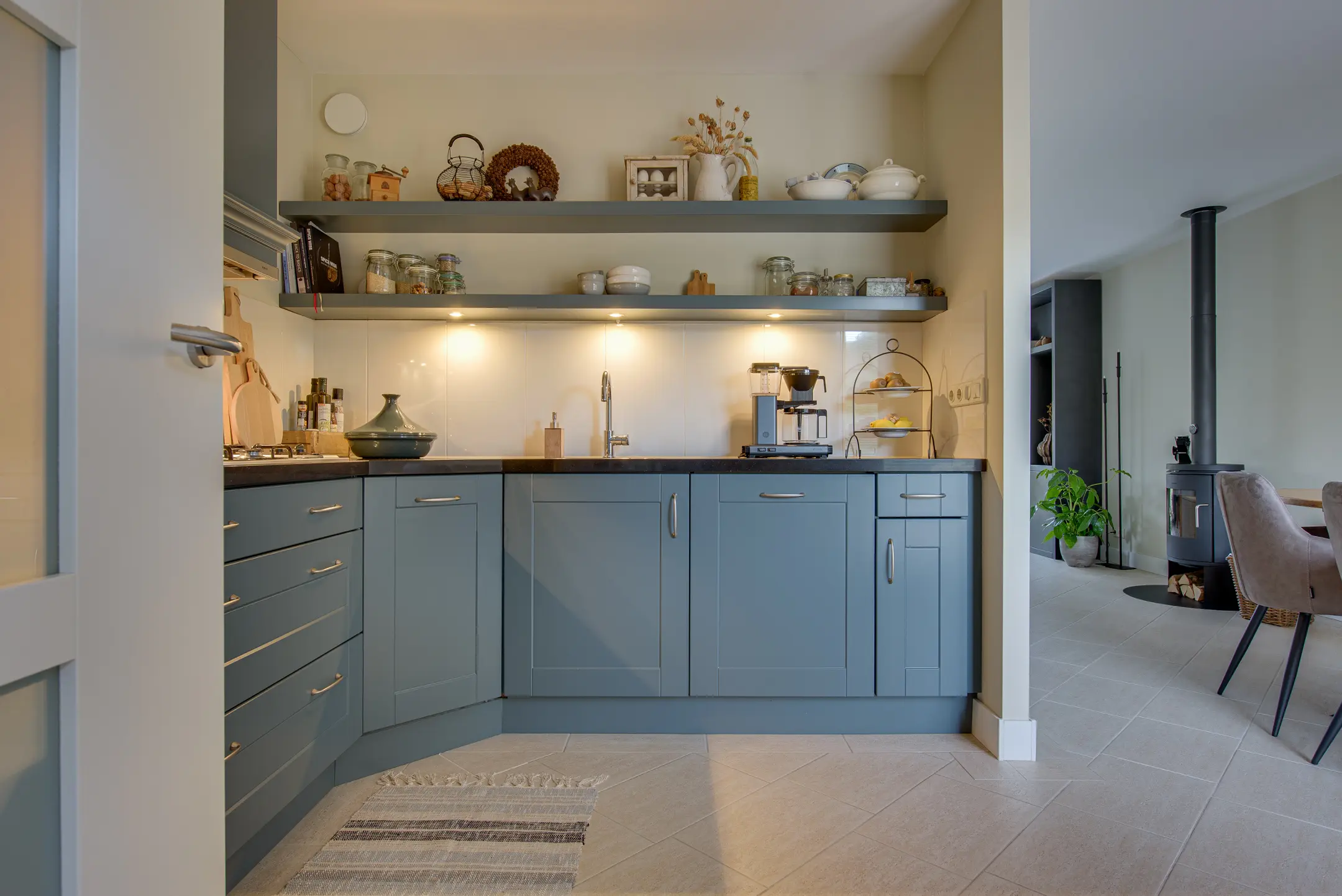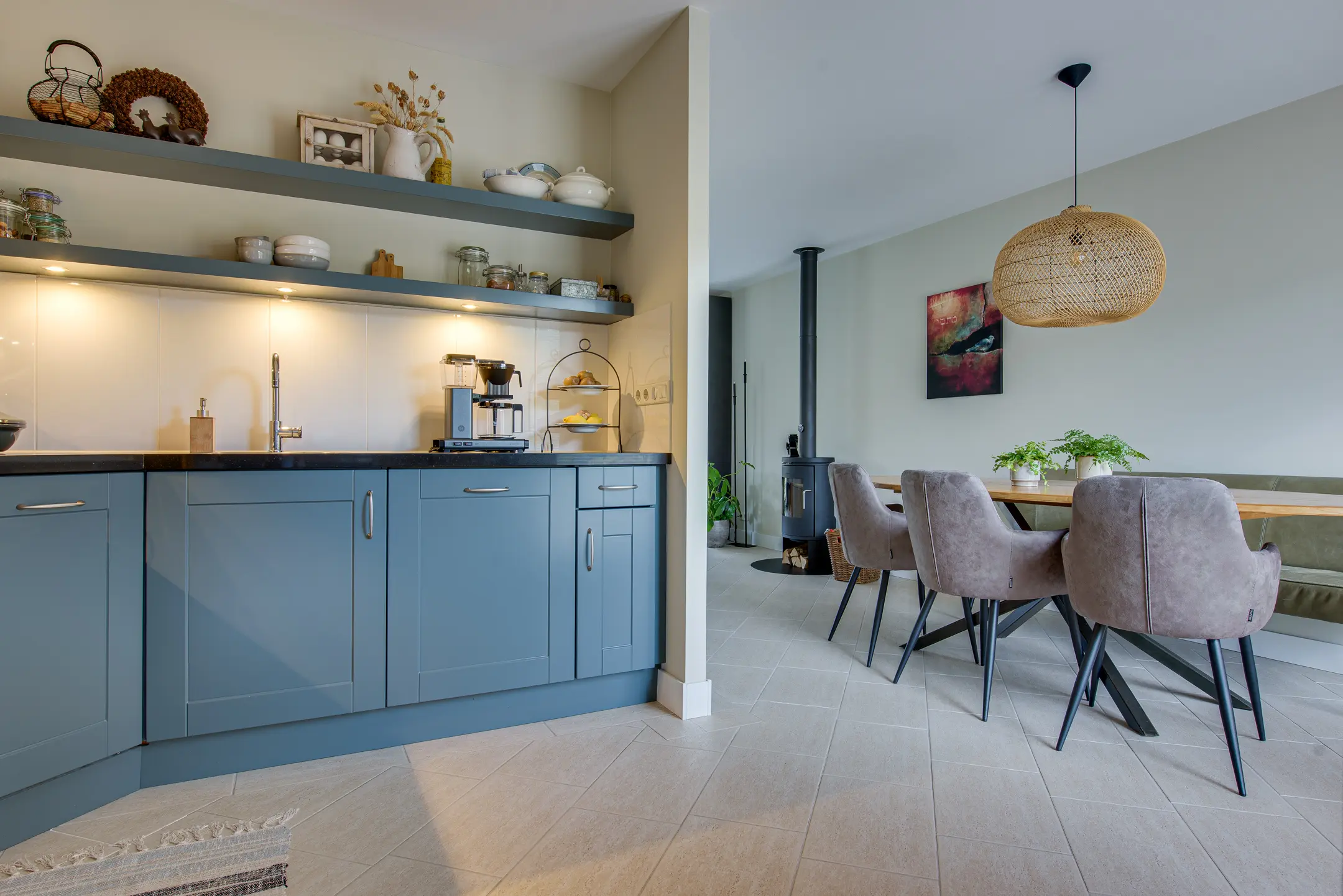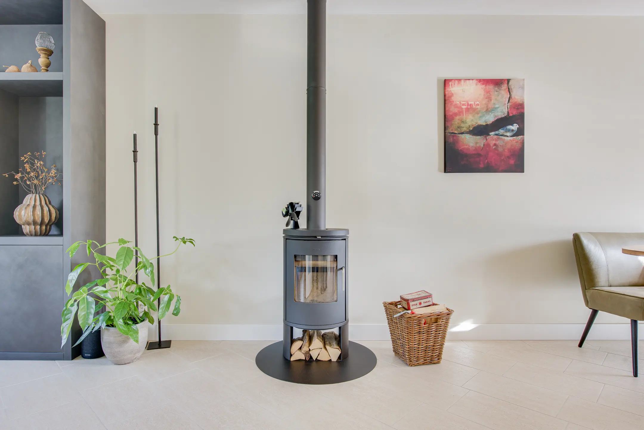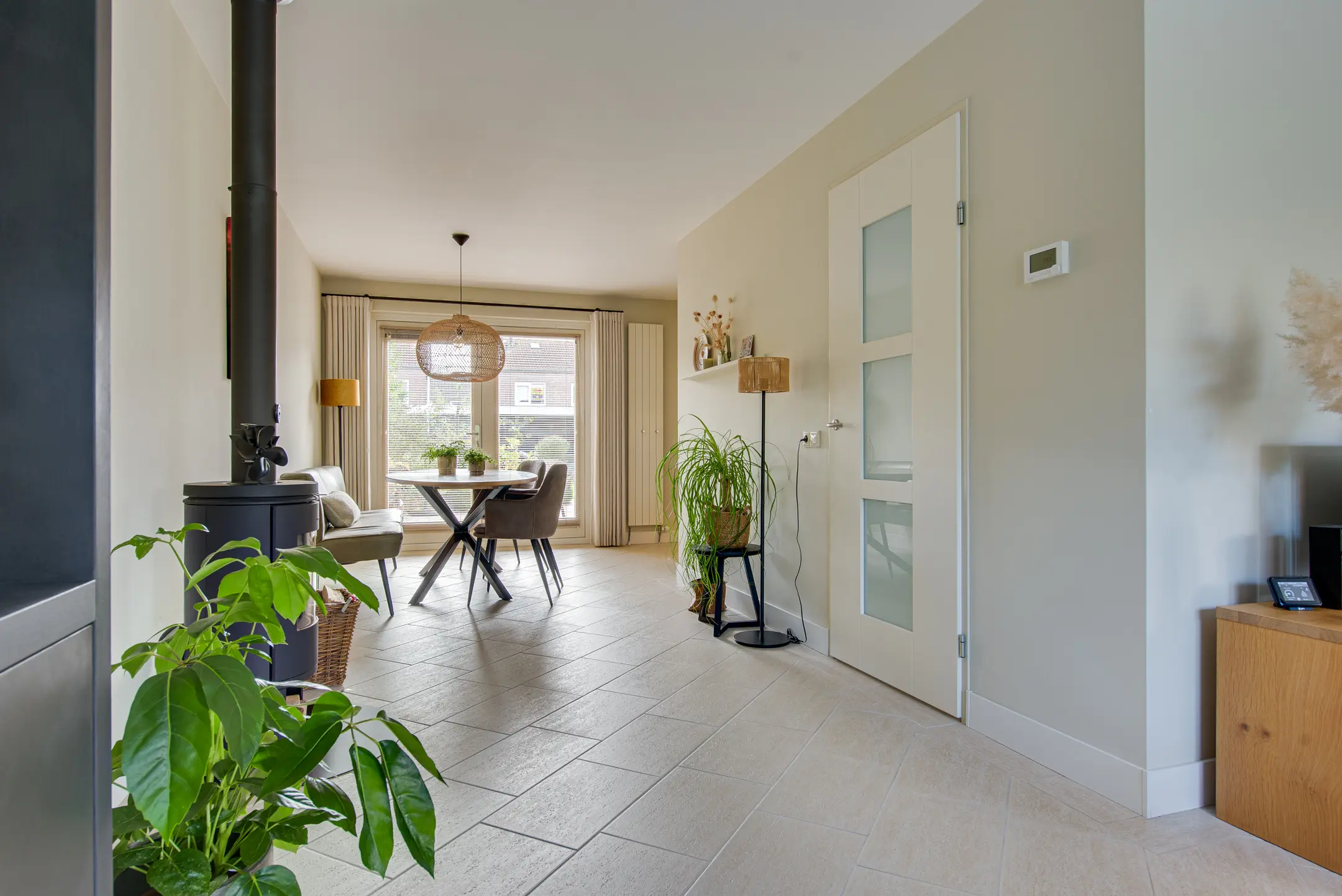 - L-vormige woonkamer met houtkachel en terrasdeuren naar achtertuin