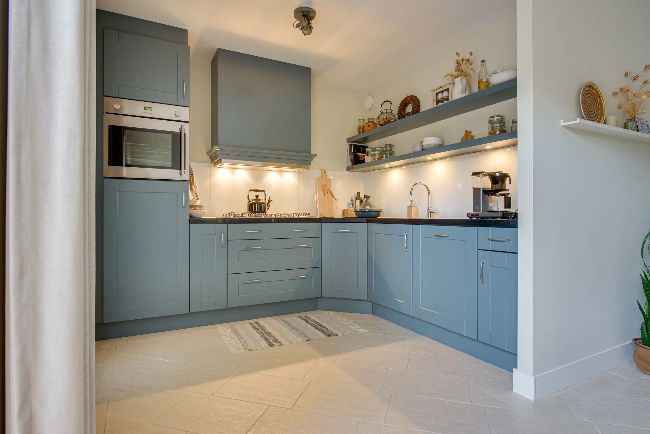 - Open keuken aan achterzijde met nette keuken in hoekopstelling voorzien van diverse inbouwapparatuur en stenen aanrechtblad