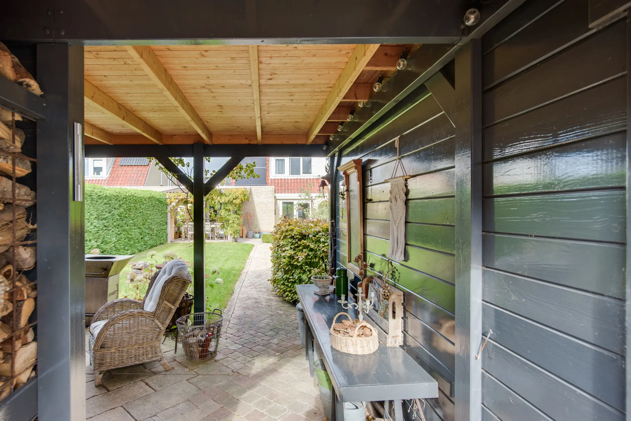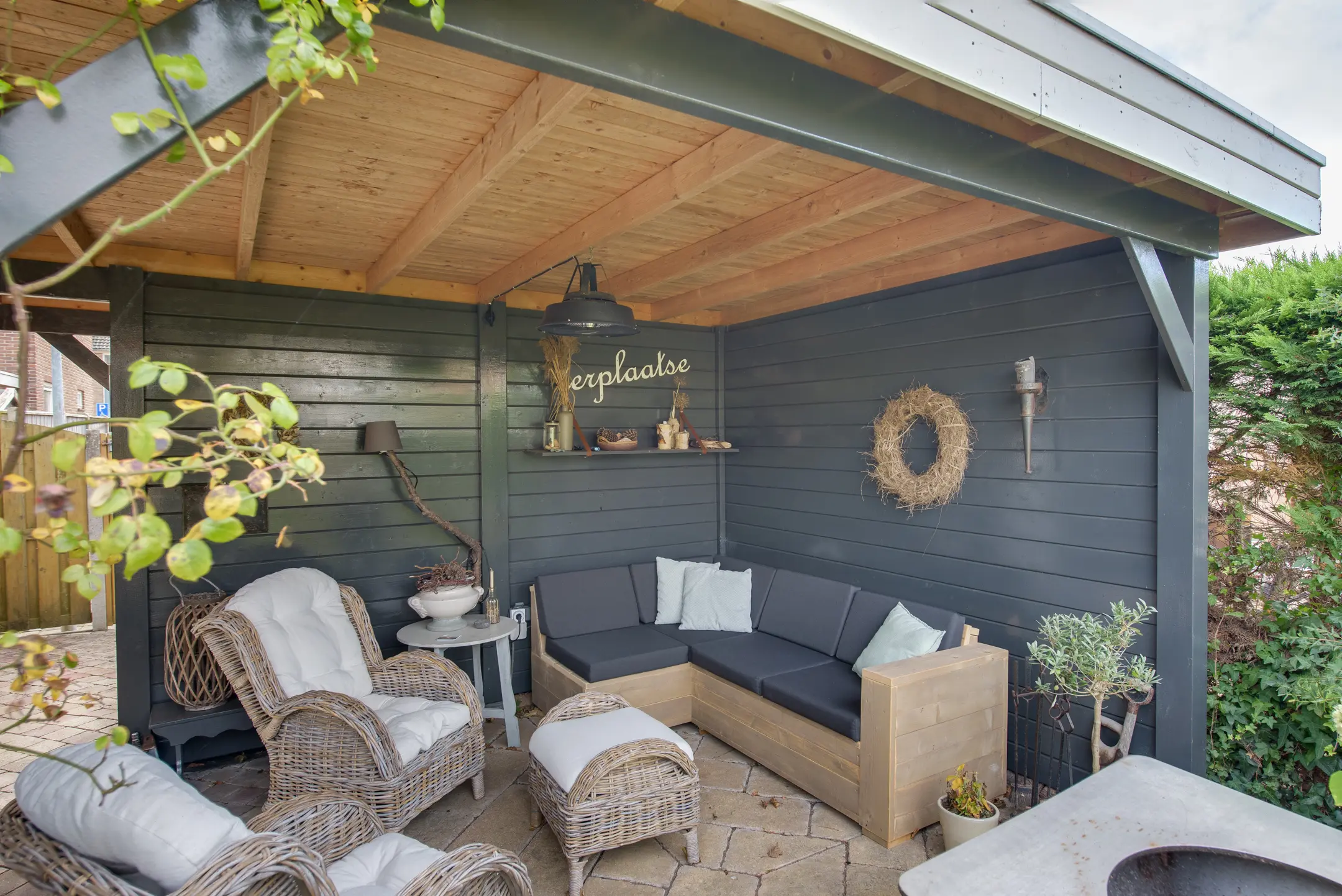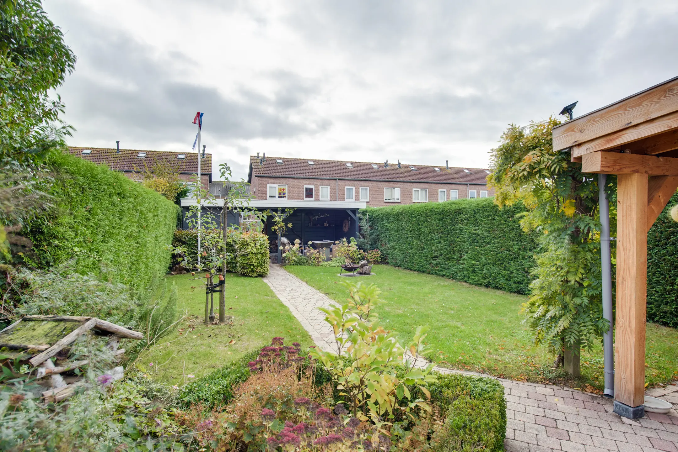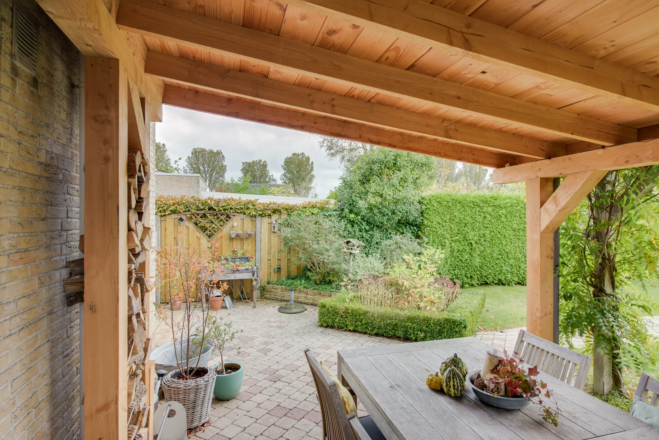 De achtertuin is op het zuiden gelegen en is achterom bereikbaar via een poort. De tuin beschikt over diverse terrassen en gazon. In de achtertuin is een ruime houten berging met gezellige overkapping en houtopslag aanwezig. Ook aan de achtergevel is een houten overkapping bevestigd.