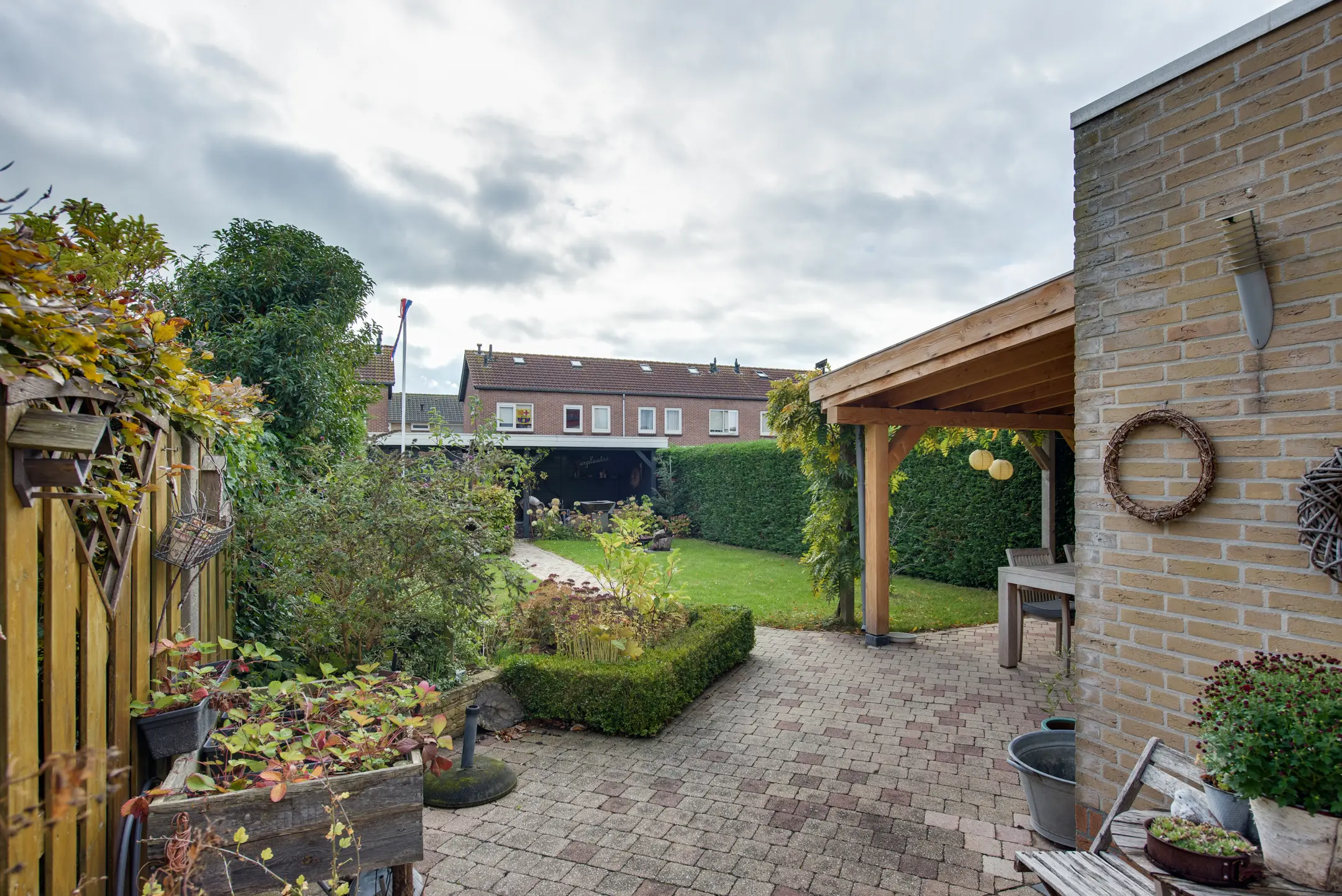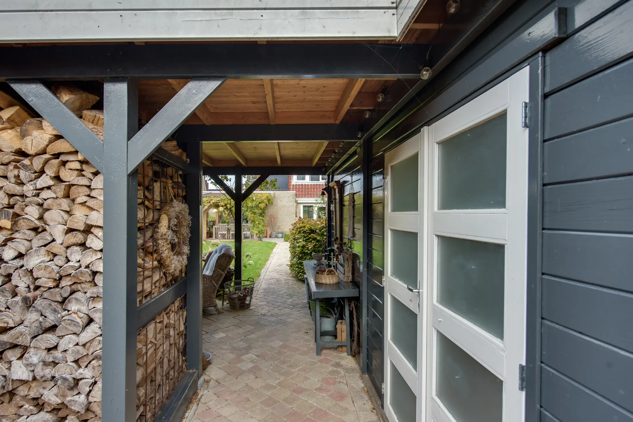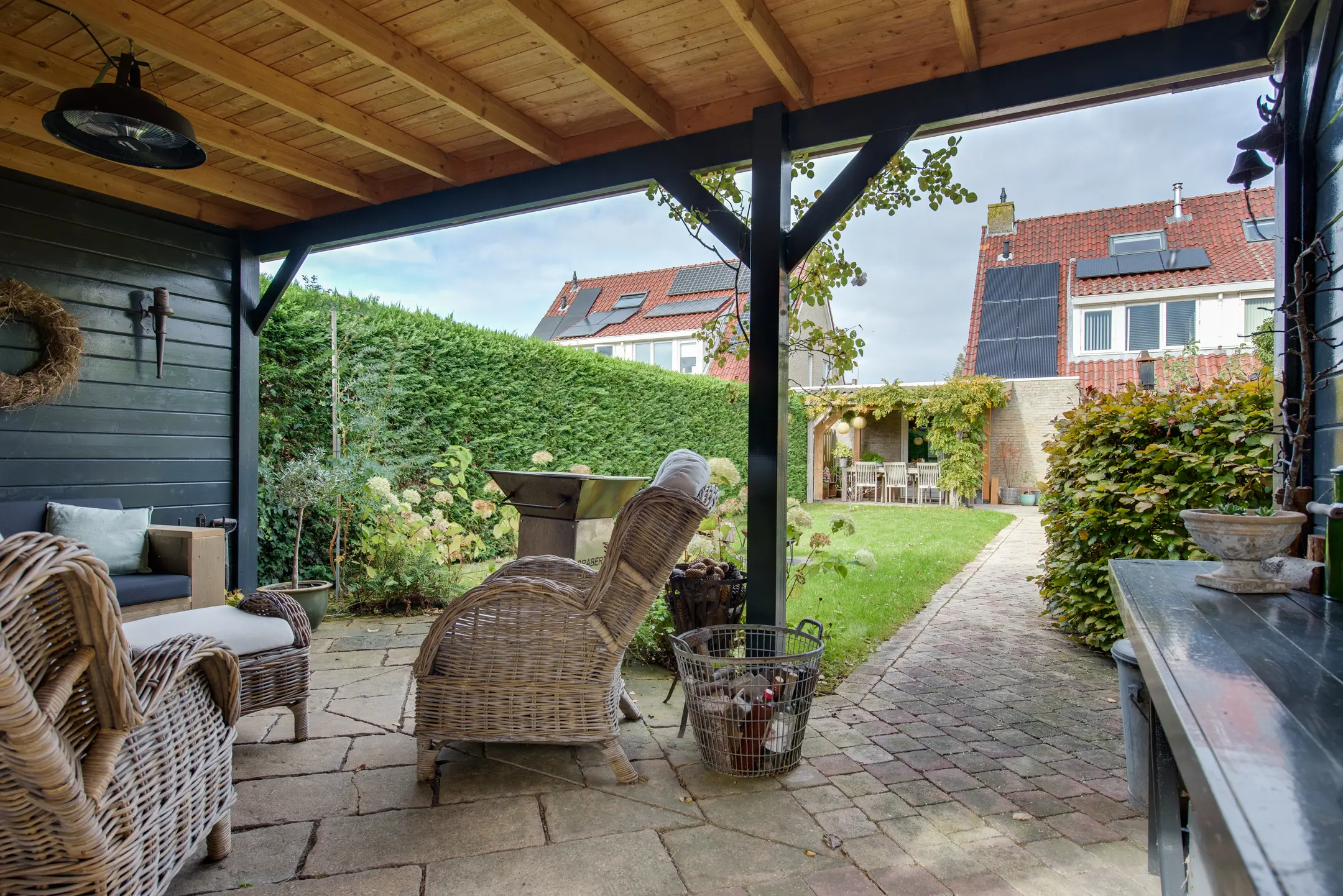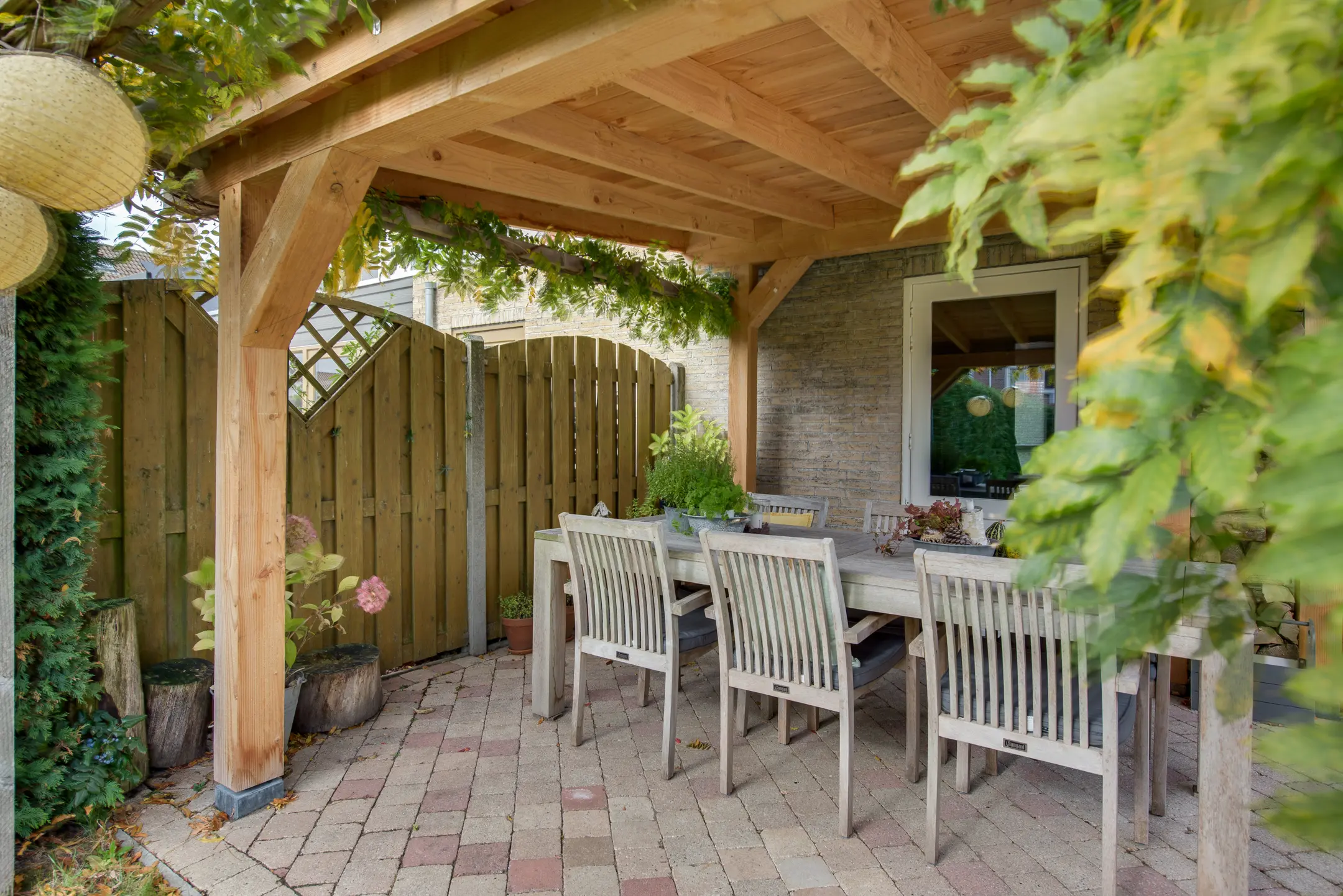 De achtertuin is op het zuiden gelegen en is achterom bereikbaar via een poort. De tuin beschikt over diverse terrassen en gazon. In de achtertuin is een ruime houten berging met gezellige overkapping en houtopslag aanwezig. Ook aan de achtergevel is een houten overkapping bevestigd.