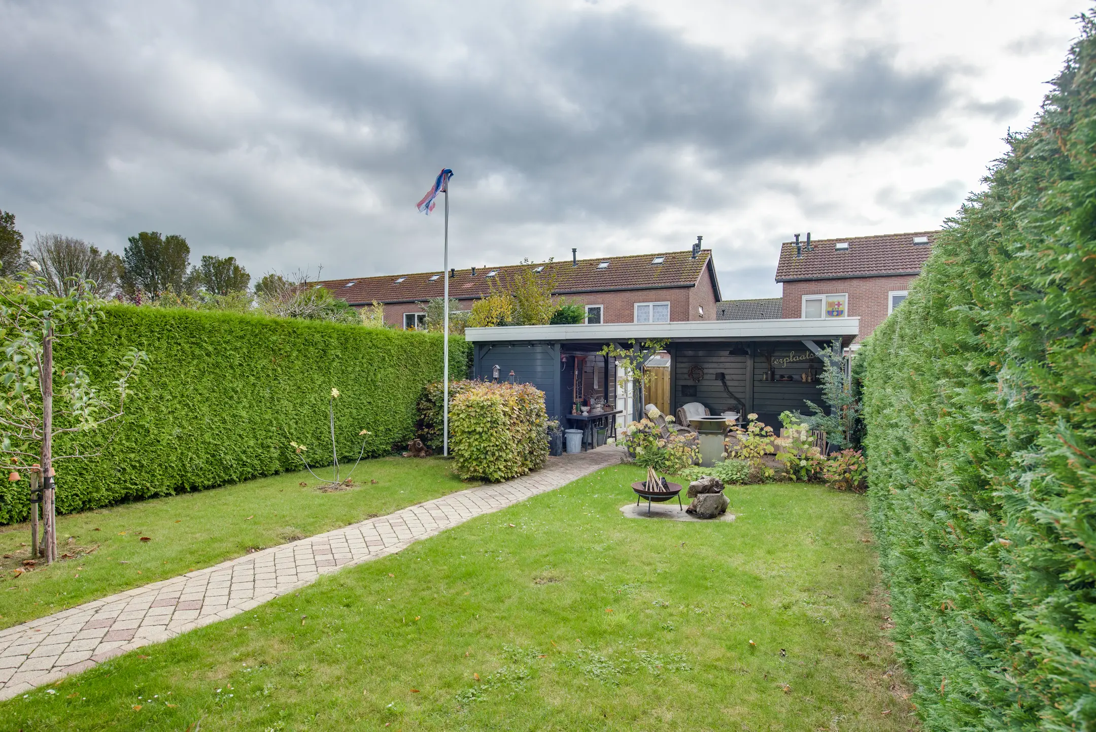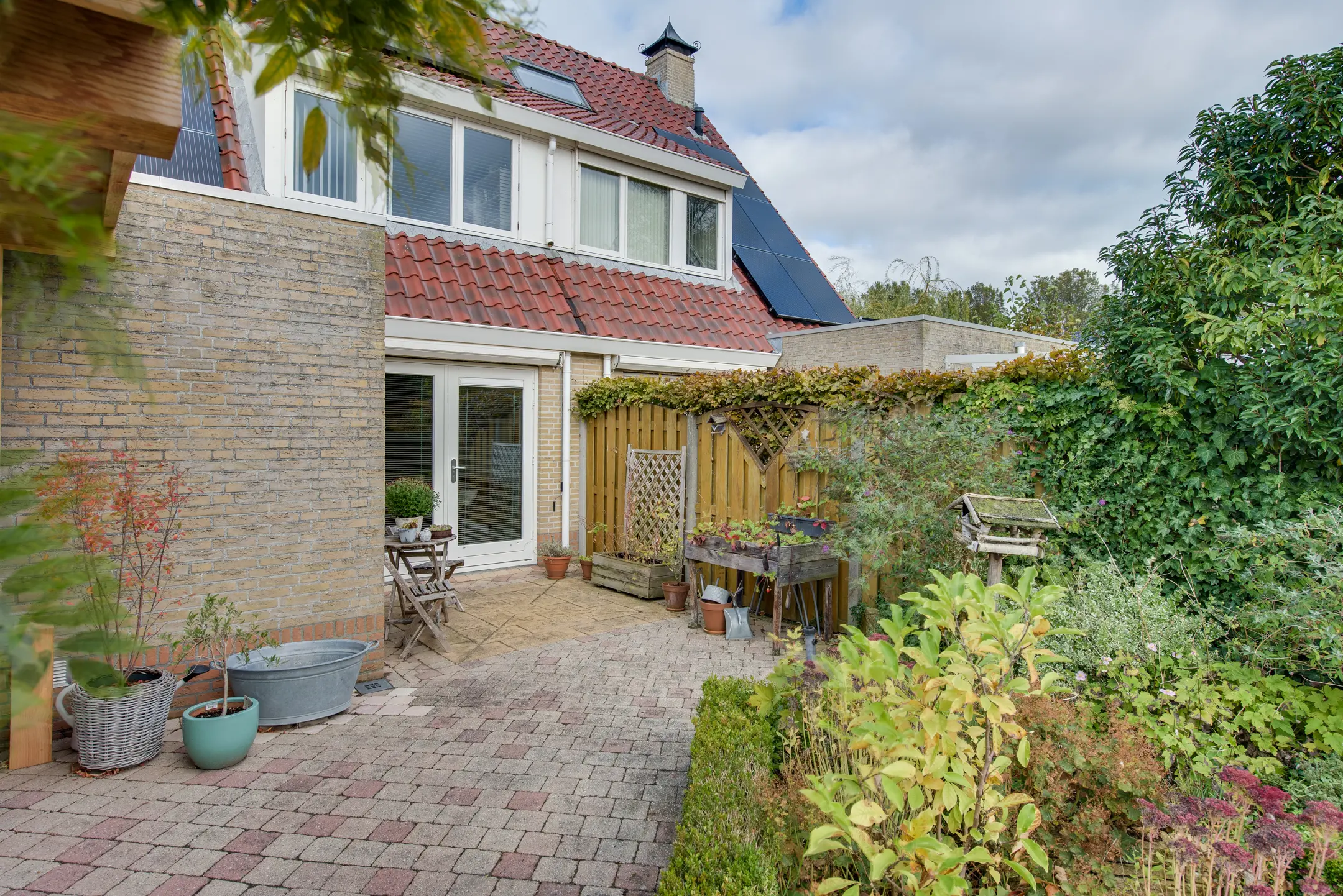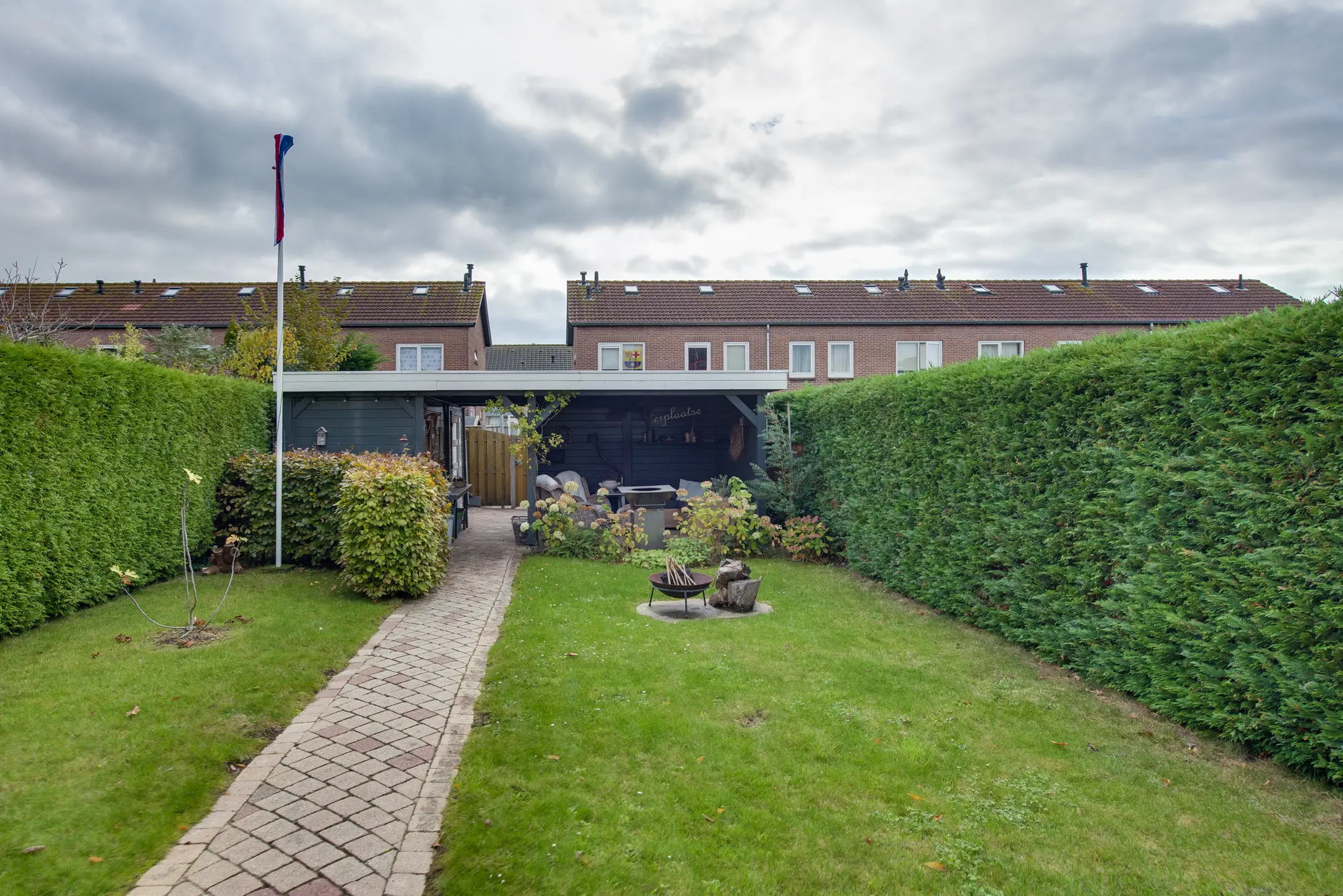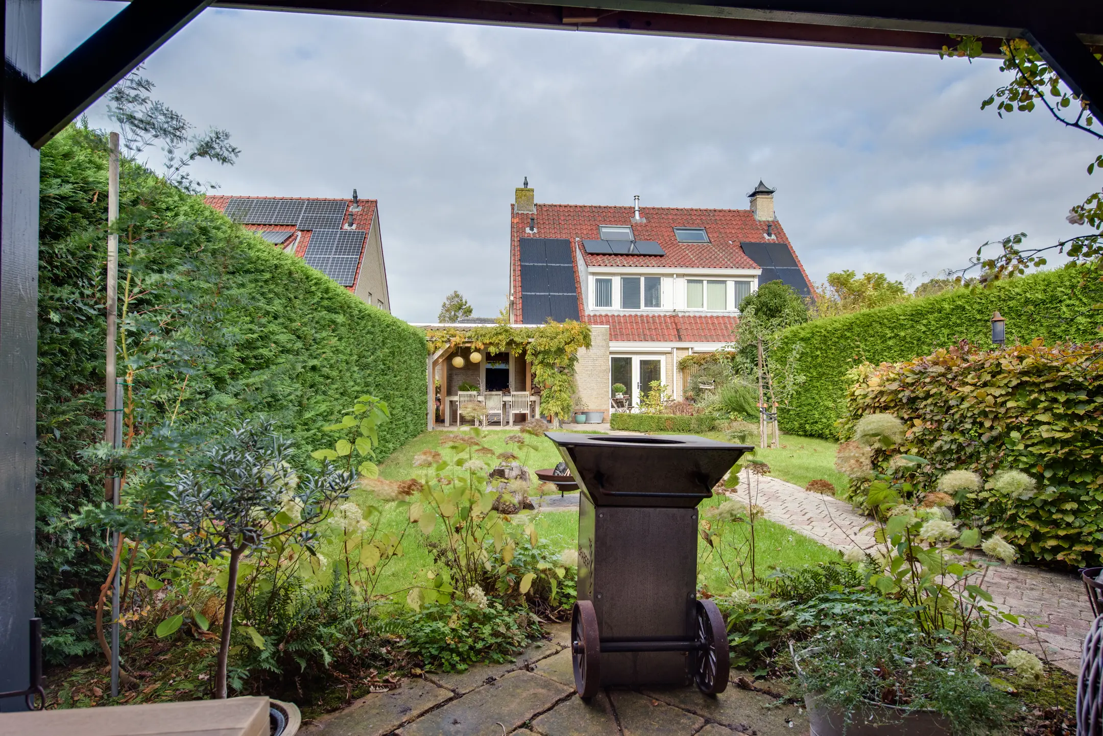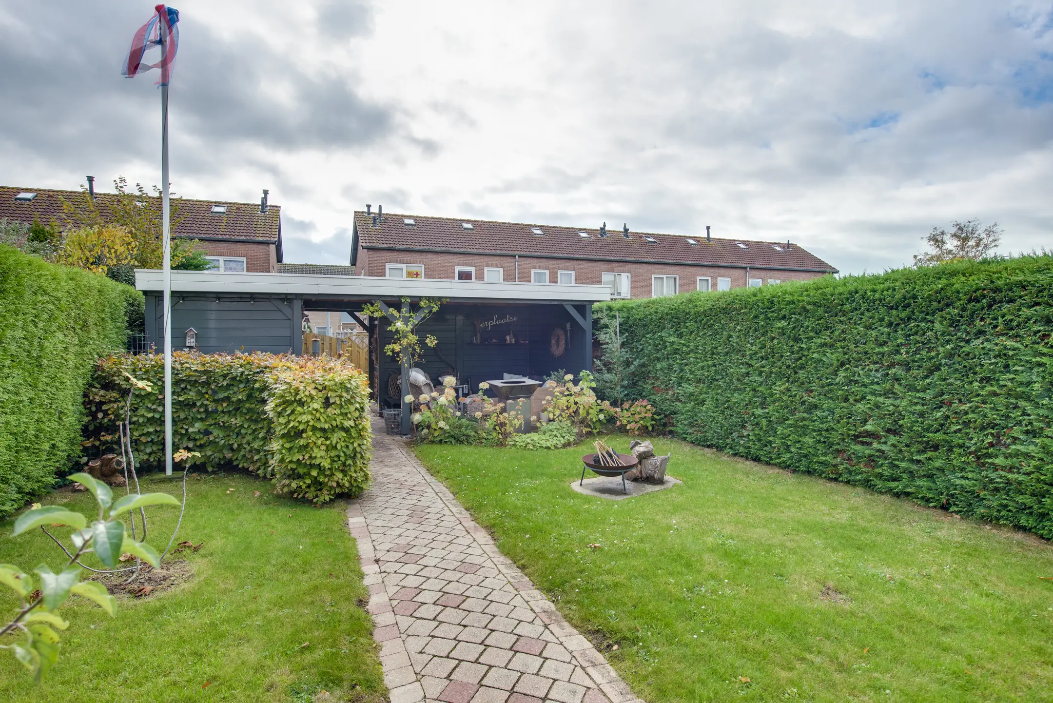 De achtertuin is op het zuiden gelegen en is achterom bereikbaar via een poort. De tuin beschikt over diverse terrassen en gazon. In de achtertuin is een ruime houten berging met gezellige overkapping en houtopslag aanwezig. Ook aan de achtergevel is een houten overkapping bevestigd.