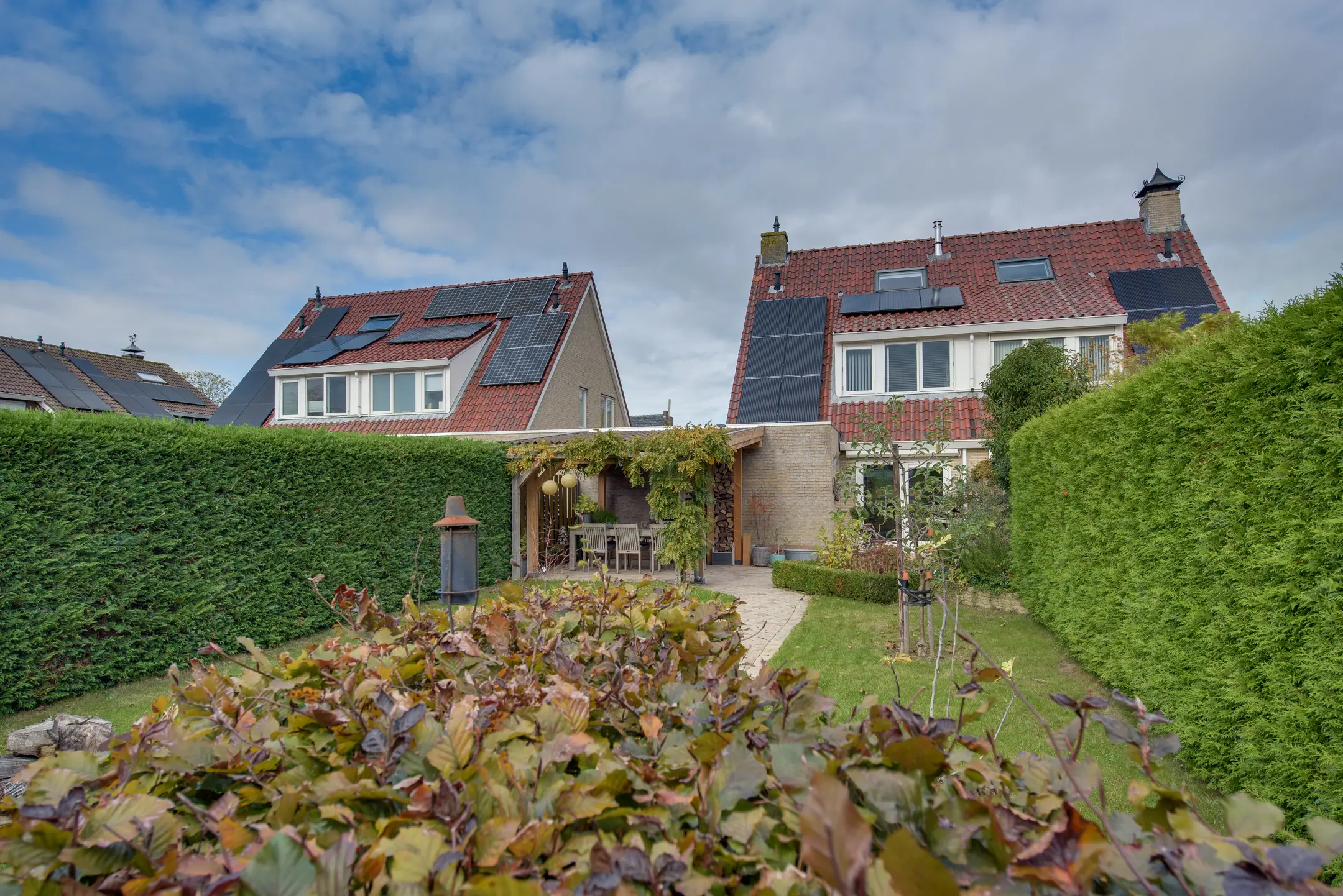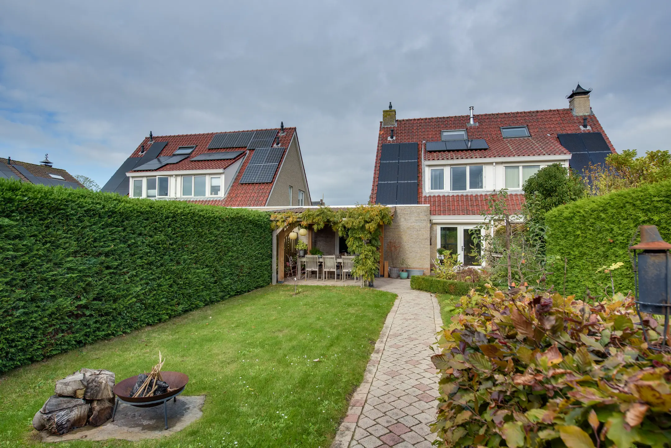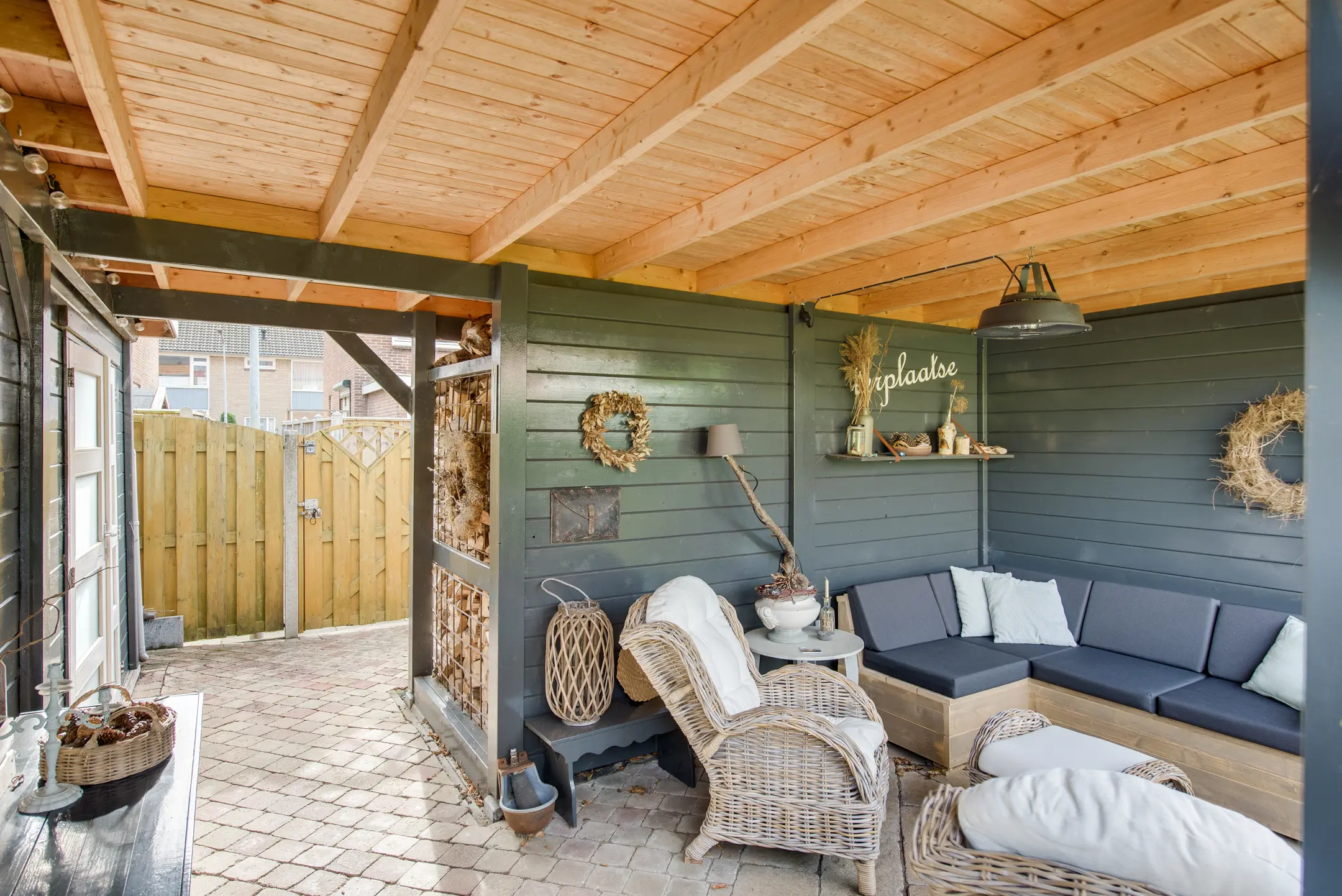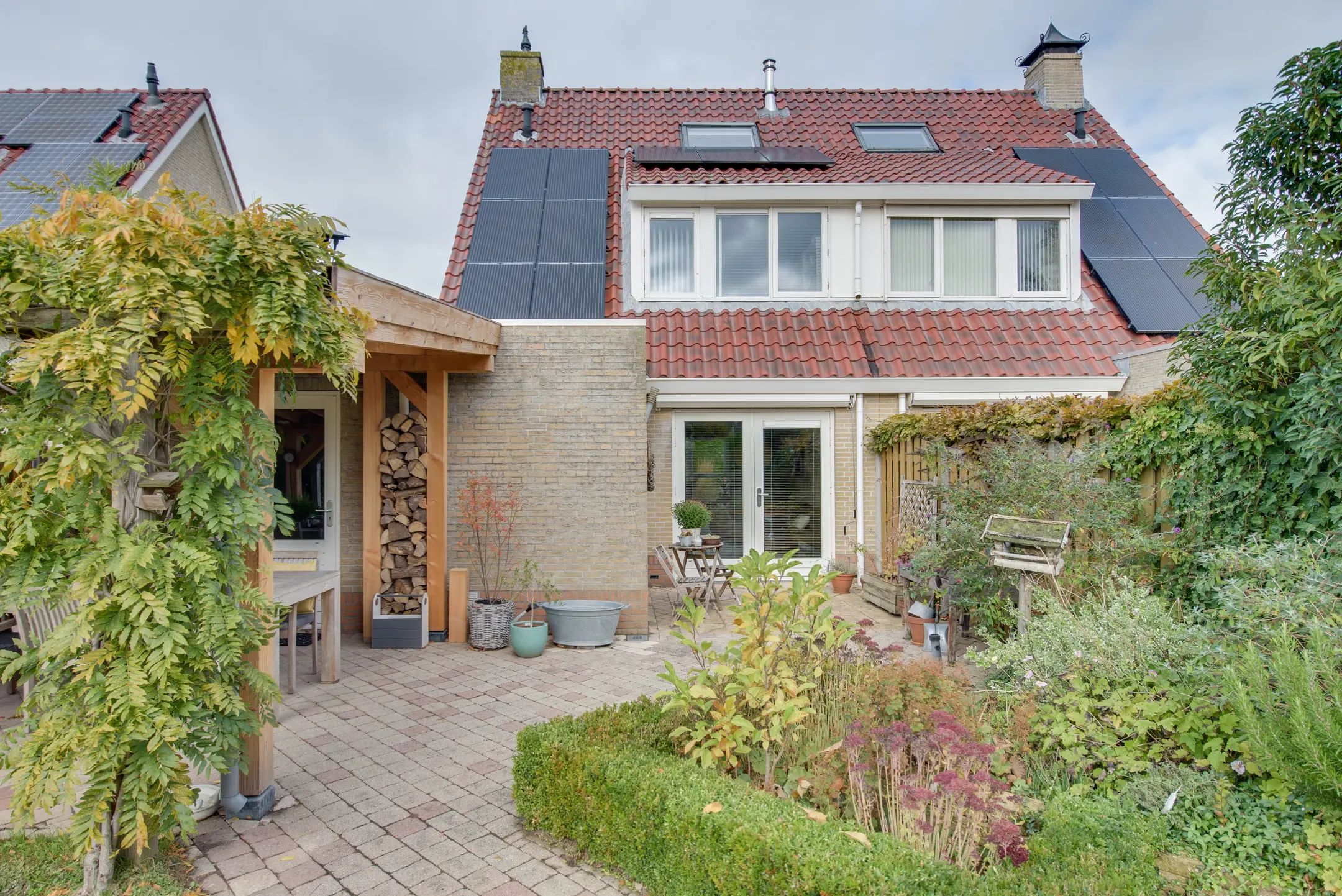 De achtertuin is op het zuiden gelegen en is achterom bereikbaar via een poort. De tuin beschikt over diverse terrassen en gazon. In de achtertuin is een ruime houten berging met gezellige overkapping en houtopslag aanwezig. Ook aan de achtergevel is een houten overkapping bevestigd.