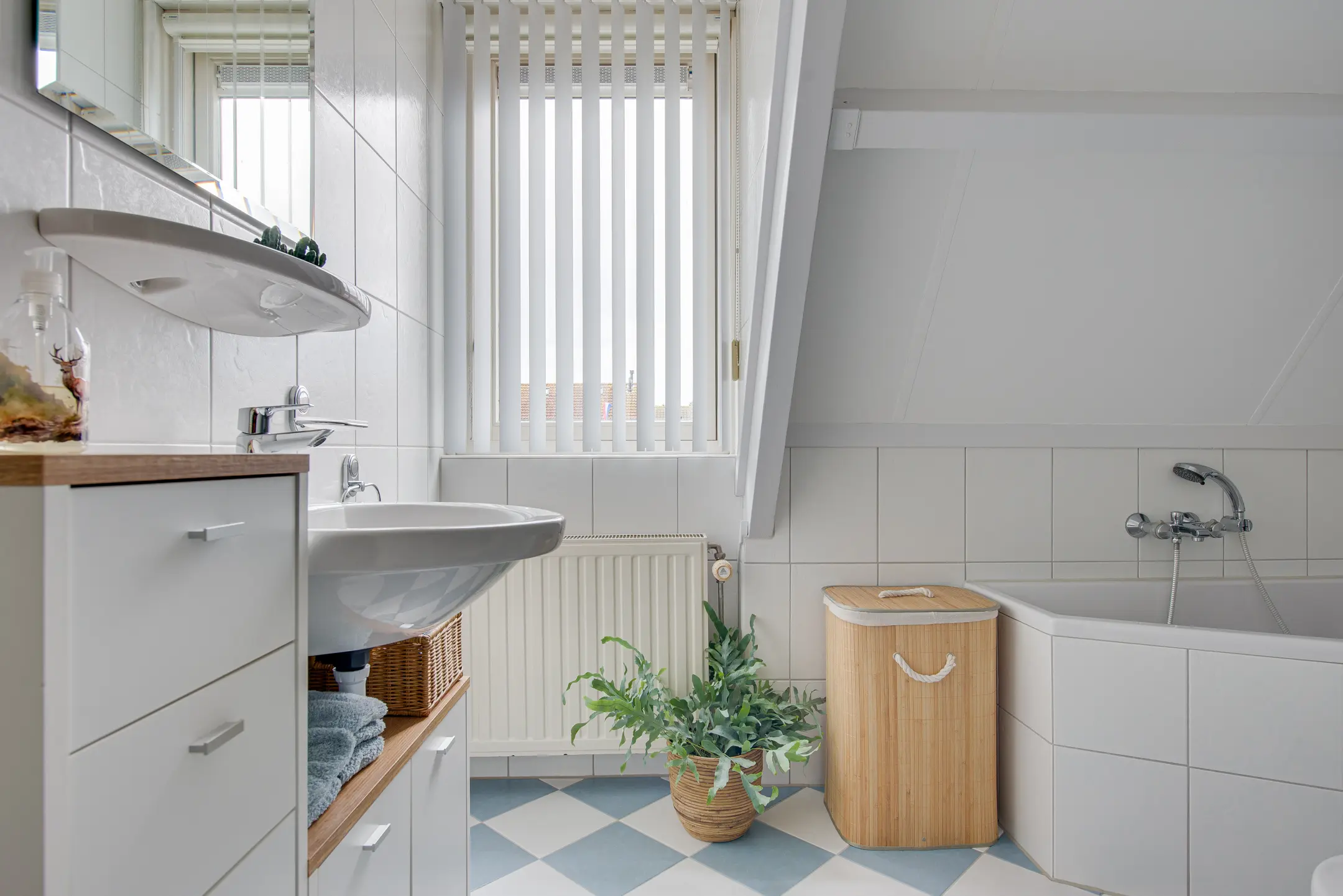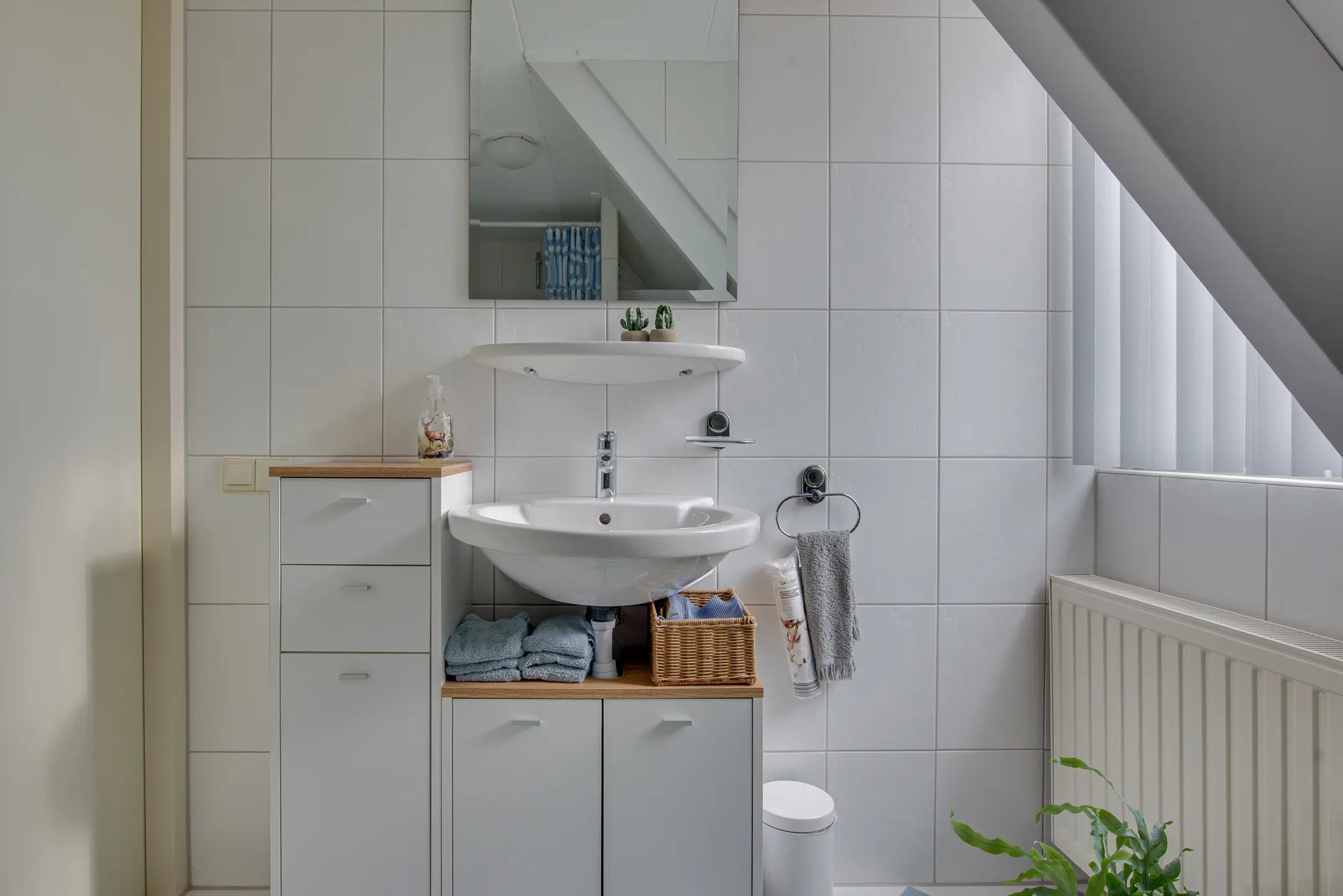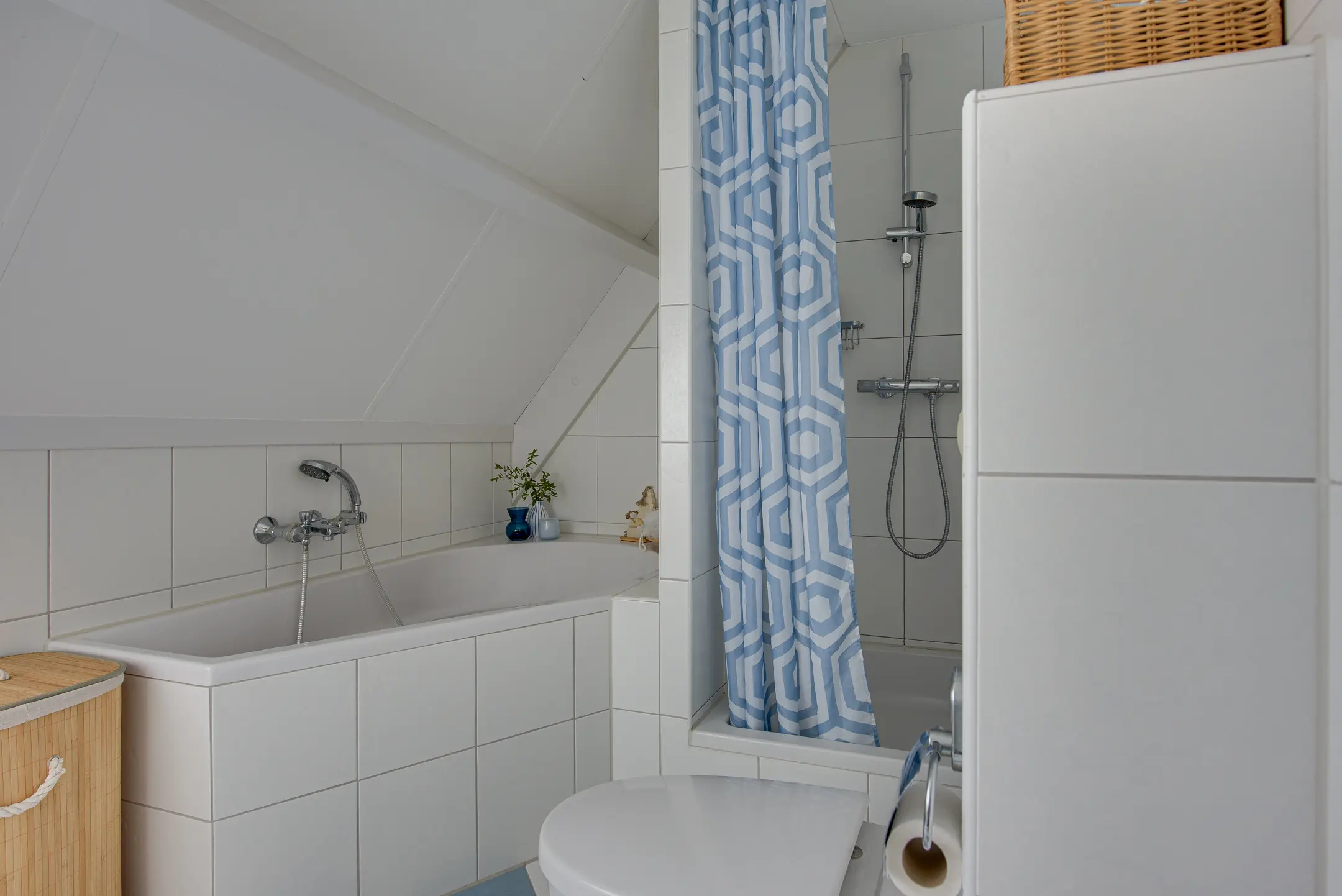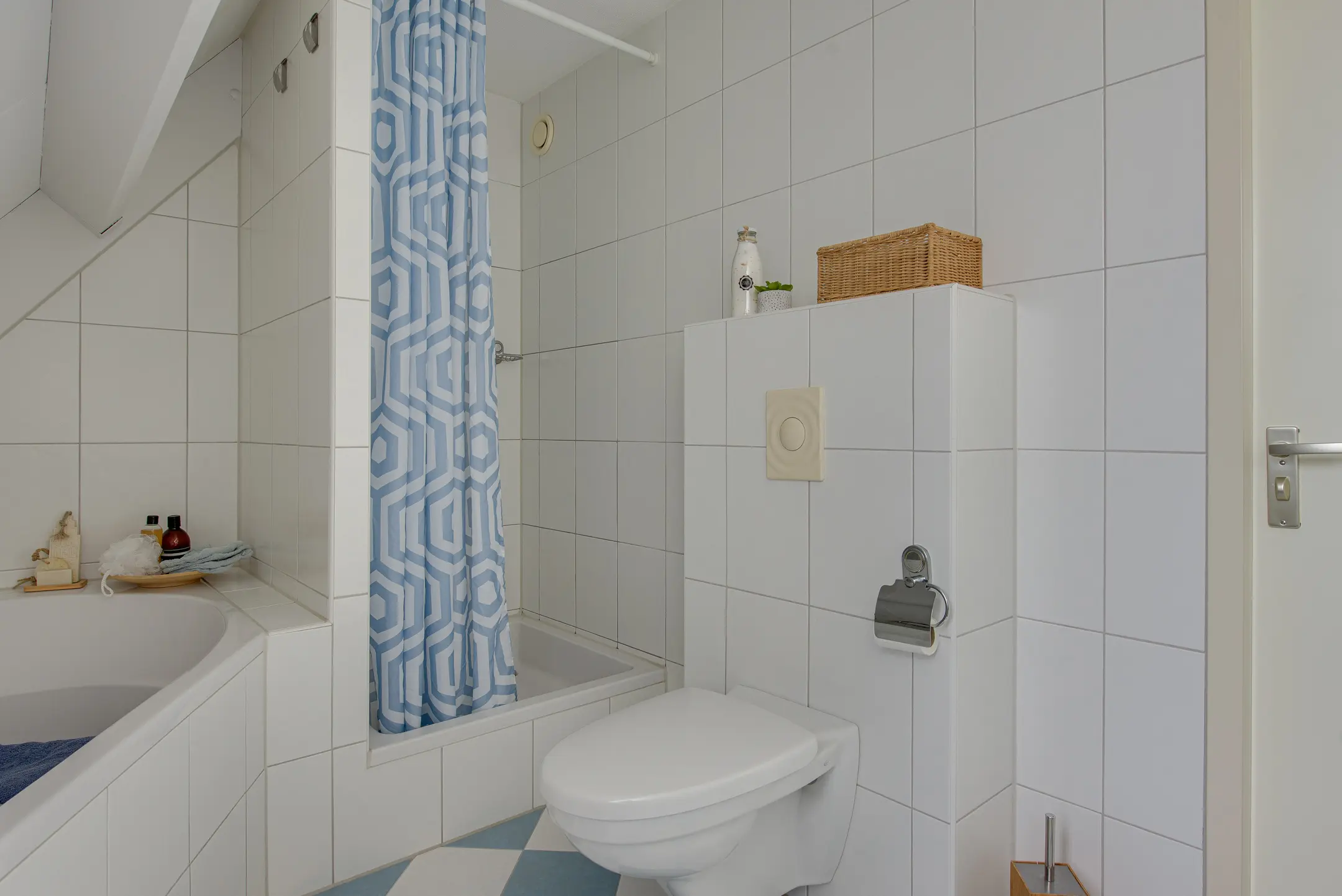 - Geheel betegelde badkamer met douche, ligbad, wastafelmeubel, 2e toilet en dakkapel