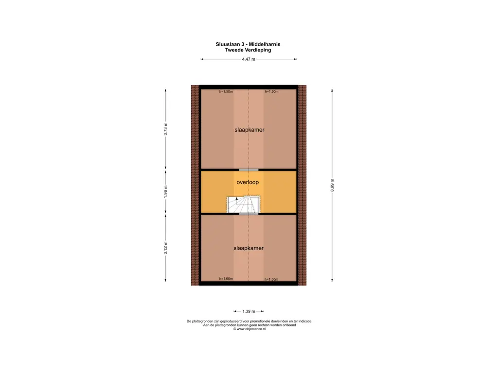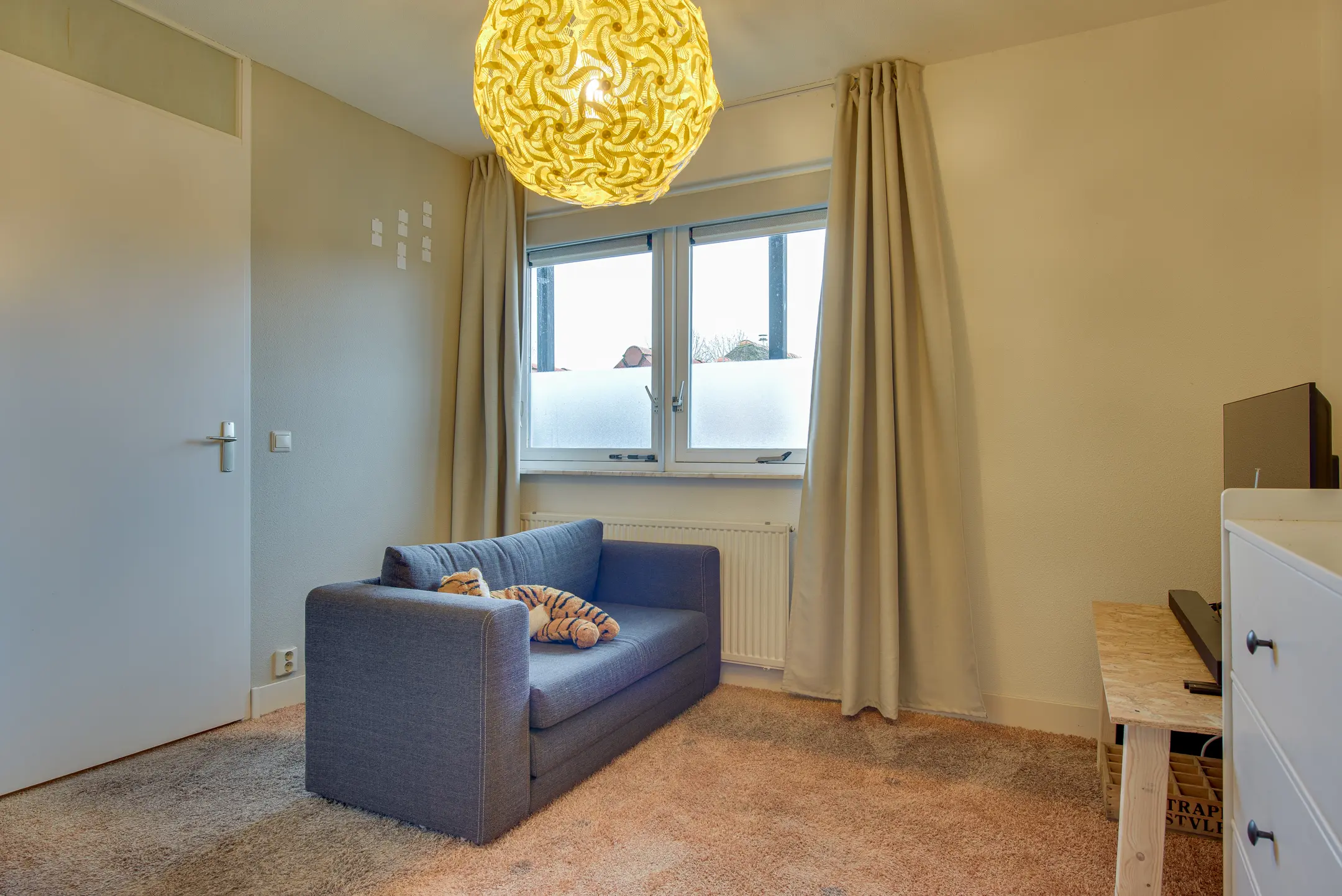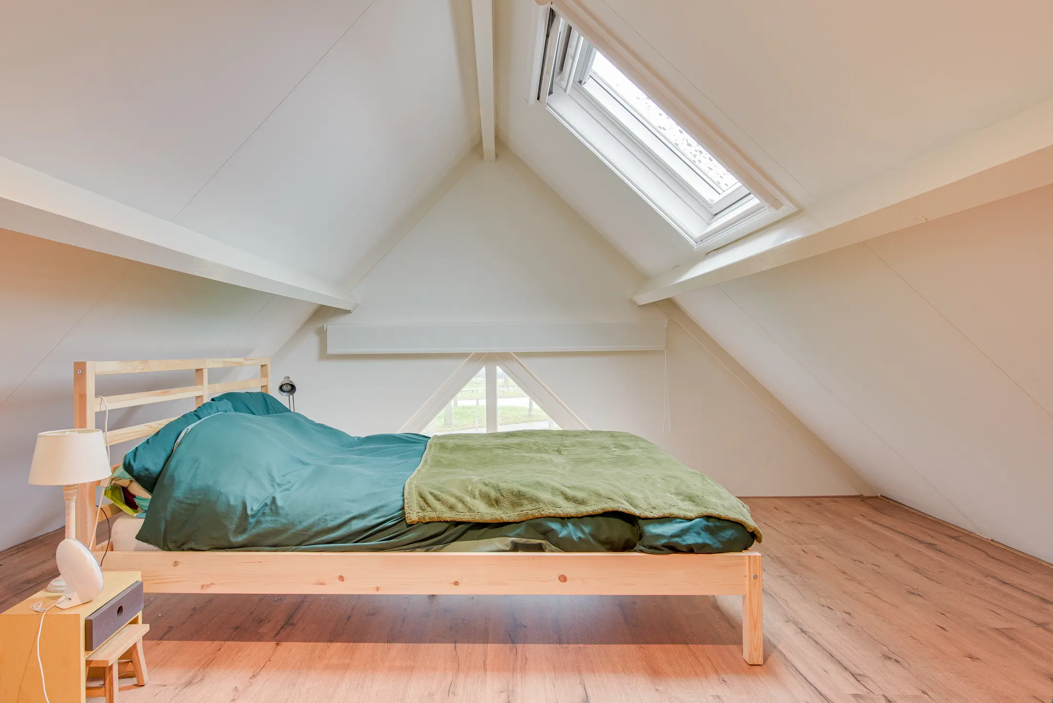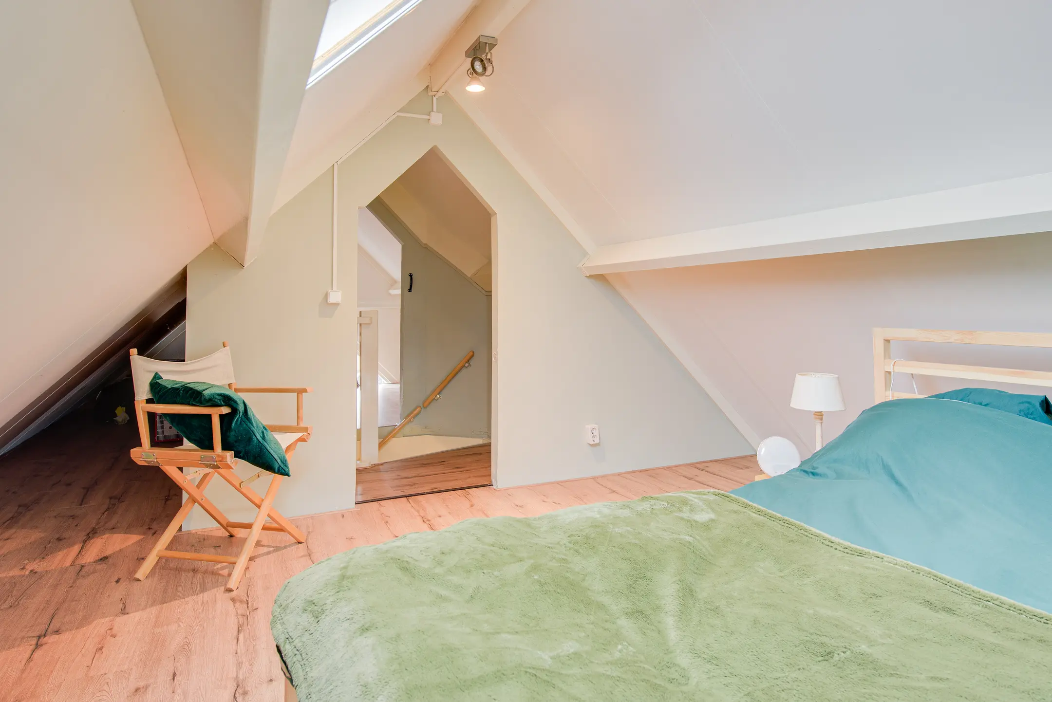 Vaste trap naar tweede verdieping waarop overloop met toegang tot vierde slaapkamer met dakraam en bergruimte.