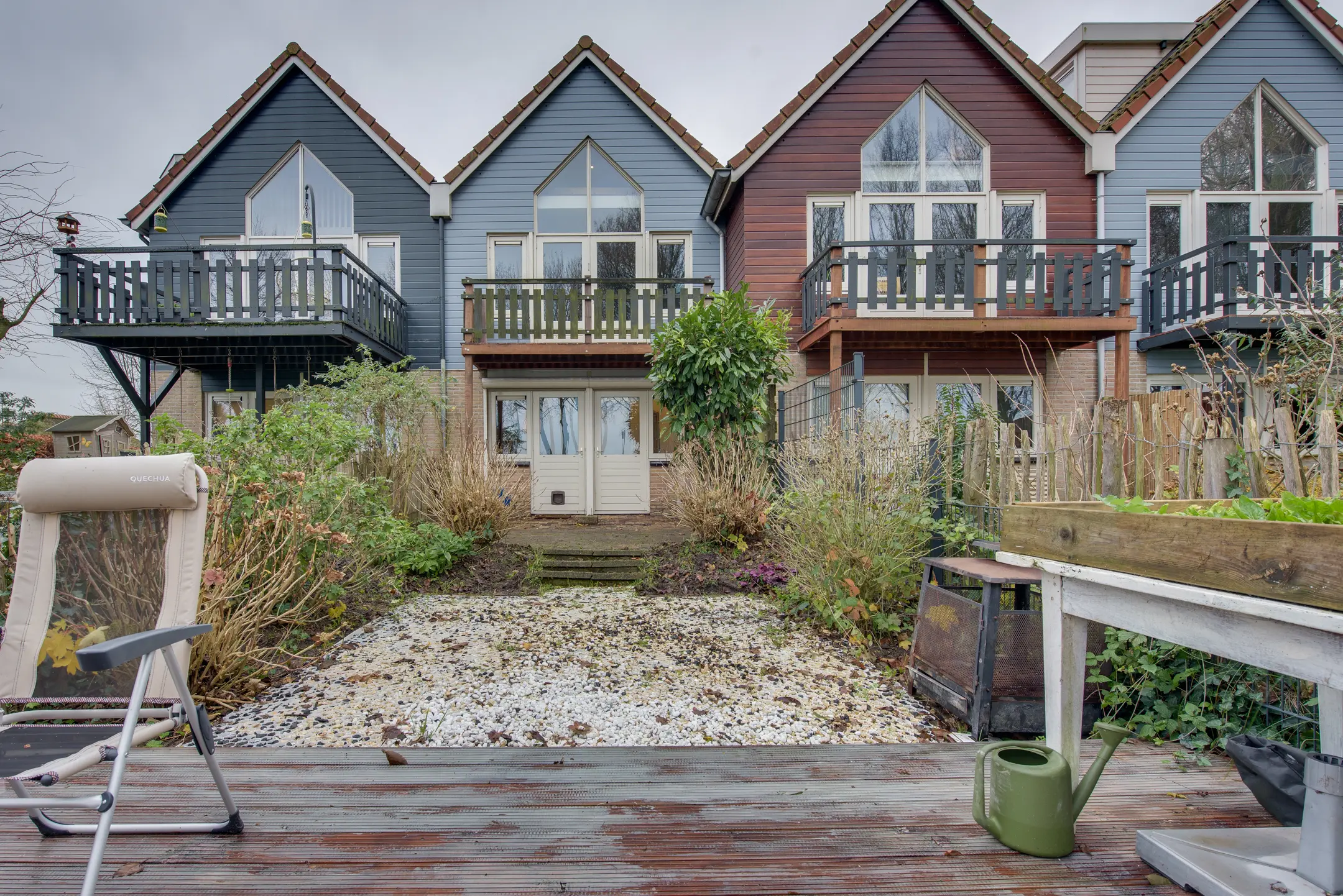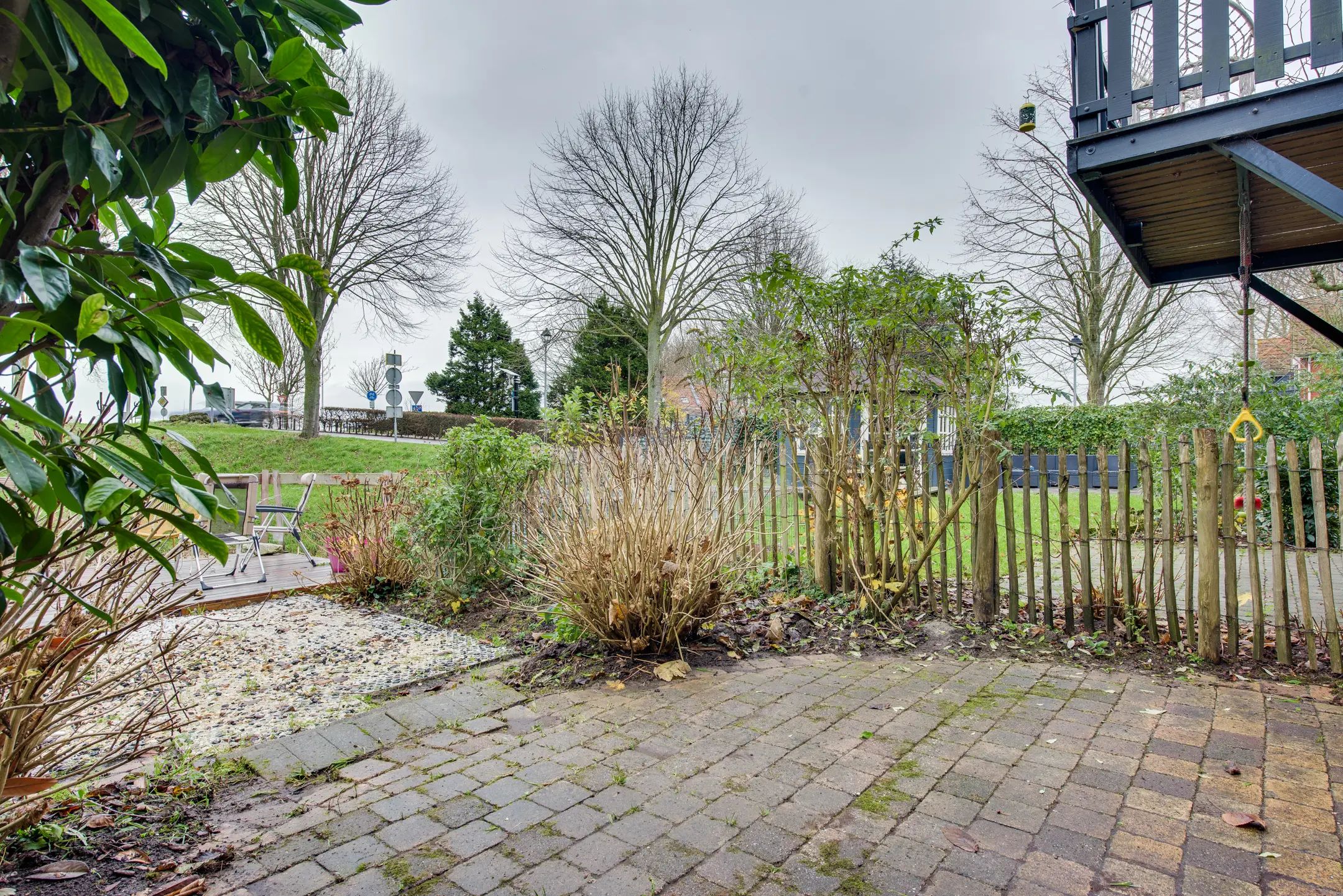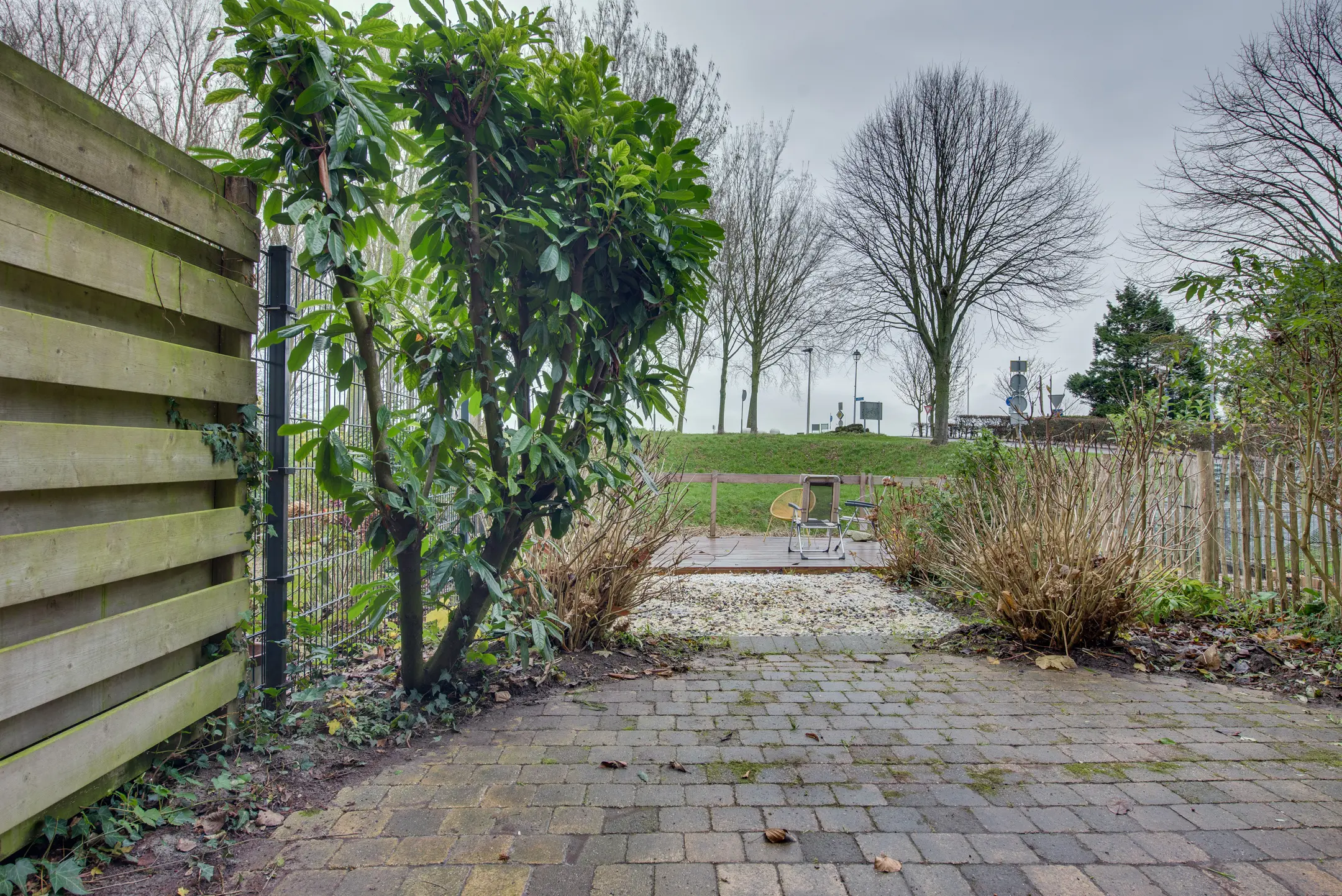 De woning beschikt over een voortuin met parkeergelegenheid op eigen terrein en houten berging. Aan de achterzijde bevindt zich een keurig aangelegde tuin aan een watertje. Zowel de keuken als de woonkamer beschikken over een balkon.