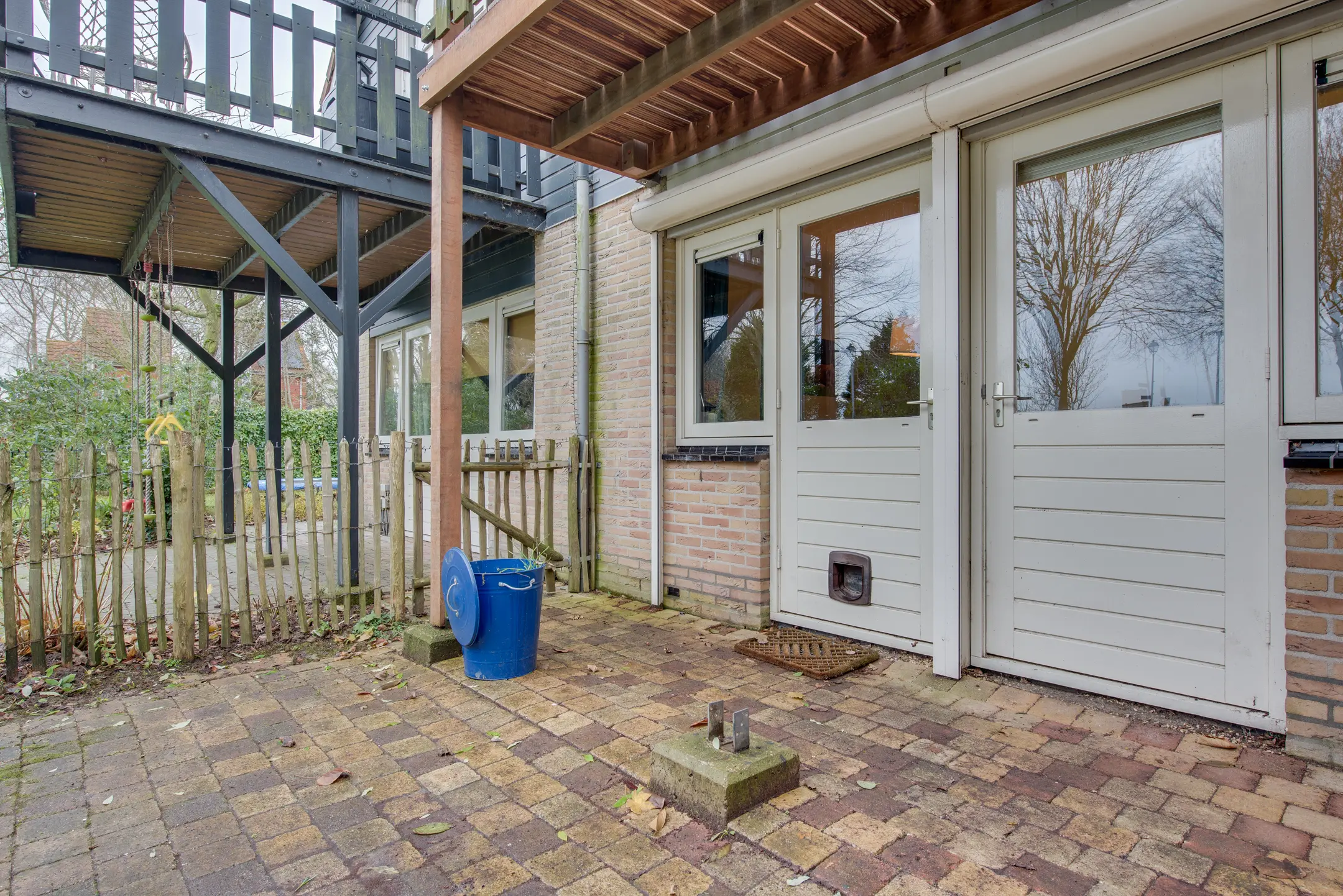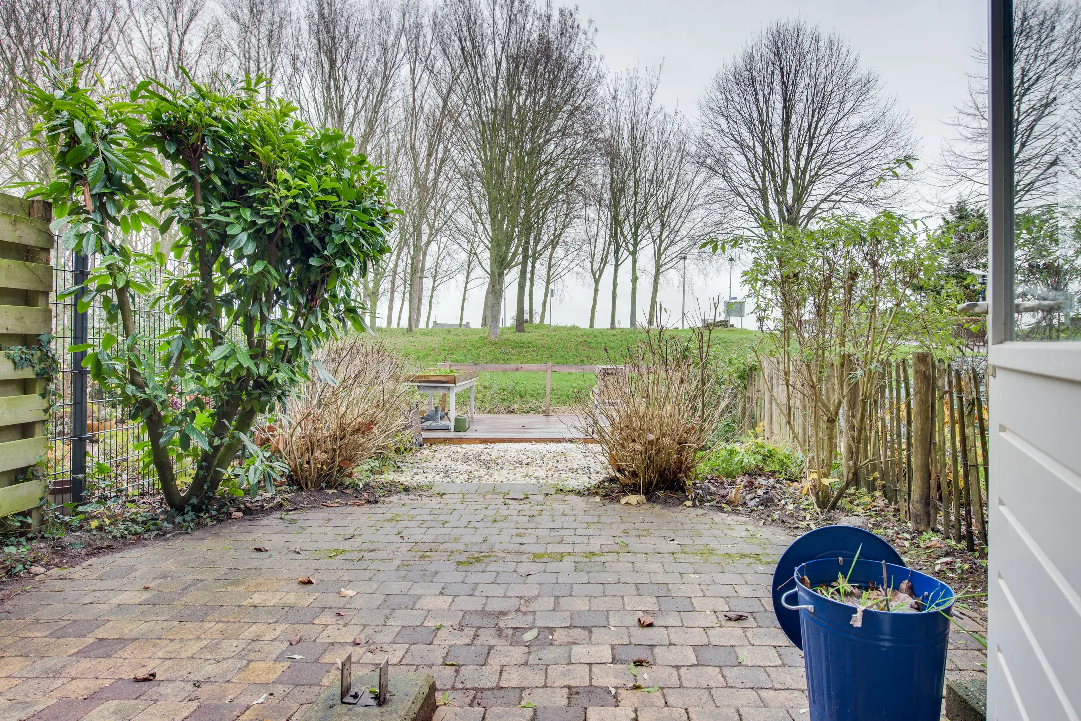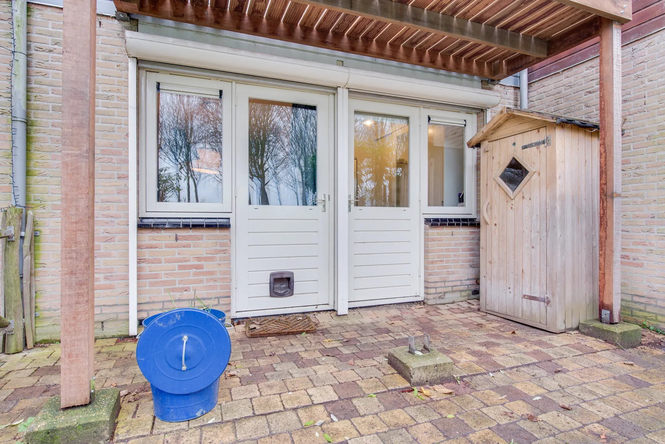De woning beschikt over een voortuin met parkeergelegenheid op eigen terrein en houten berging. Aan de achterzijde bevindt zich een keurig aangelegde tuin aan een watertje. Zowel de keuken als de woonkamer beschikken over een balkon.