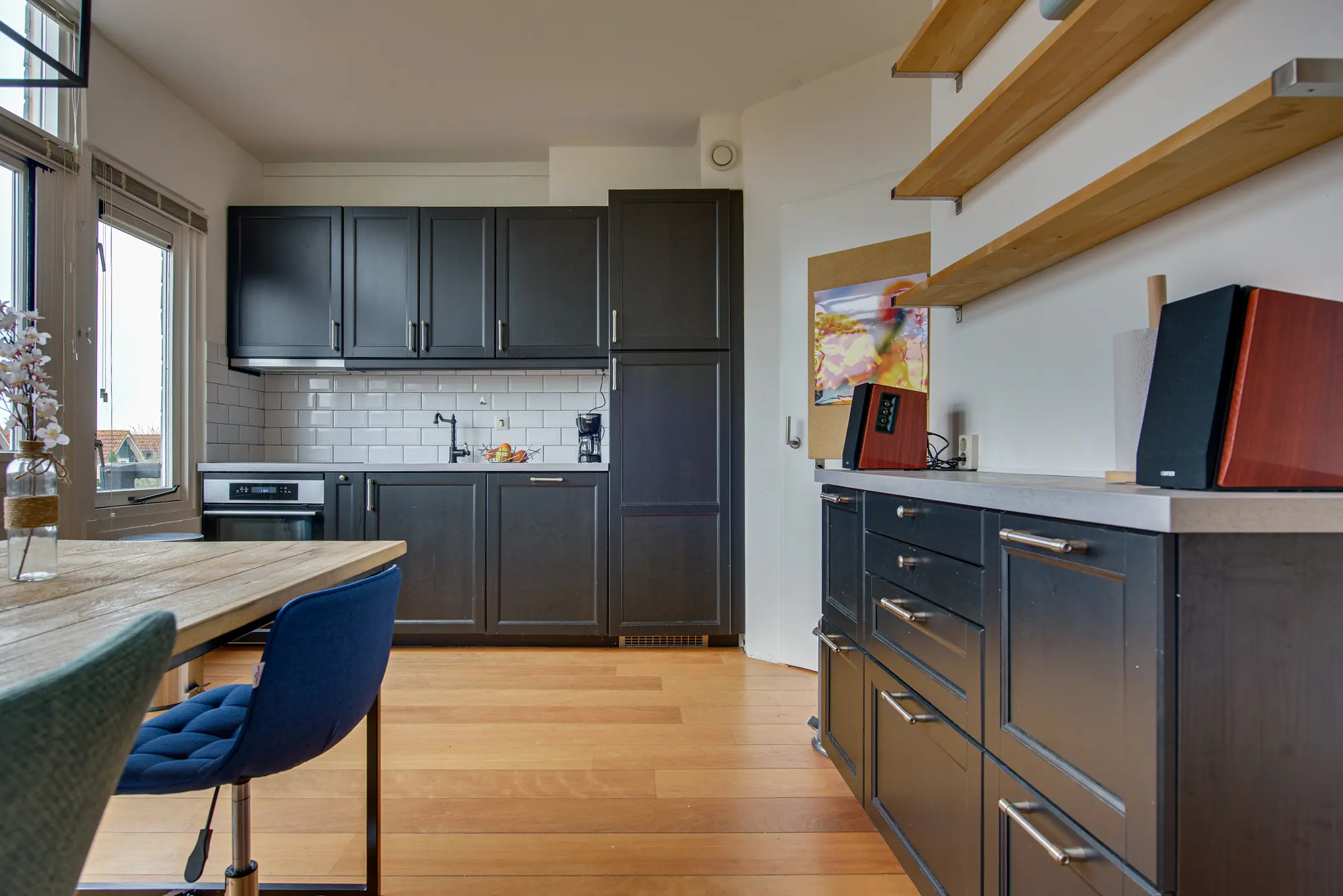 Op verdieping: overloop met toegang tot toilet en ruime, lichte woonkamer met groot balkon en uitzicht op het Haringvliet. Aan de voorzijde van de woning is de (woon)keuken gelegen voorzien van diverse inbouwapparatuur. Via de keuken is het zonnige tweede balkon en de berging met Cv-installatie en witgoedaansluiting toegankelijk.