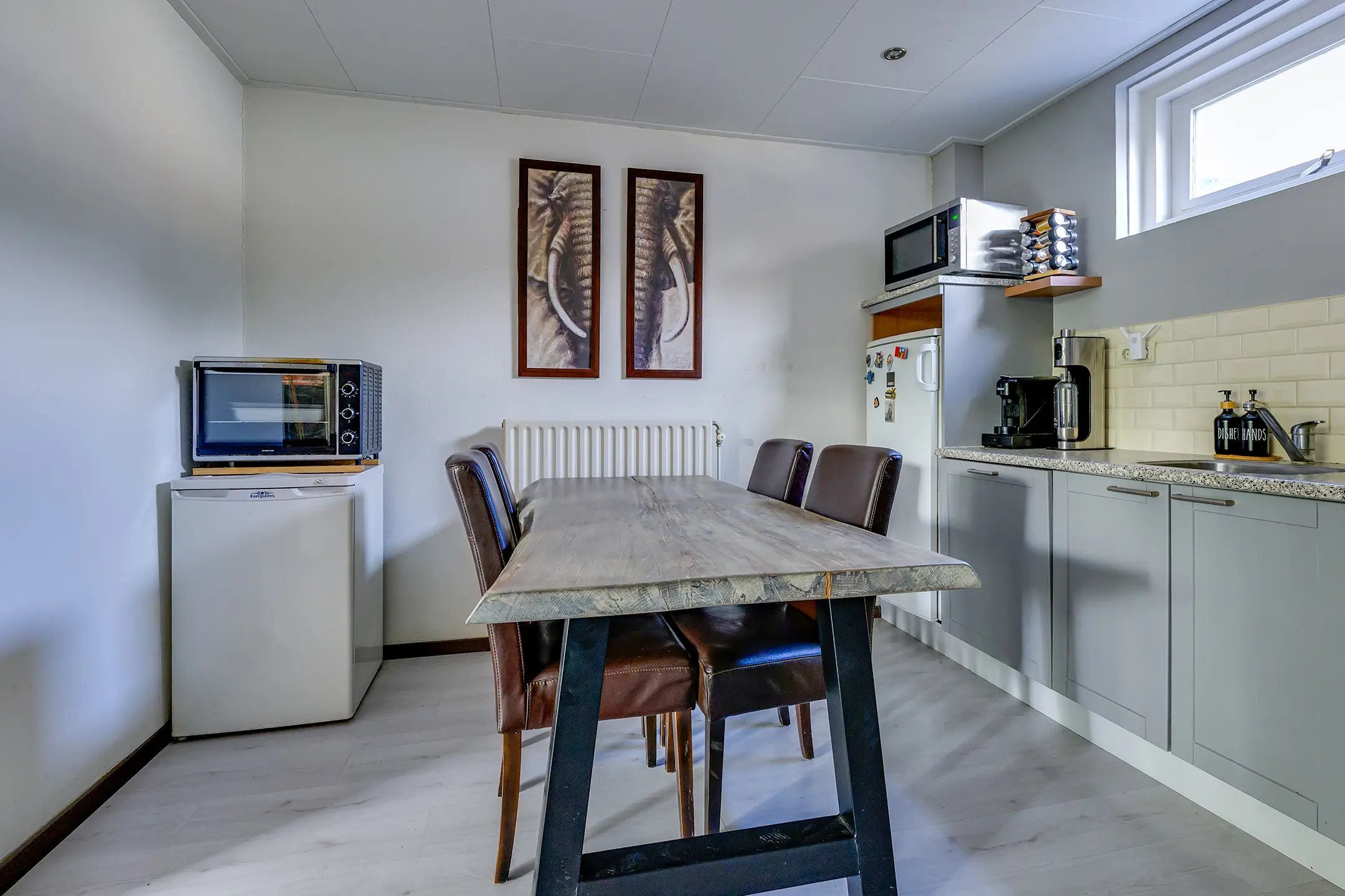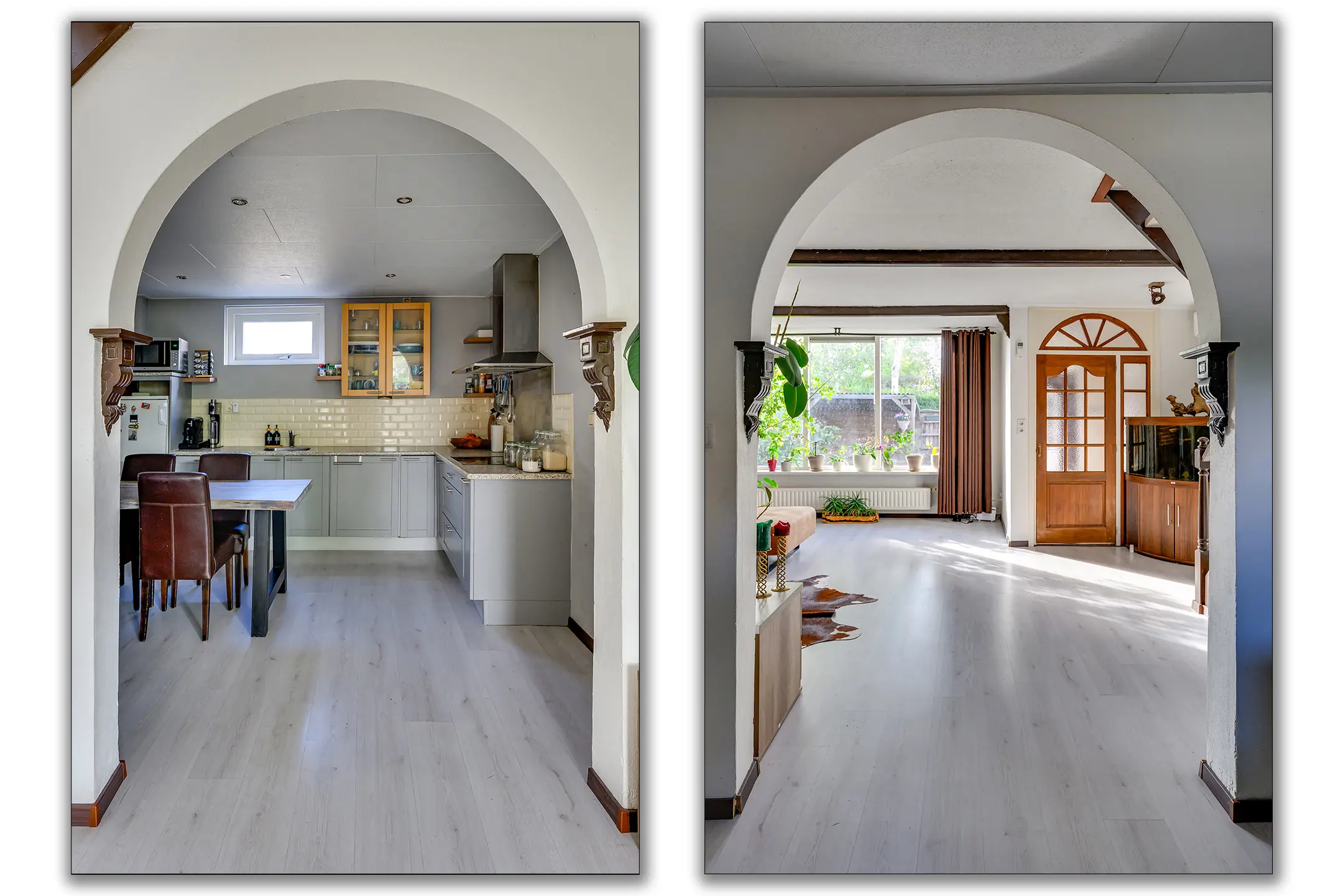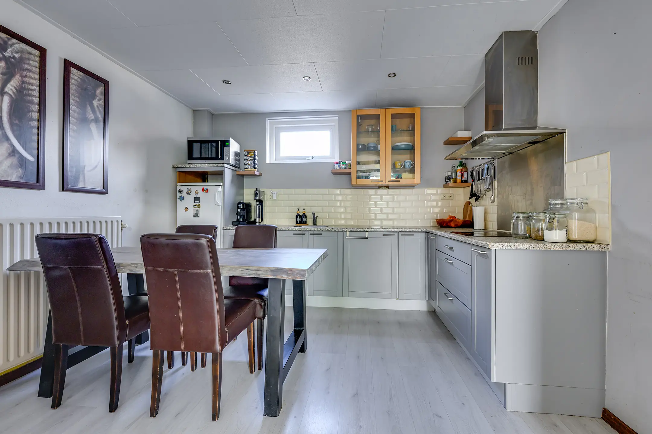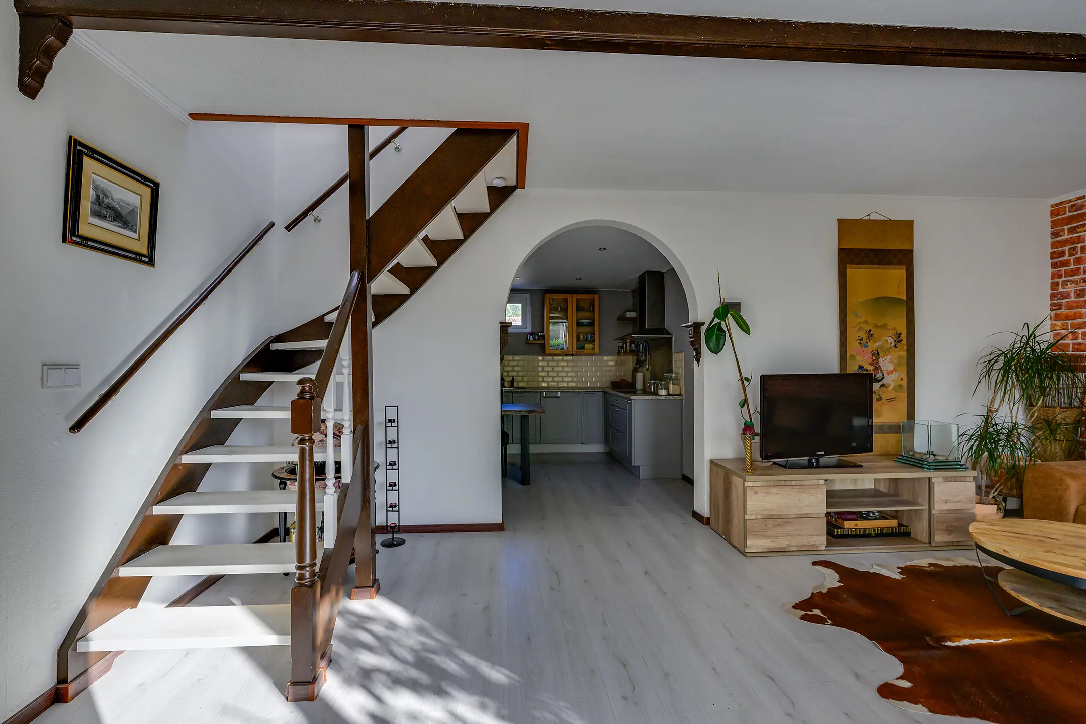 Via de entreehal met meterkast kom je binnen in de sfeervolle woonkamer met airco. De woonkamer heeft een open verbinding met de woonkeuken, die is uitgerust met diverse inbouwapparatuur.
