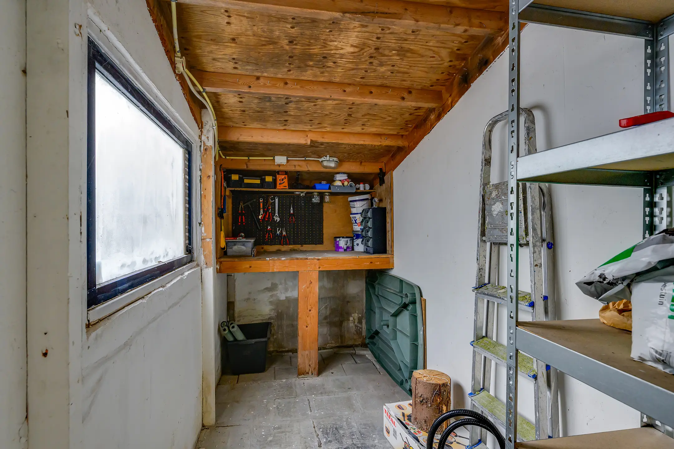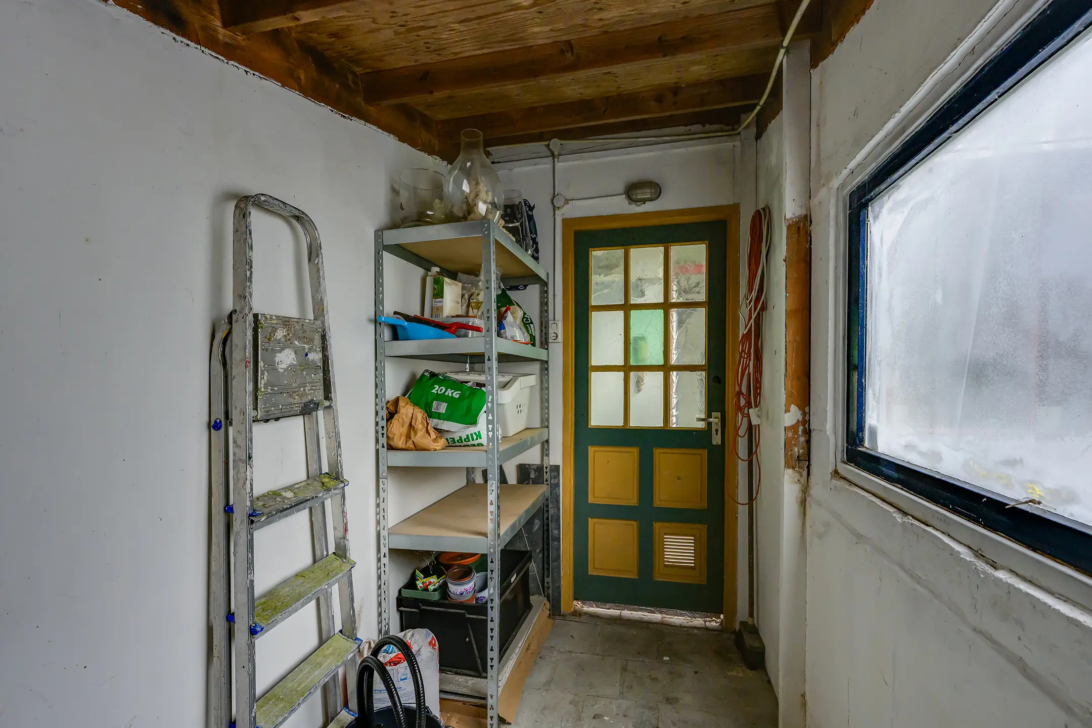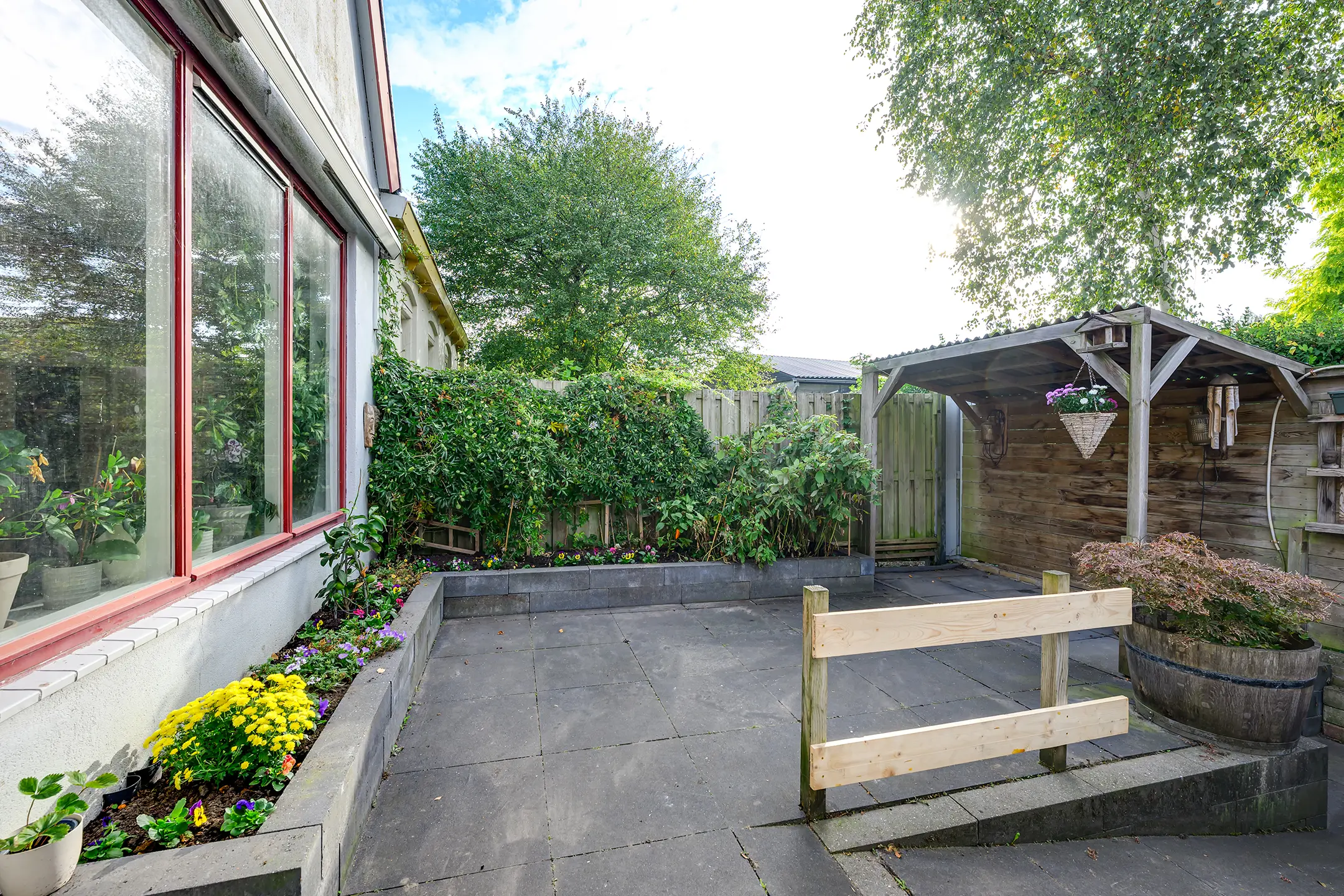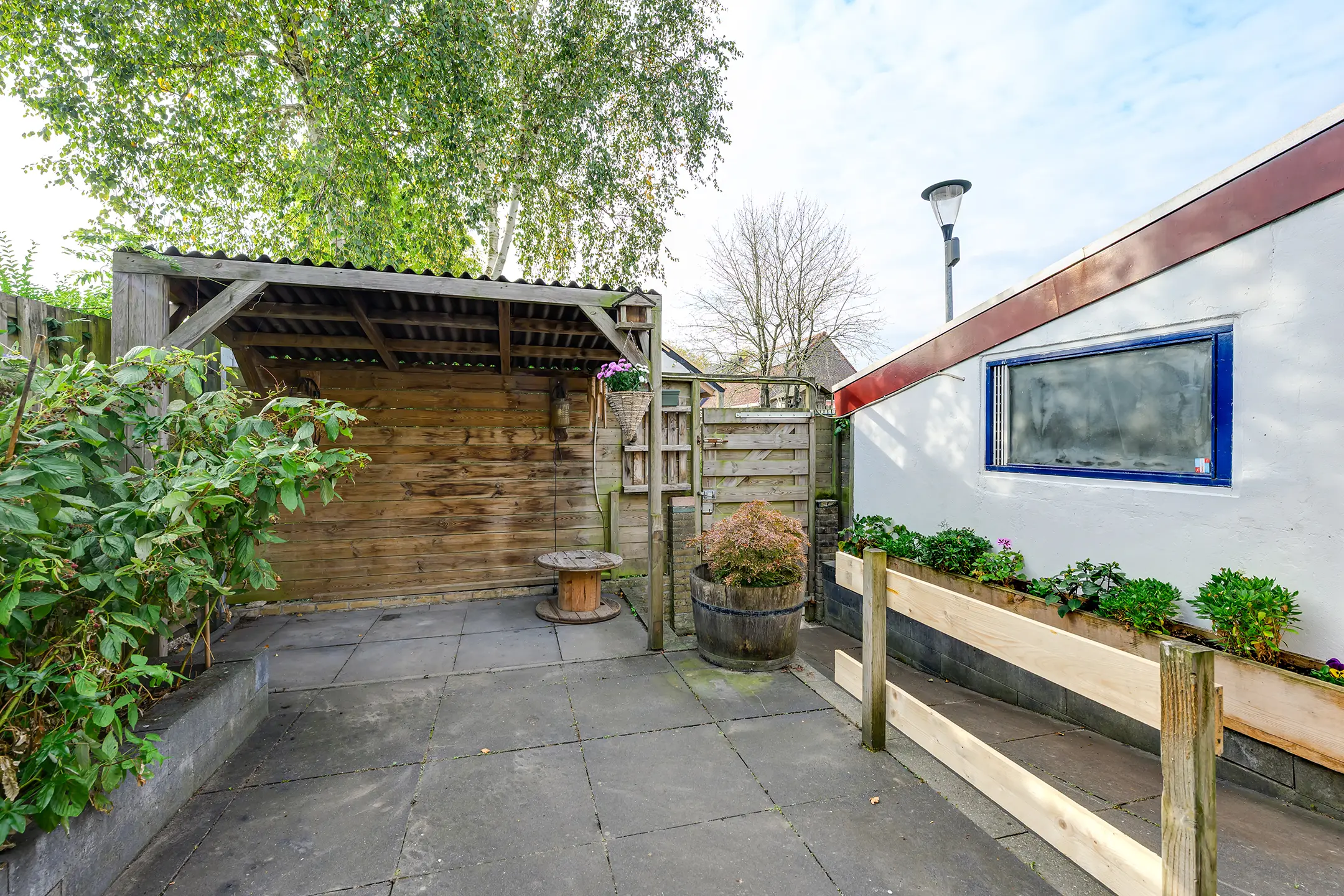 Aan de voorzijde beschikt het geheel over een zonnige tuin op het zuiden, compleet met een ruime overkapping en een stenen berging – ideaal voor fietsen of gereedschap.