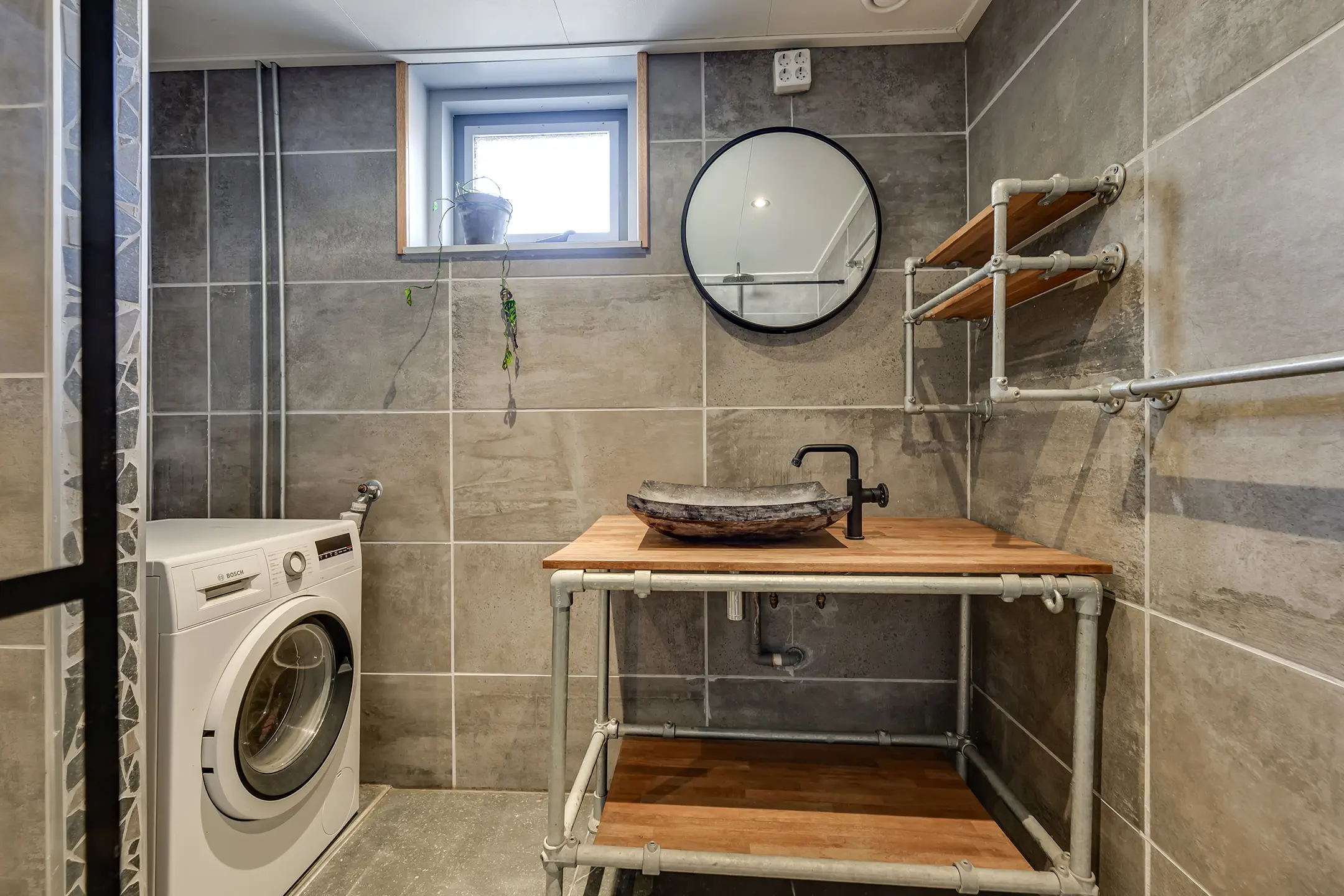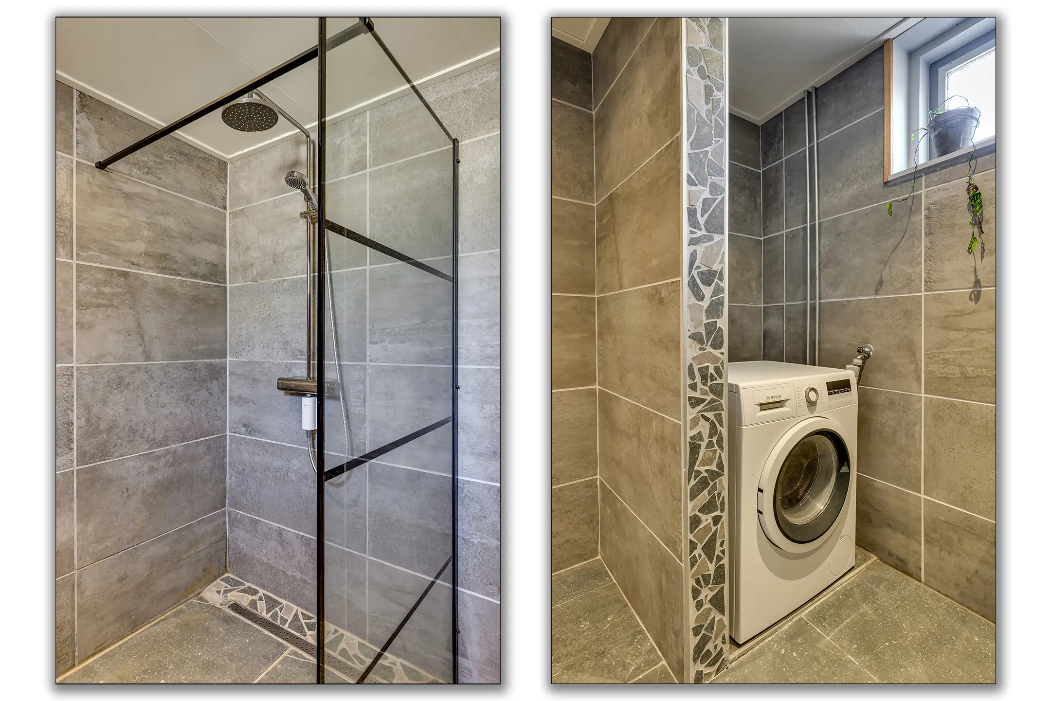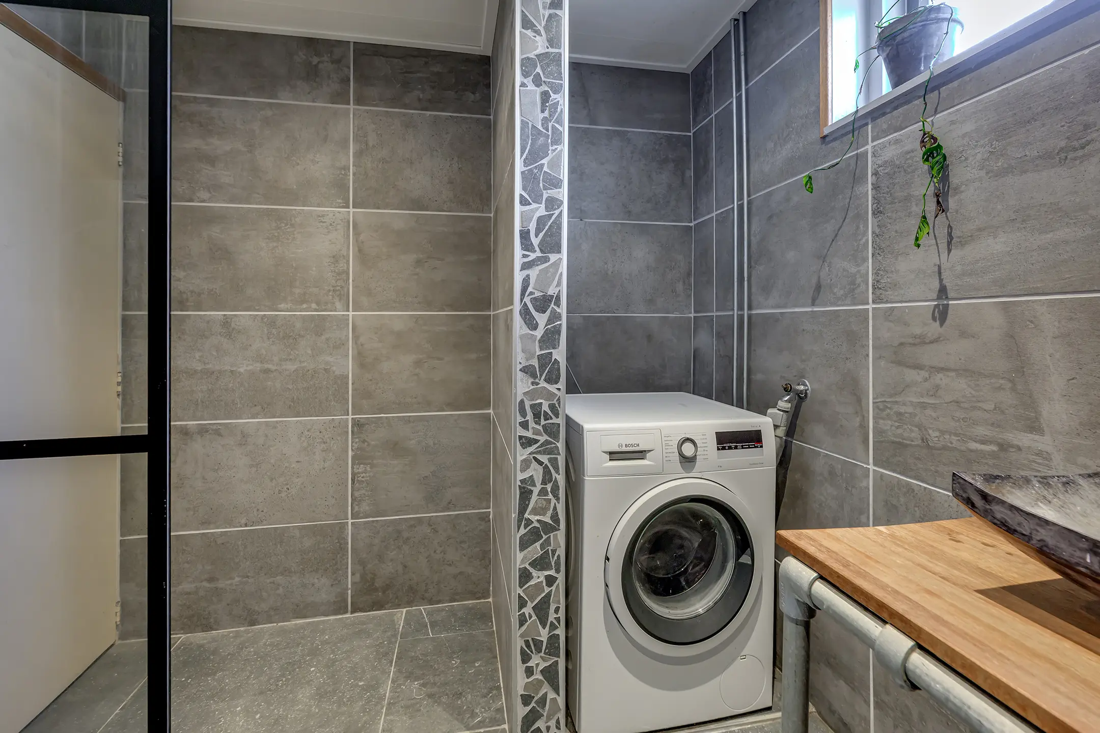 Achter de keuken bevindt zich een gang met toegang tot het zwevend toilet met fonteintje en de luxe badkamer (ca. 4 jaar oud), voorzien van inloopdouche, wastafelmeubel en aansluiting voor wasmachine en droger. Vloerverwarming is aanwezig in toilet en badkamer. Op de gehele begane grond ligt een nette laminaatvloer.