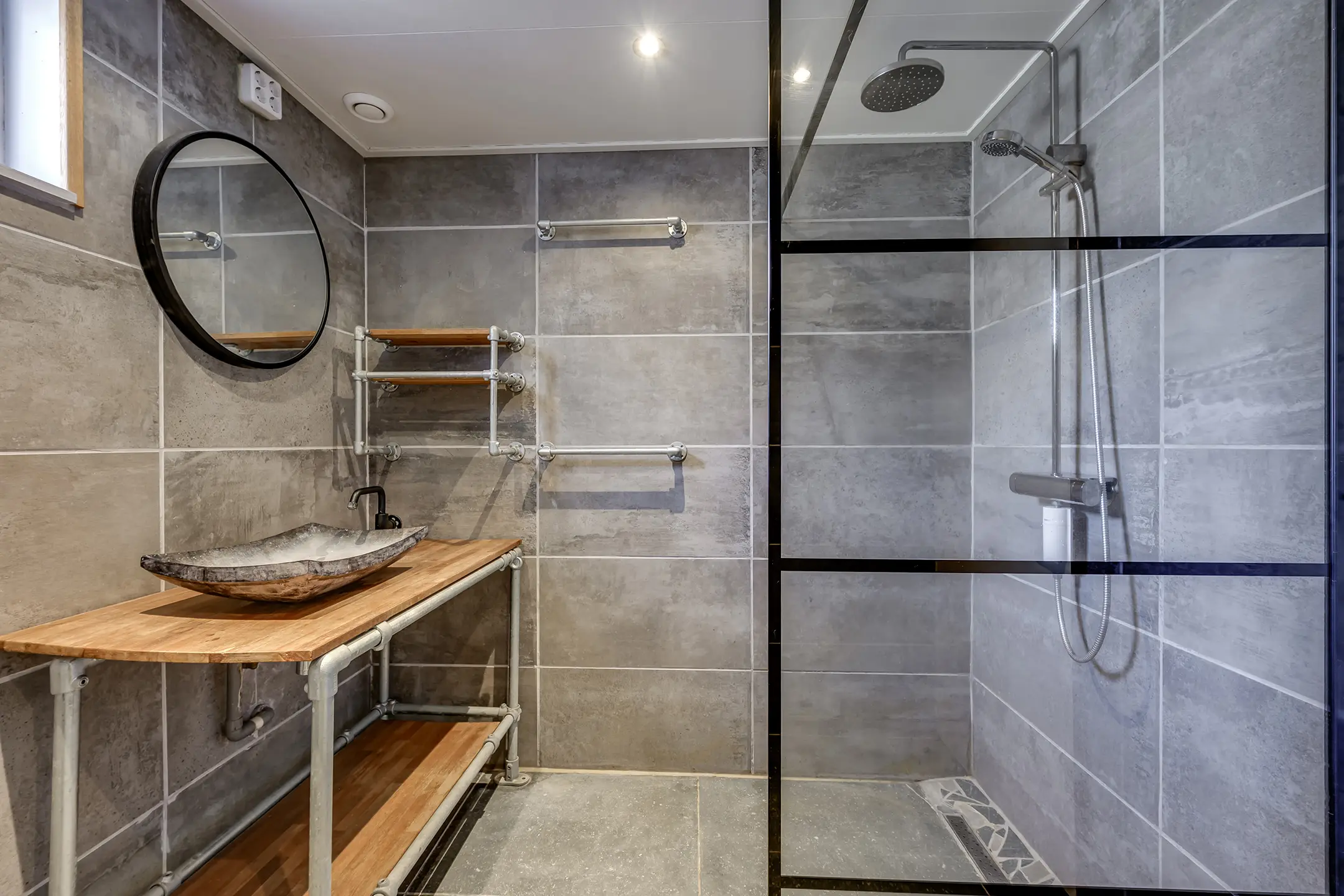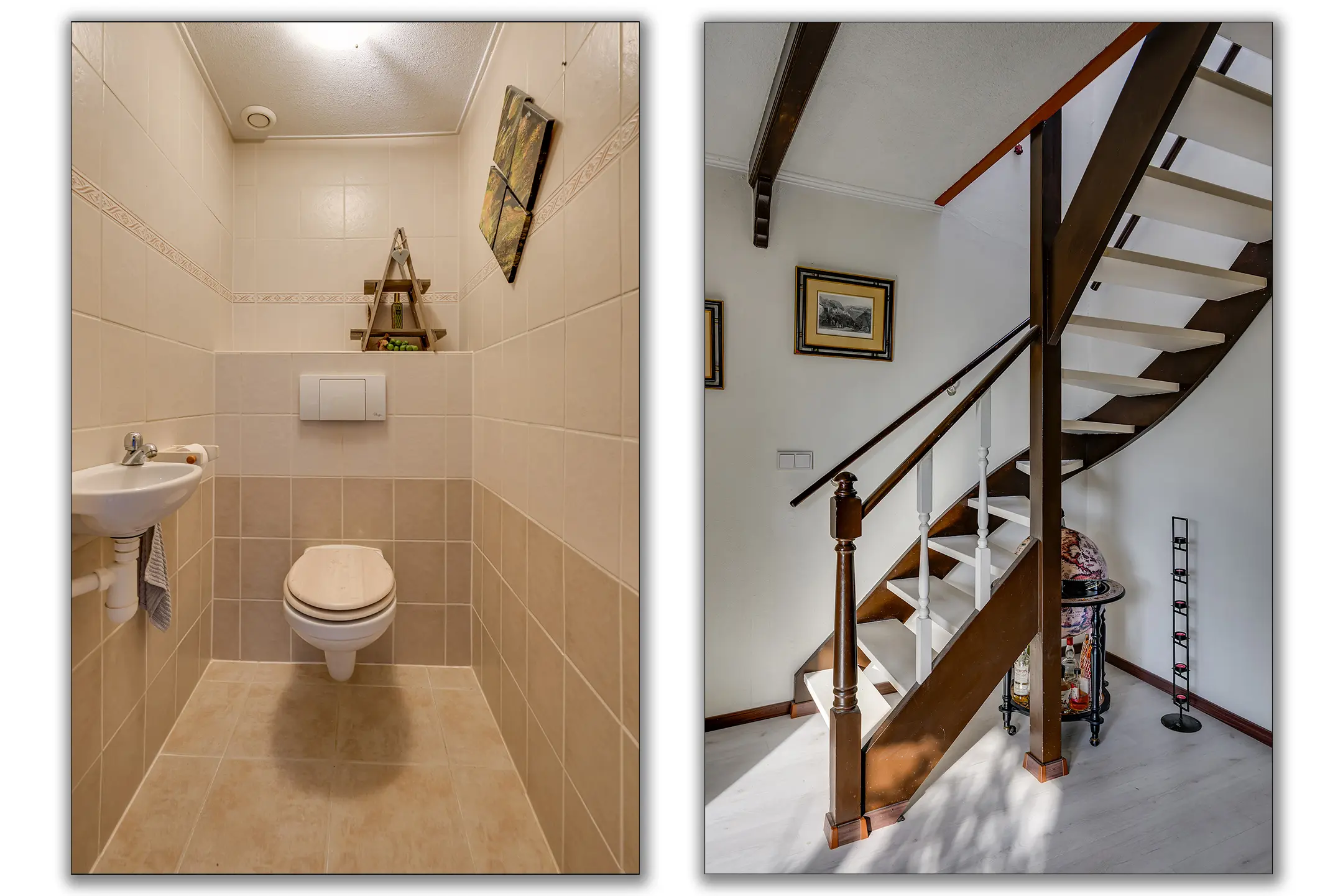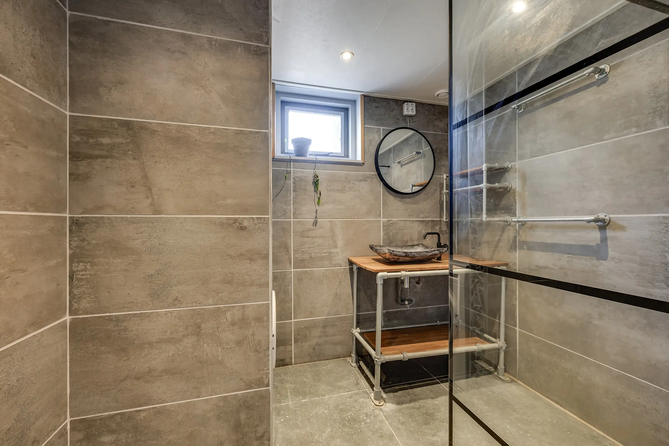 Achter de keuken bevindt zich een gang met toegang tot het zwevend toilet met fonteintje en de luxe badkamer (ca. 4 jaar oud), voorzien van inloopdouche, wastafelmeubel en aansluiting voor wasmachine en droger. Vloerverwarming is aanwezig in toilet en badkamer. Op de gehele begane grond ligt een nette laminaatvloer.