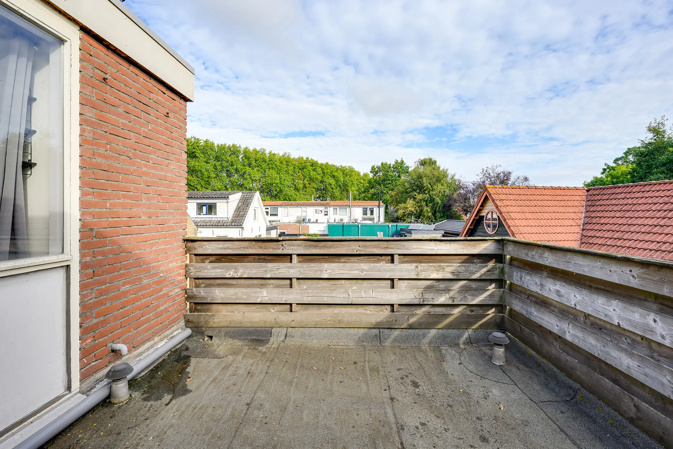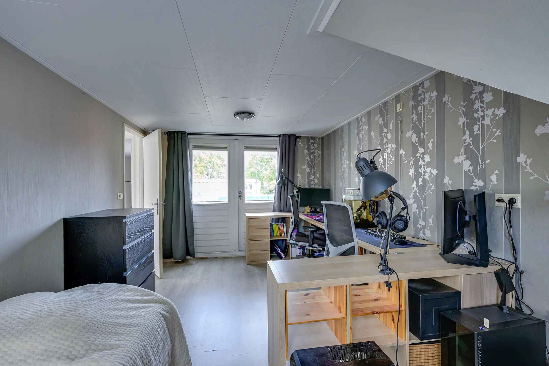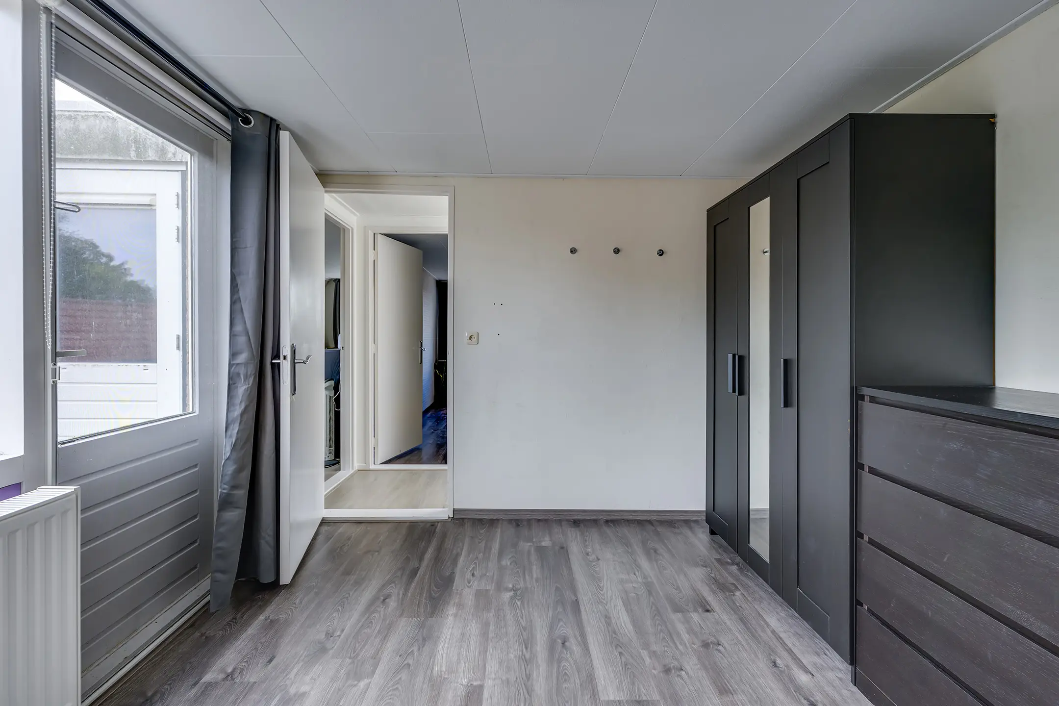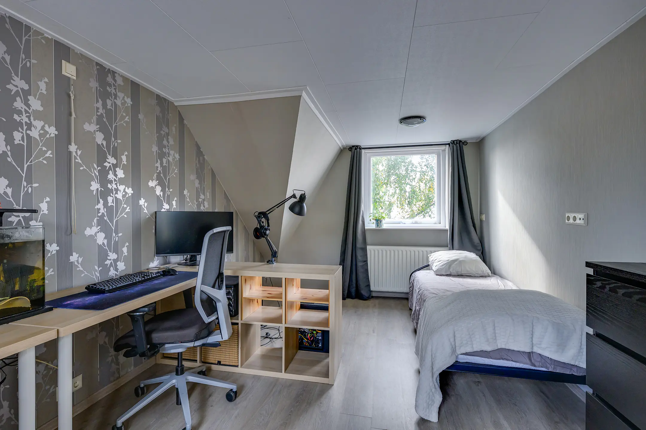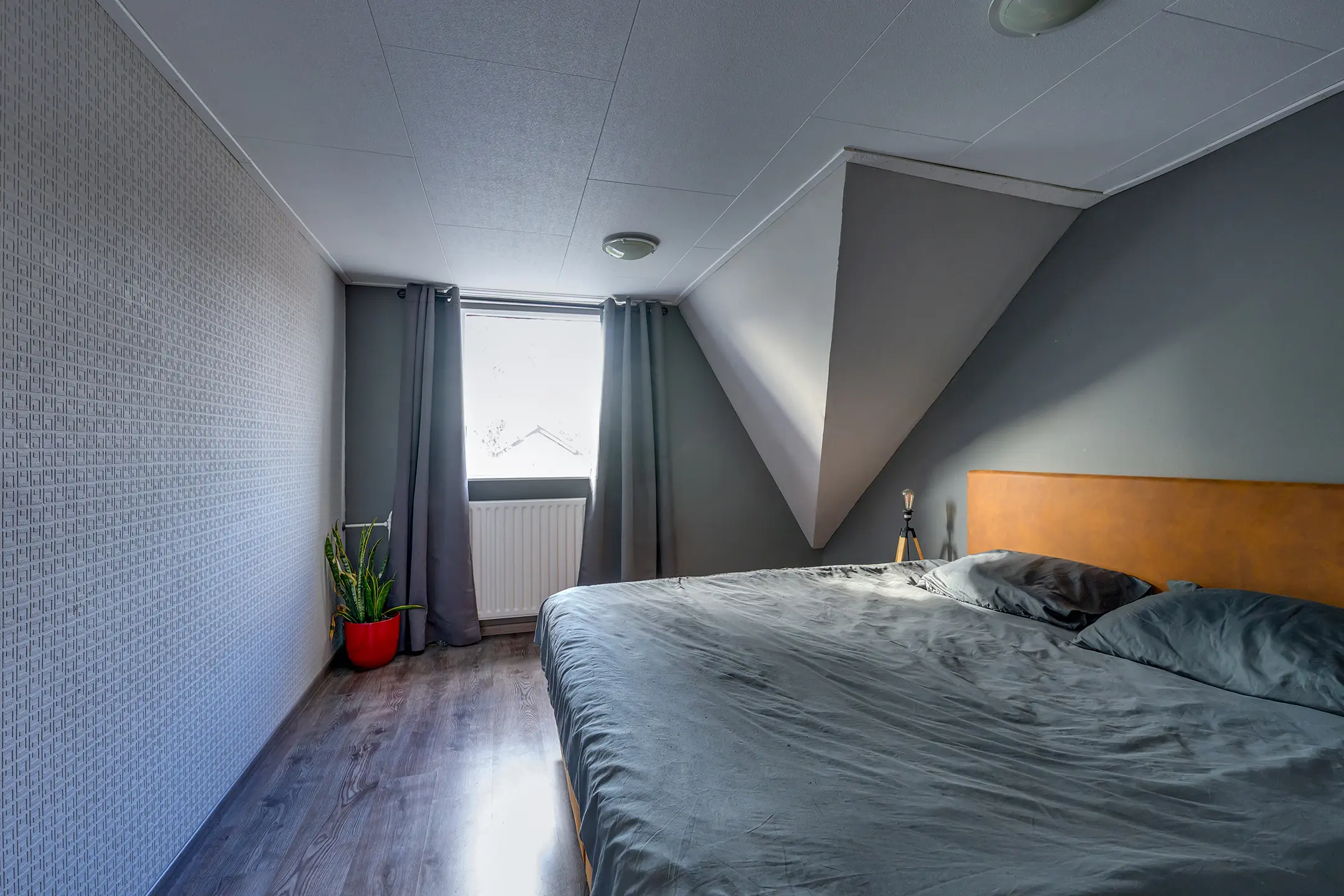 Op de eerste verdieping vind je een overloop met toegang tot drie ruime slaapkamers. Twee van deze kamers bieden directe toegang tot het dakterras. De slaapkamers hebben een prettige lichtinval en zijn netjes afgewerkt met laminaatvloeren.