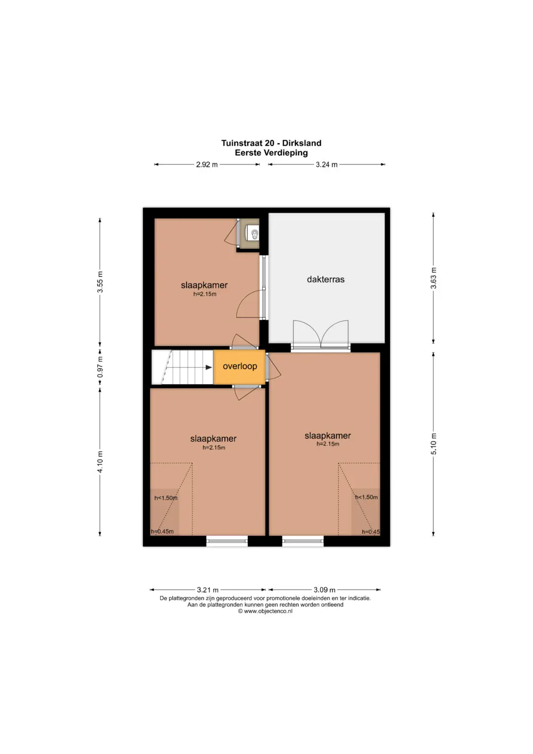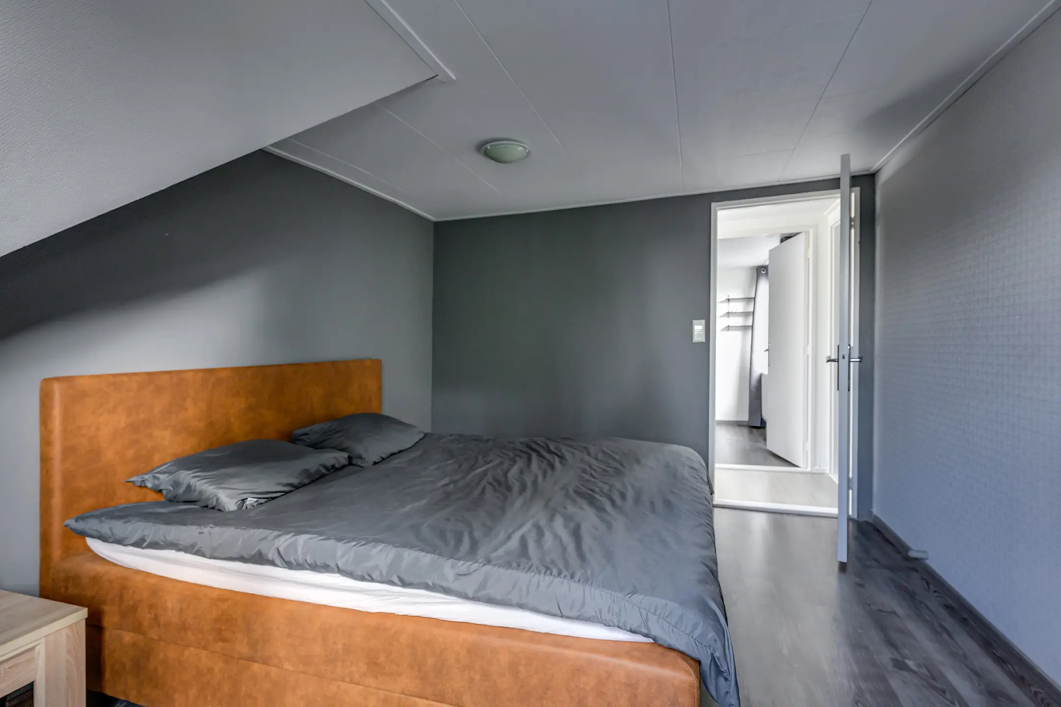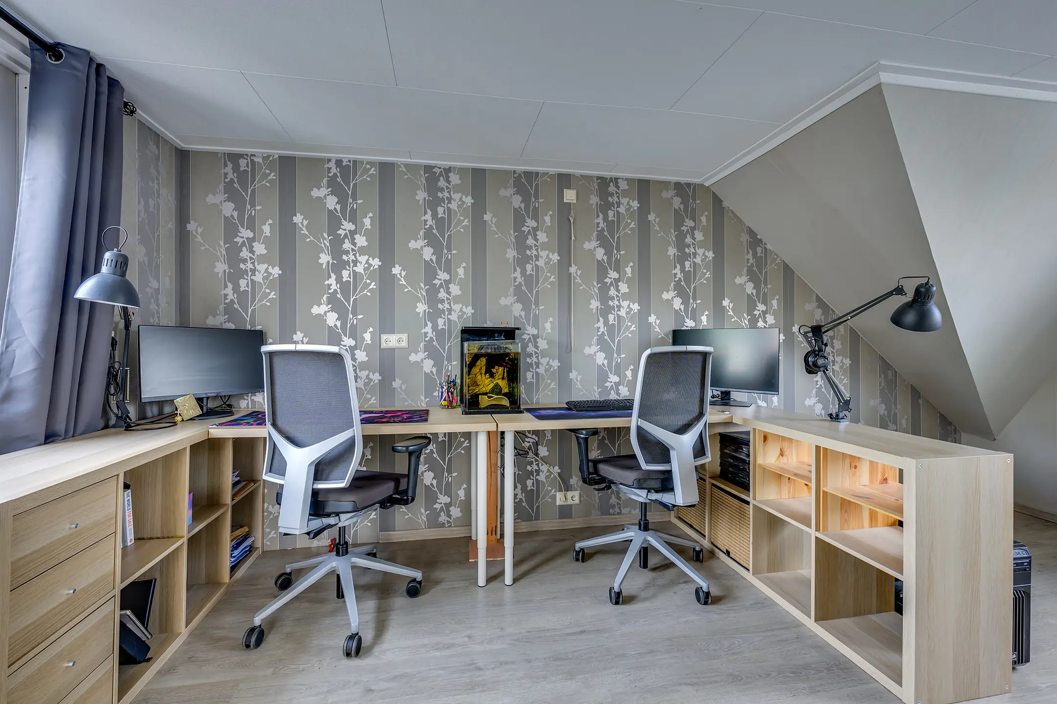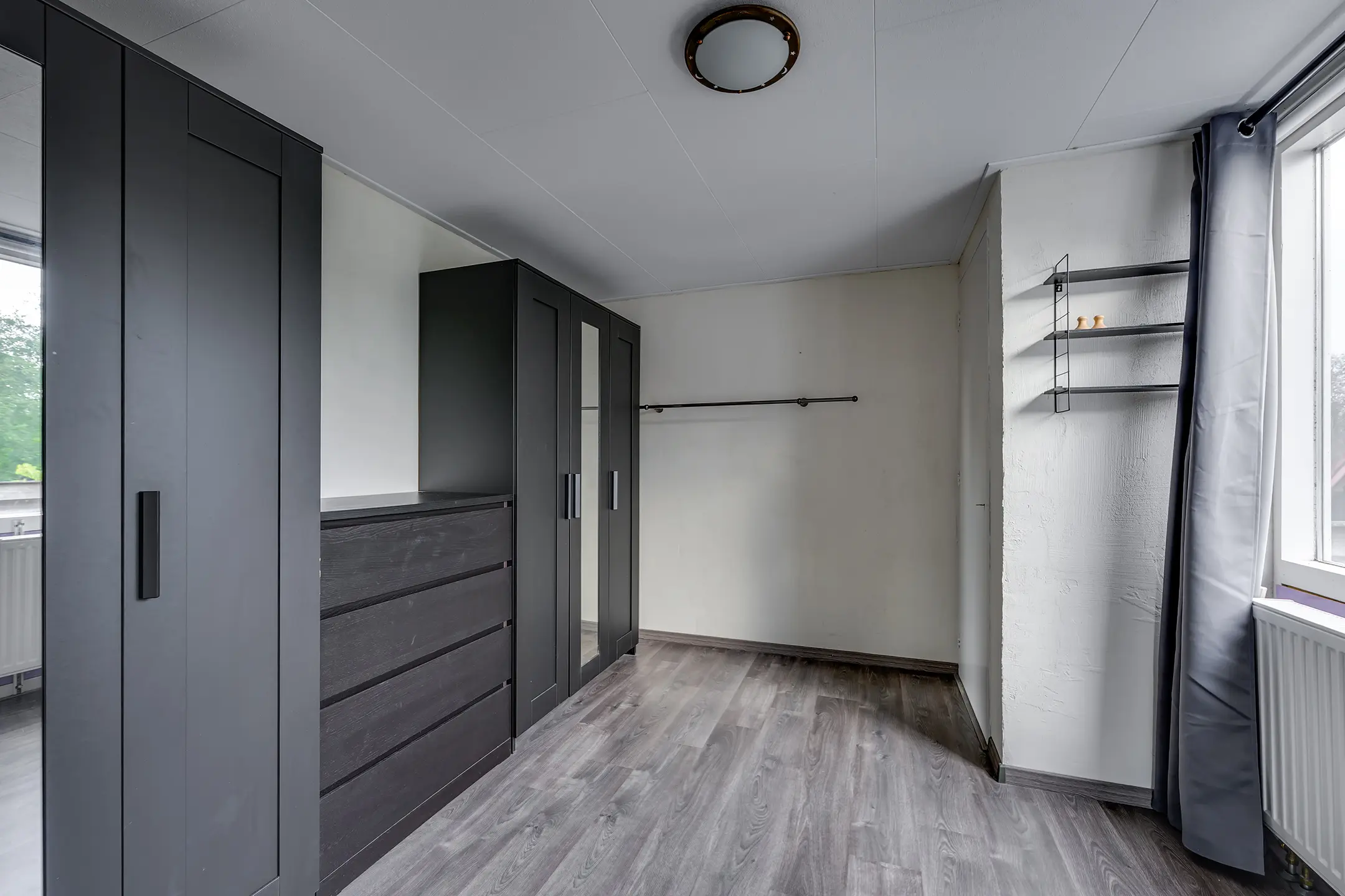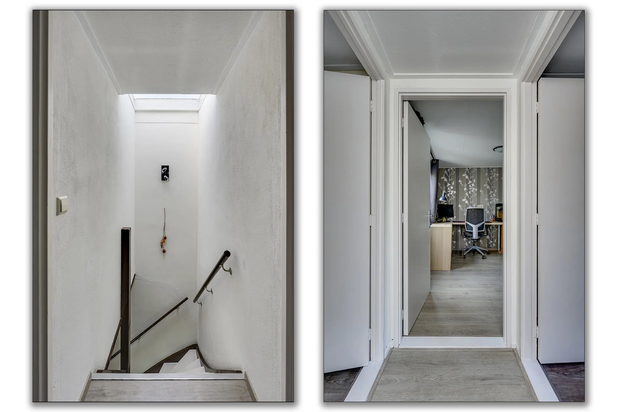 Op de eerste verdieping vind je een overloop met toegang tot drie ruime slaapkamers. Twee van deze kamers bieden directe toegang tot het dakterras. De slaapkamers hebben een prettige lichtinval en zijn netjes afgewerkt met laminaatvloeren.
