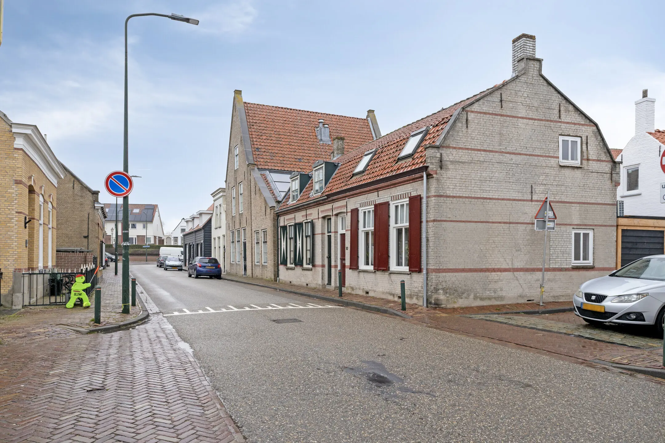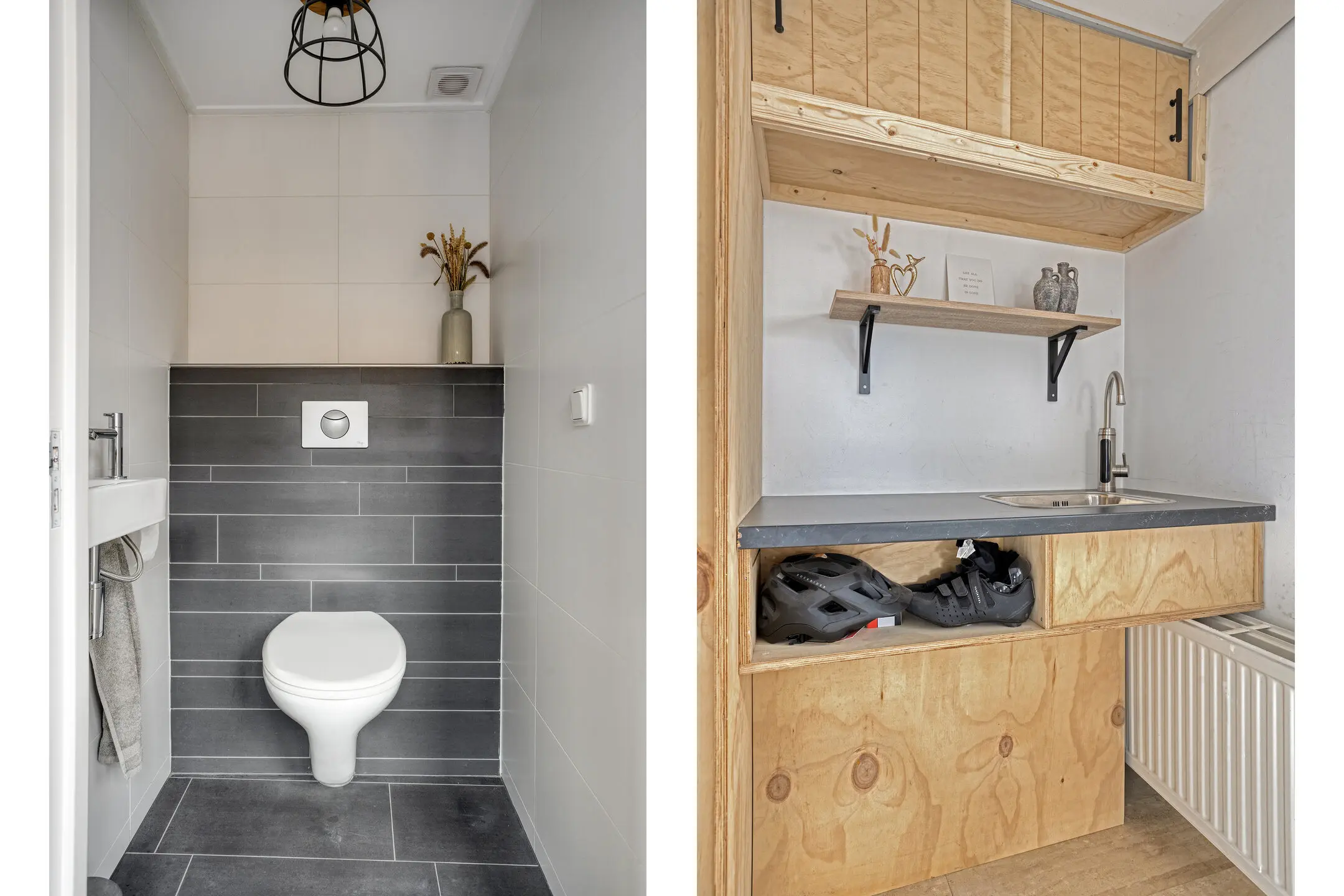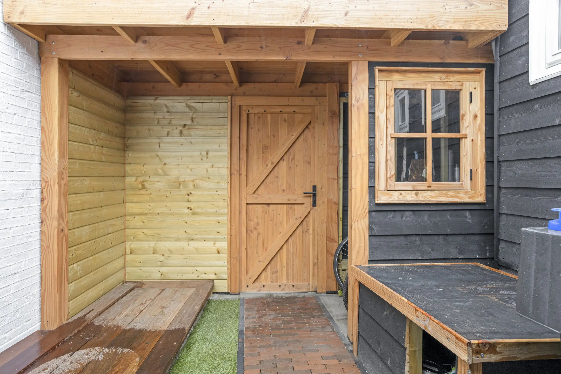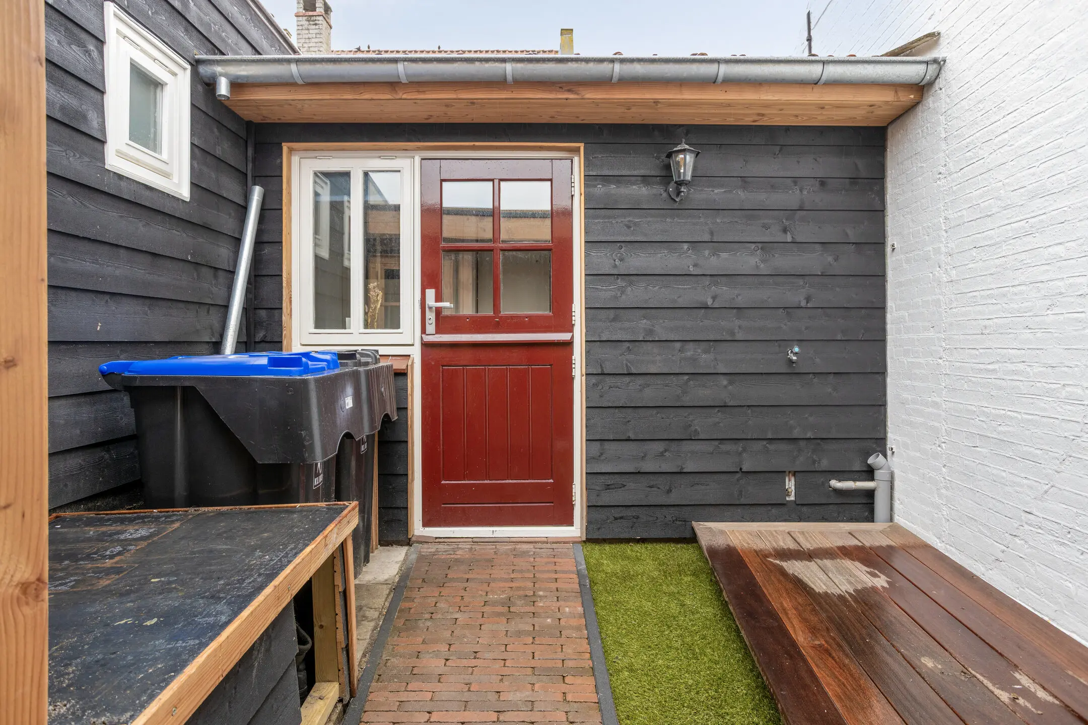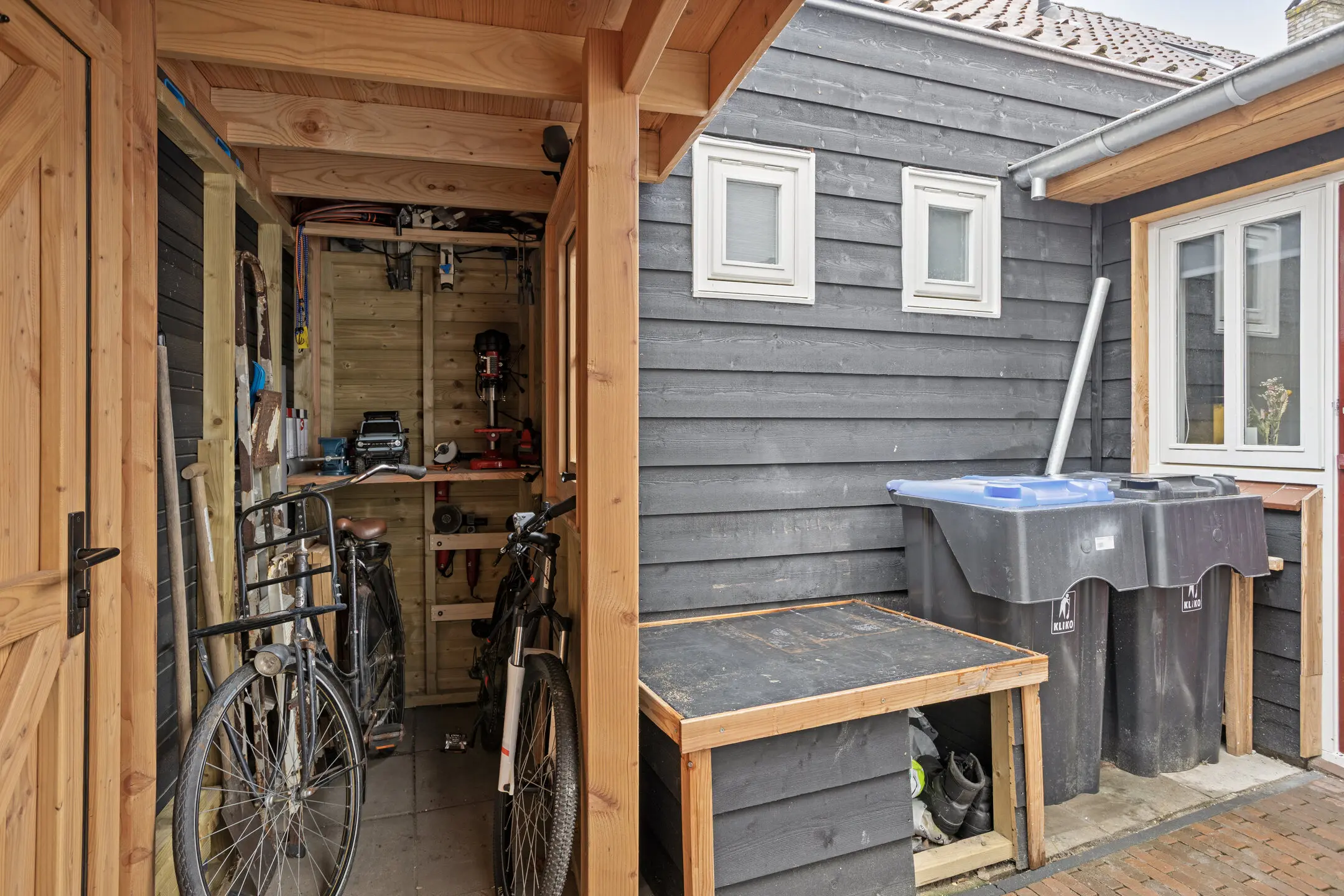 Aan de achterzijde bevindt zich een gezellige achterplaats met achterom (zijkant) en fietsenschuurtje.