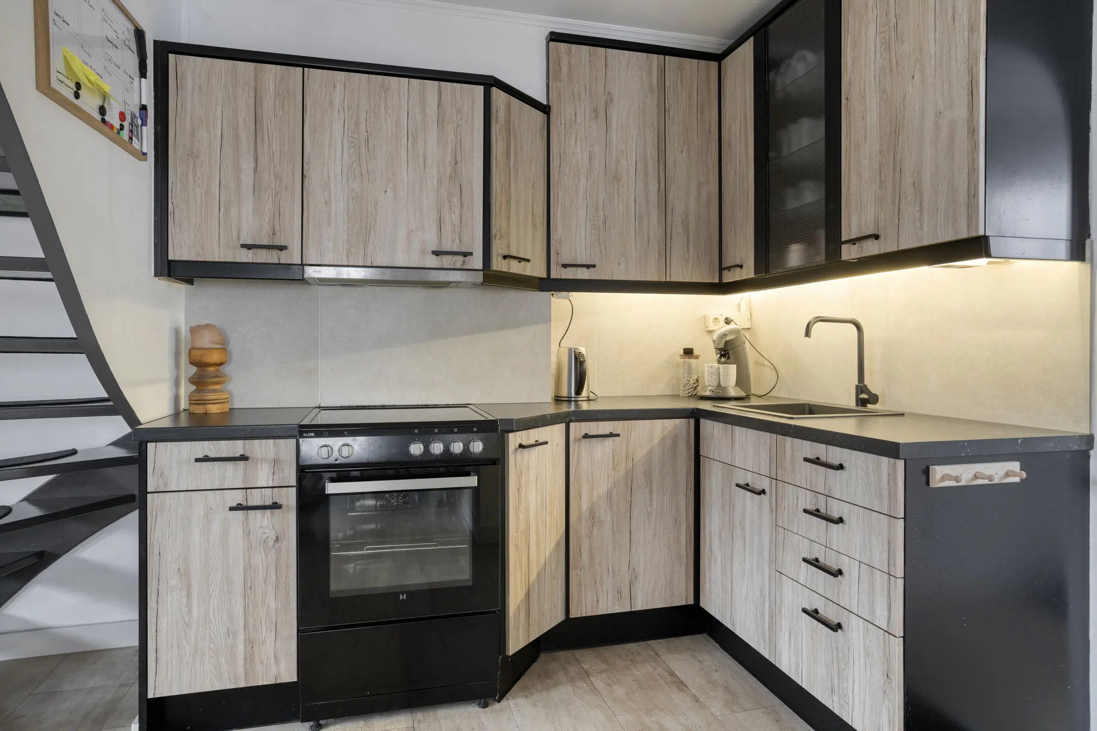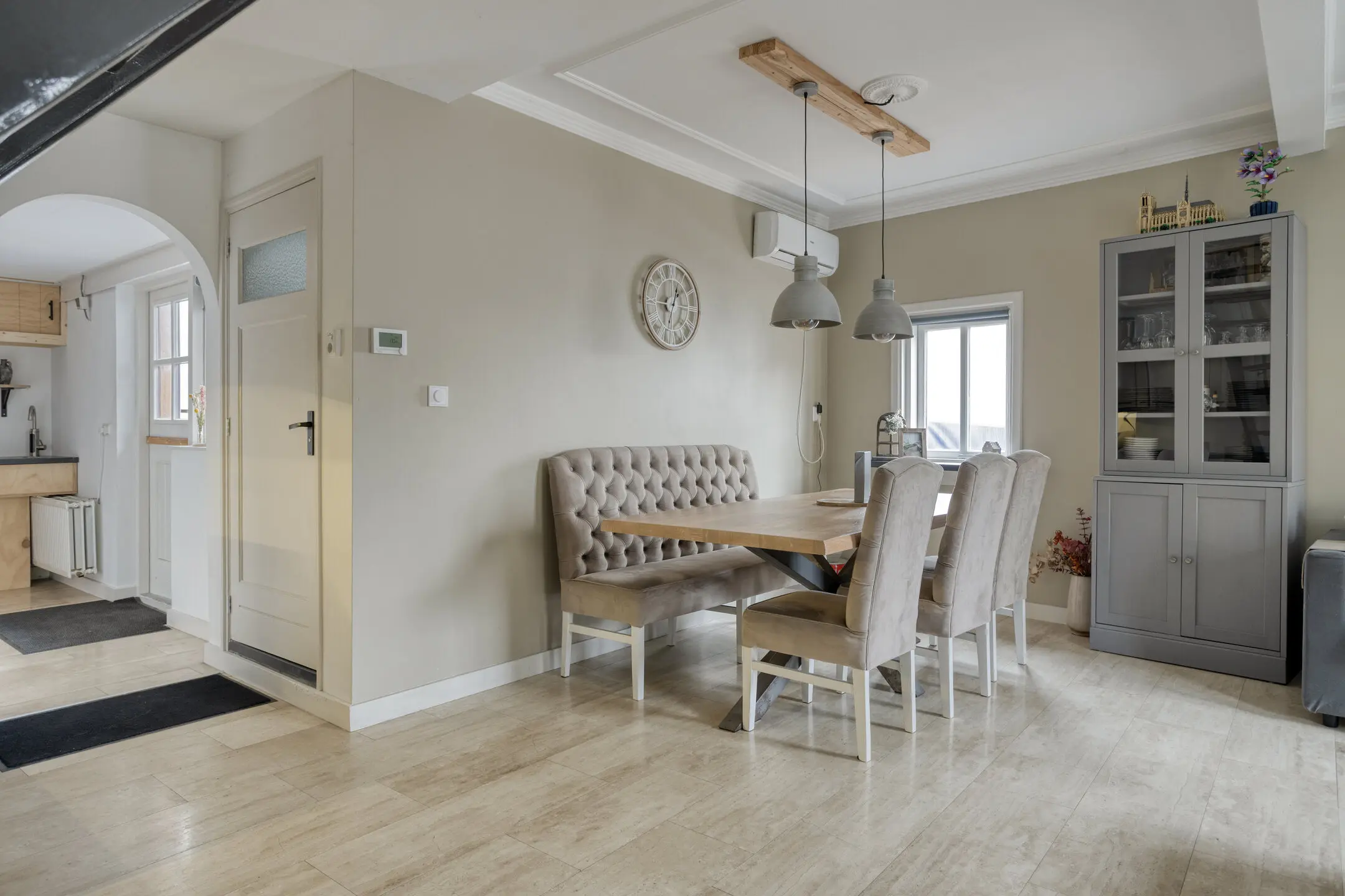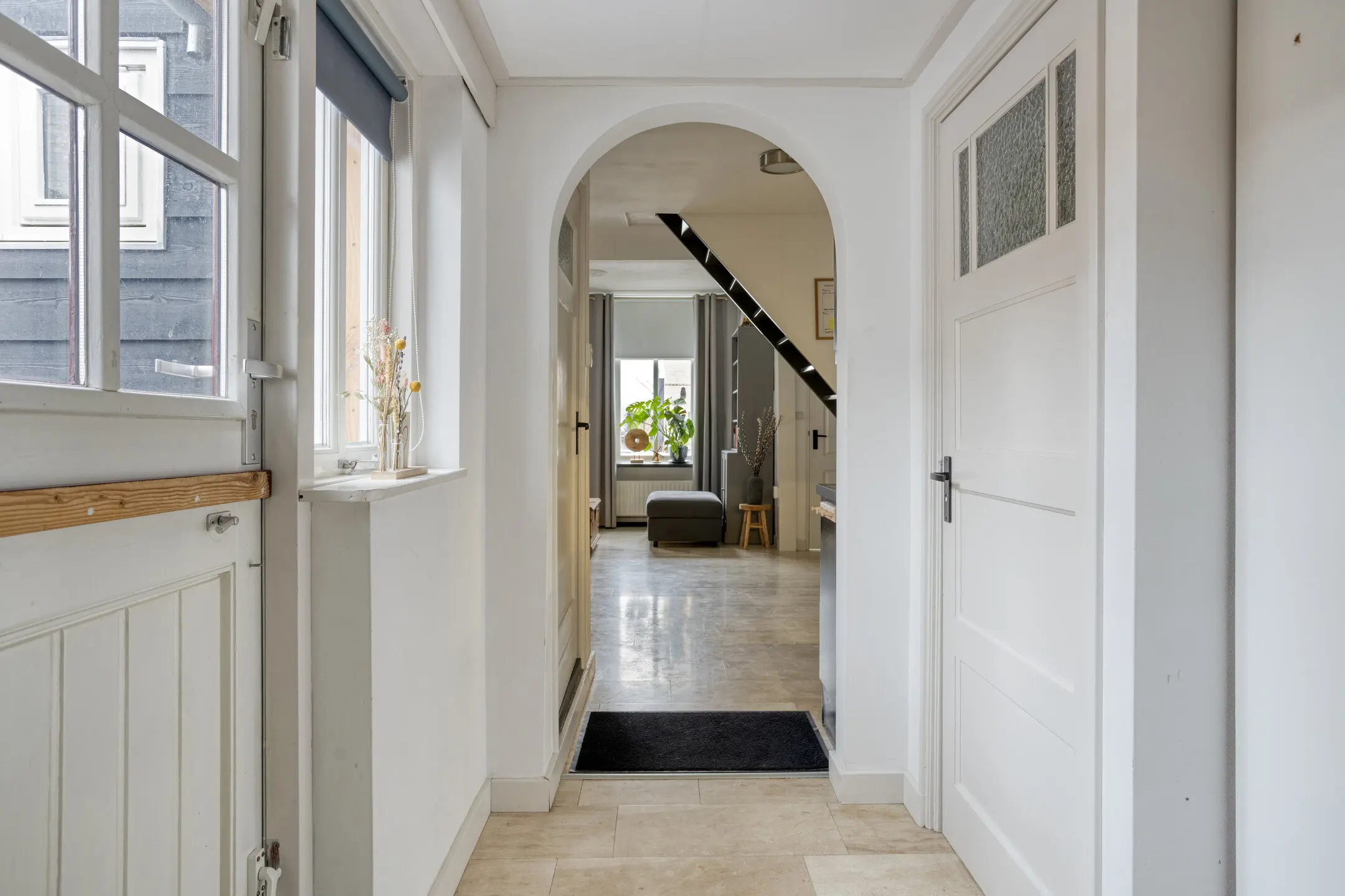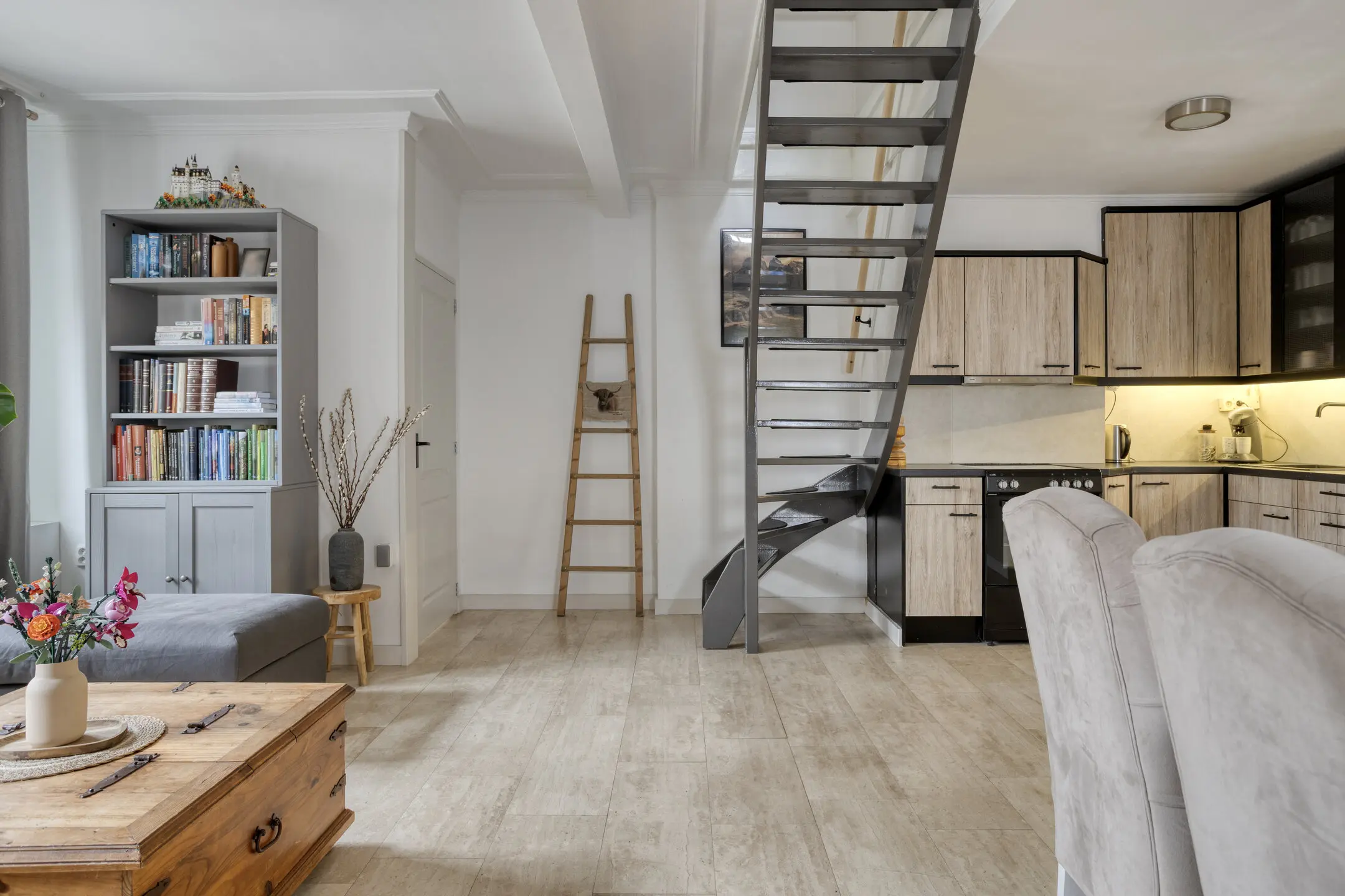 entreehal met meterkast en trapopgang; sfeervolle woonkamer met natuurstenen vloer en airco; keuken in hoekopstelling voorzien van diverse nieuwe inbouwapparatuur waaronder een oven, elektrische kookplaat en afzuigkap; badkamer met douche, wastafelmeubel en designradiator; bijkeuken met vaste kast waarin witgoedaansluiting en wasbak, toiletruimte en toegang tot achterplaats. Boven de bijkeuken bevindt zich een bergzolder.